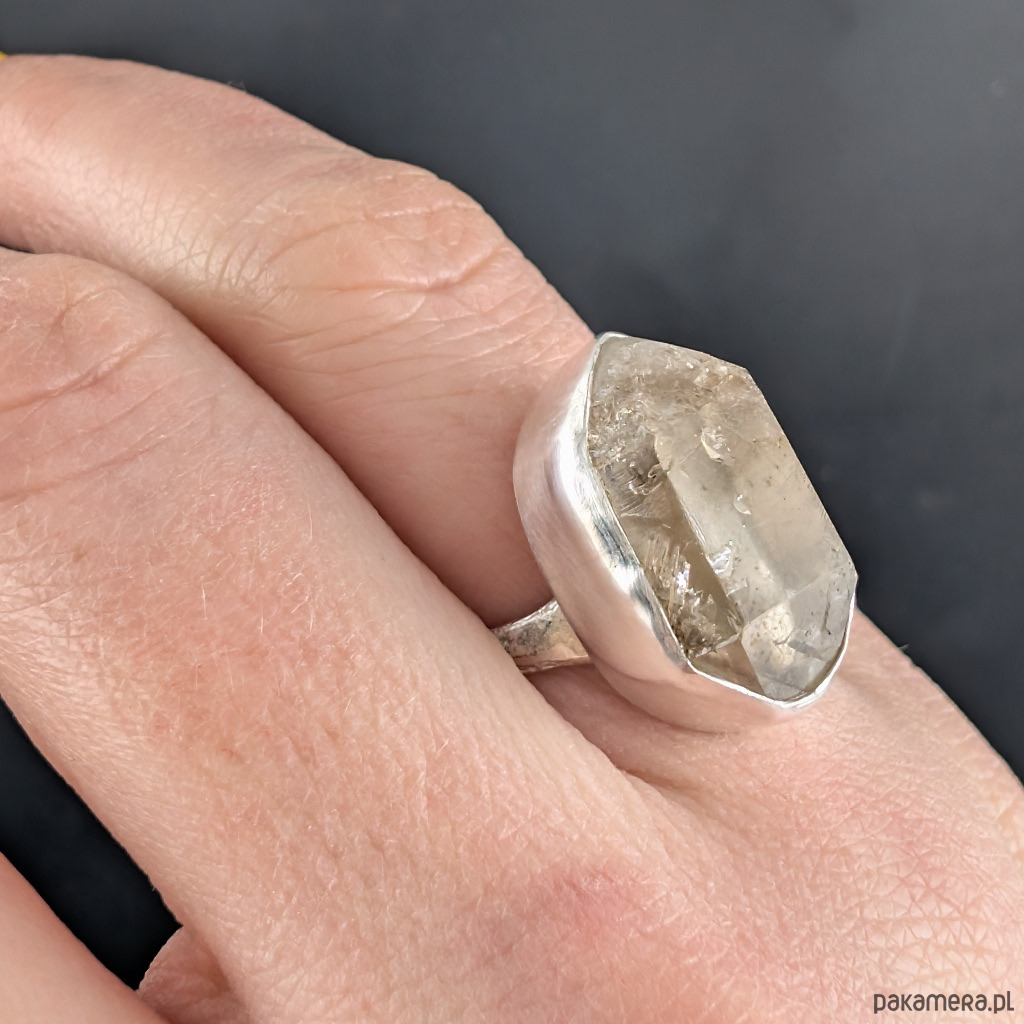 Pierścionek z oprawionym w srebro pr. 925 pięknym kwarcem zakupionym bezpośrednio od górników podczas wyprawy do Afryki (Namibia). Oprawa kamienia 21 x 12 mm, Waga 8,4 g. Rozmiar jubilerski 14, mogę powiększyć do max 15. Obrączka ma 5 mm szerokości, asymetryczna,falowana. Pierścionek w ozdobnym pudełeczku.