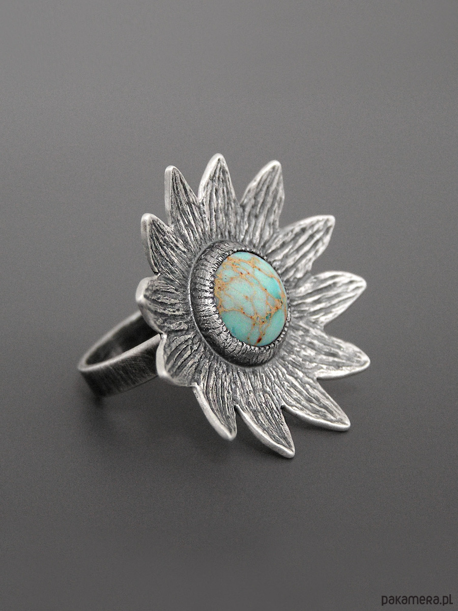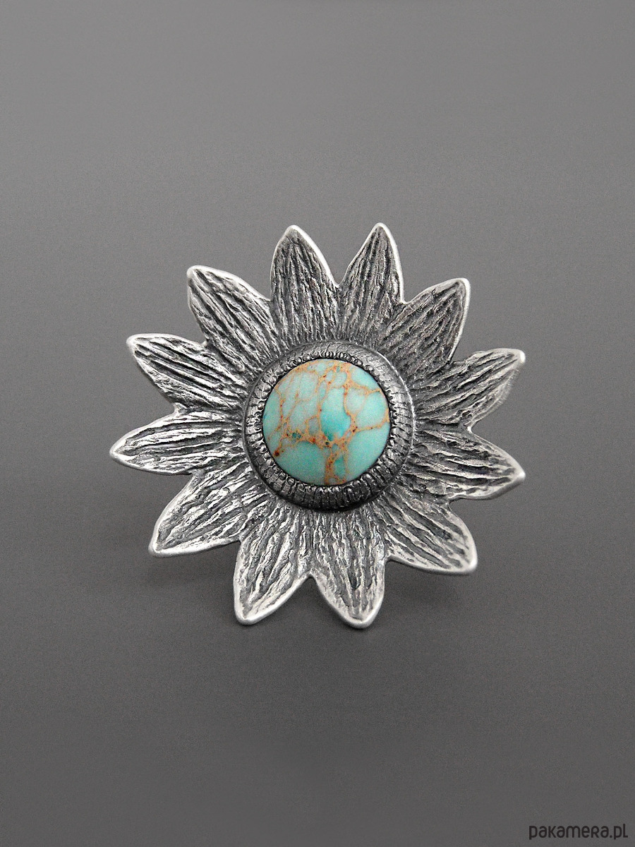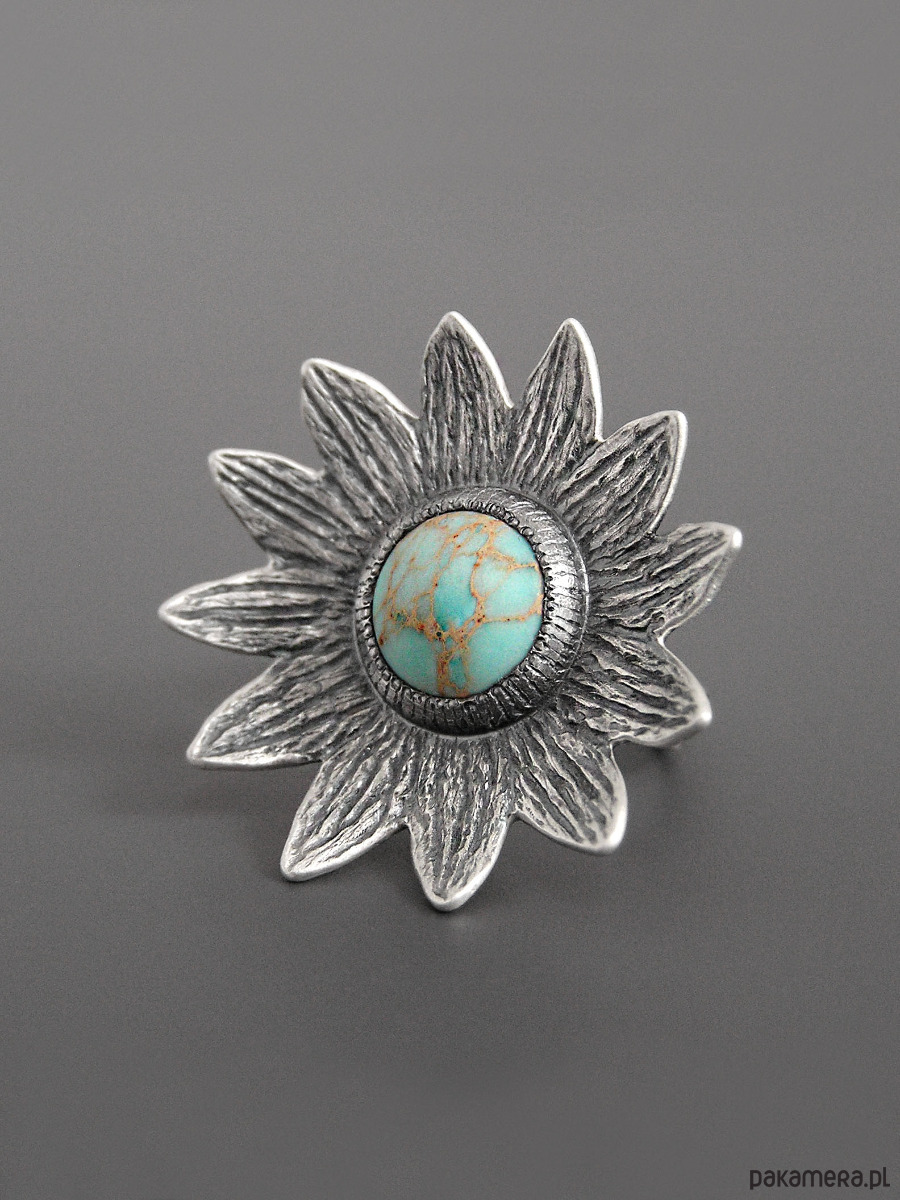 Unikatowy duży pierścionek- kwiat z Jaspisem oceanicznym- wykonany ze srebra 925. Patynowany i szczotkowany.