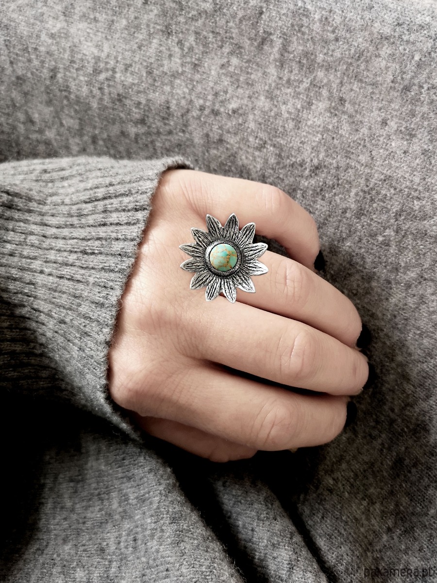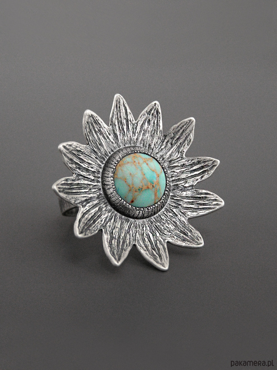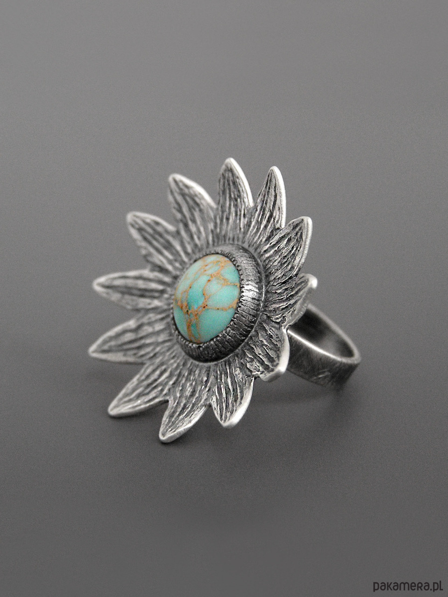 Unikatowy duży pierścionek- kwiat z Jaspisem oceanicznym- wykonany ze srebra 925. Patynowany i szczotkowany.
