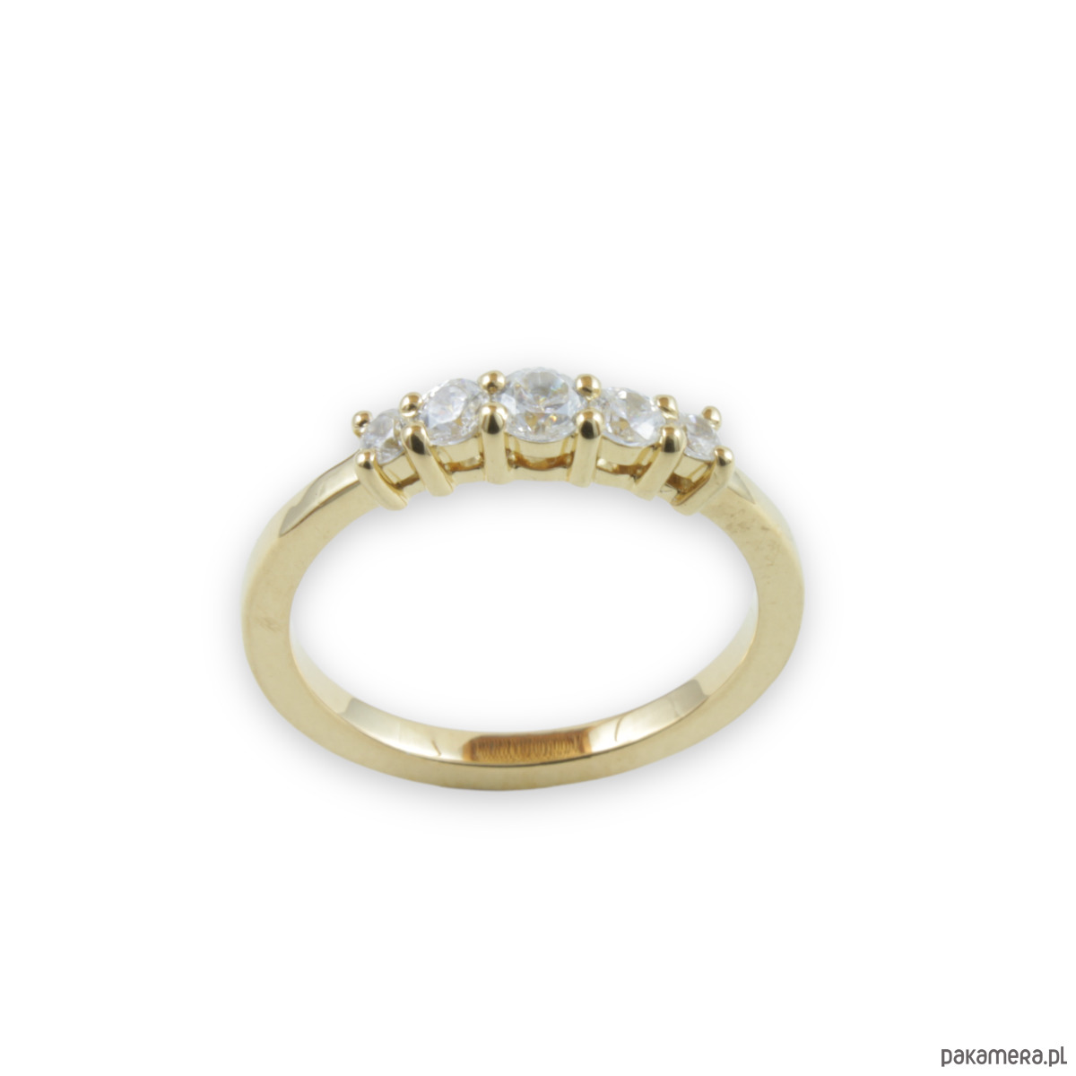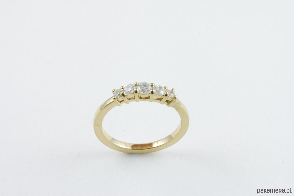 Pierścionek wykonany z żółtego złota próby 0,750 (18k) oraz pięciu białych, naturalnych brylantów o stopniowanej wielkości i masie całkowitej ok. 0,25 - 0,28 ct. Kamienie czystości VS, barwy G.
