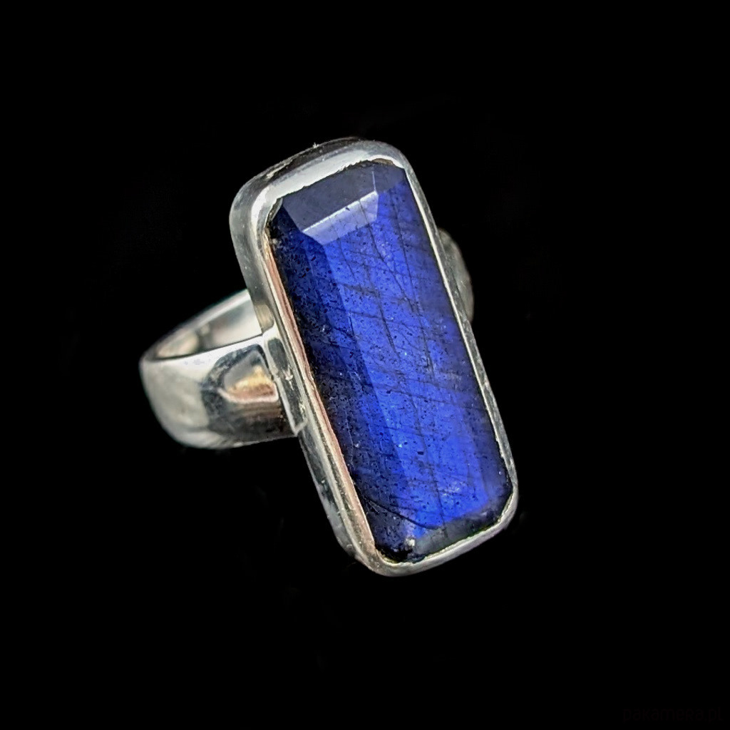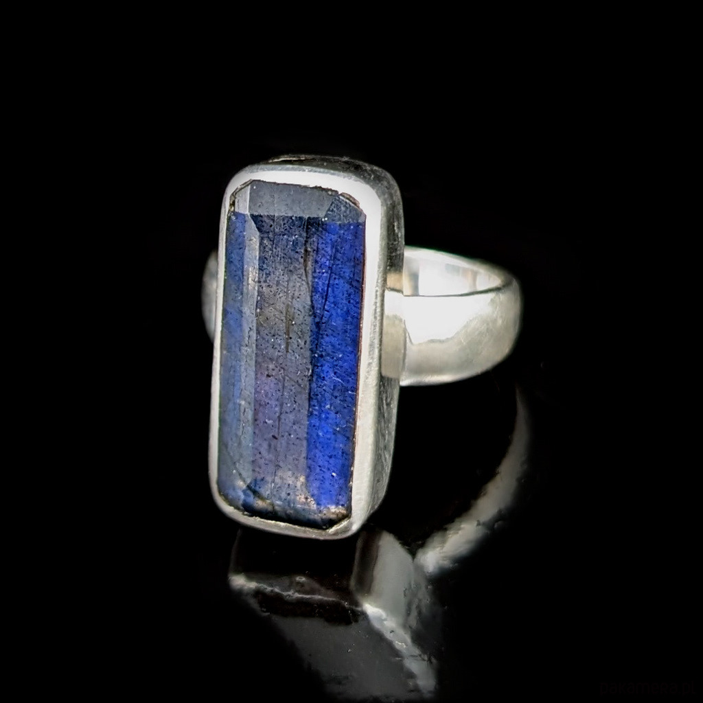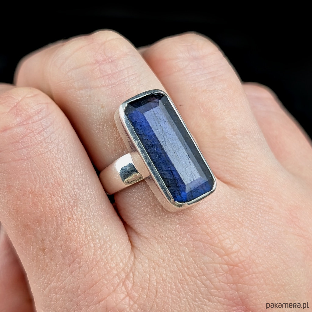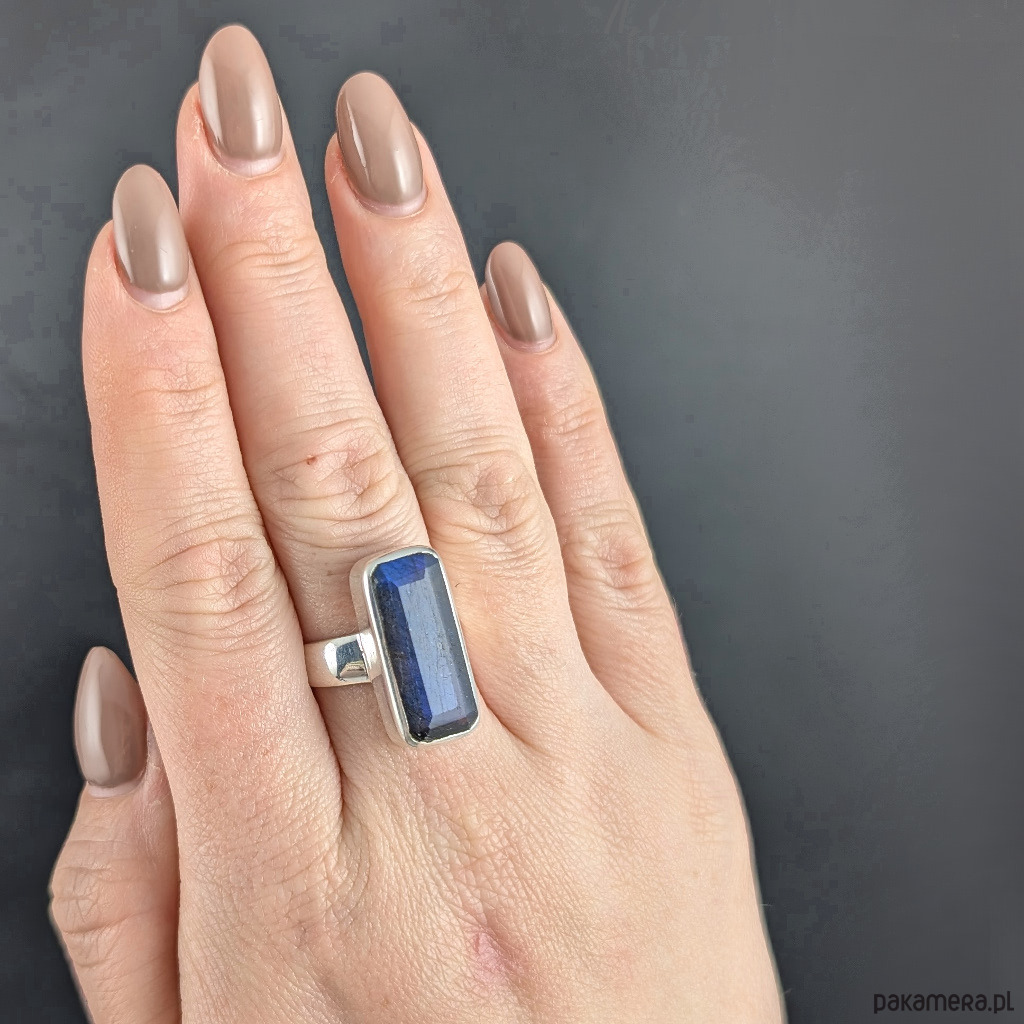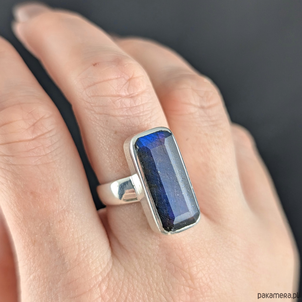 Pierścień z oprawionym własnoręcznie w srebro próby 925 naturalnym labradorytem o przepięknej, niebieskiej tafli. Rozmiar jubilerski 18, bez możliwości zmiany rozmiaru. Wymiary całej oprawy 24 x 11 mm. Obrączka zwężana ma max.6 mm szerokości. Waga 9,4 g. Pierścień zostanie zapakowany w ozdobne pudełeczko.