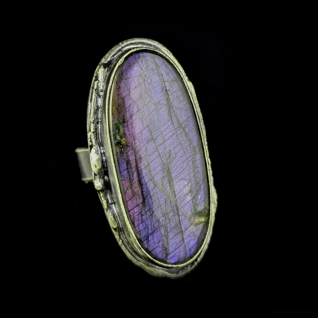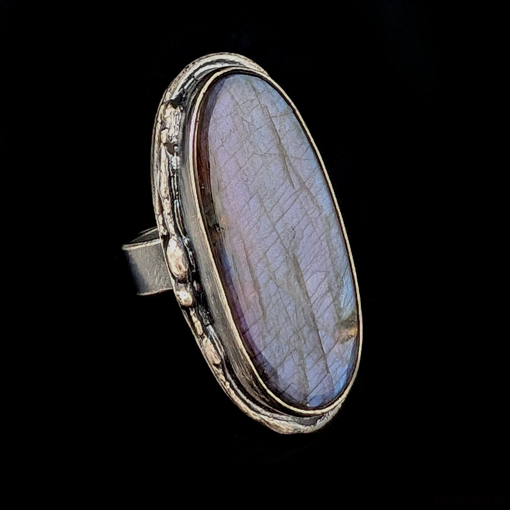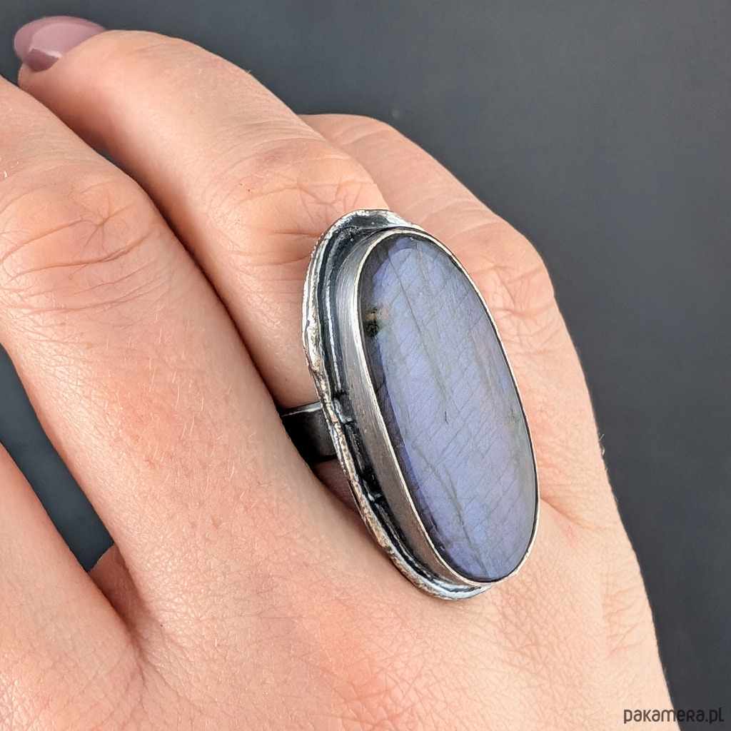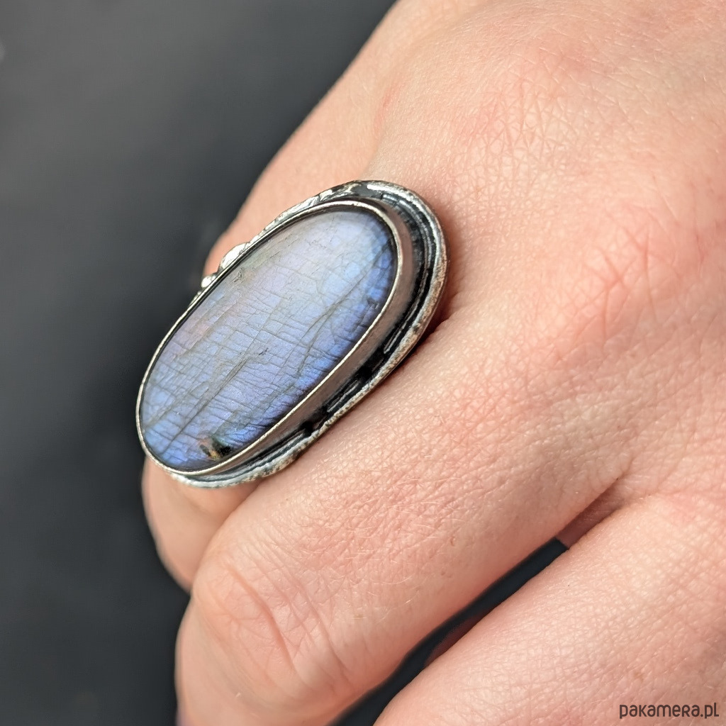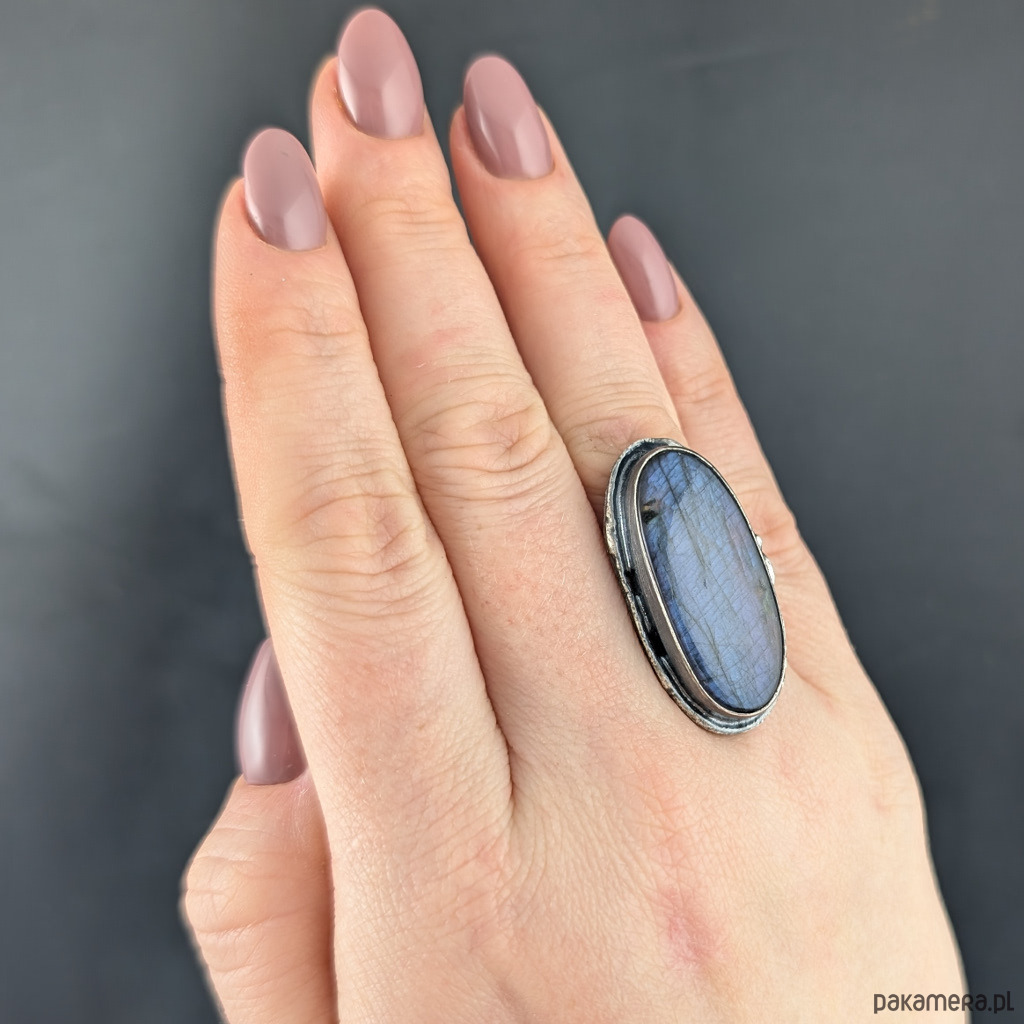 Pierścień wykonany z oksydowanego srebra próby 925 z oprawionym labradorytem o pięknej labradoryzacji niebieskości i fioletu. Wymiary 35 x 18 mm, rozmiar jubilerski 14, mogę powiększyć na max 18, obrączka ma 5 mm szerokości. Waga 16 gramów. Zapakowany w ozdobne pudełeczko.