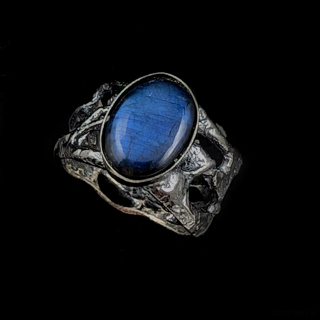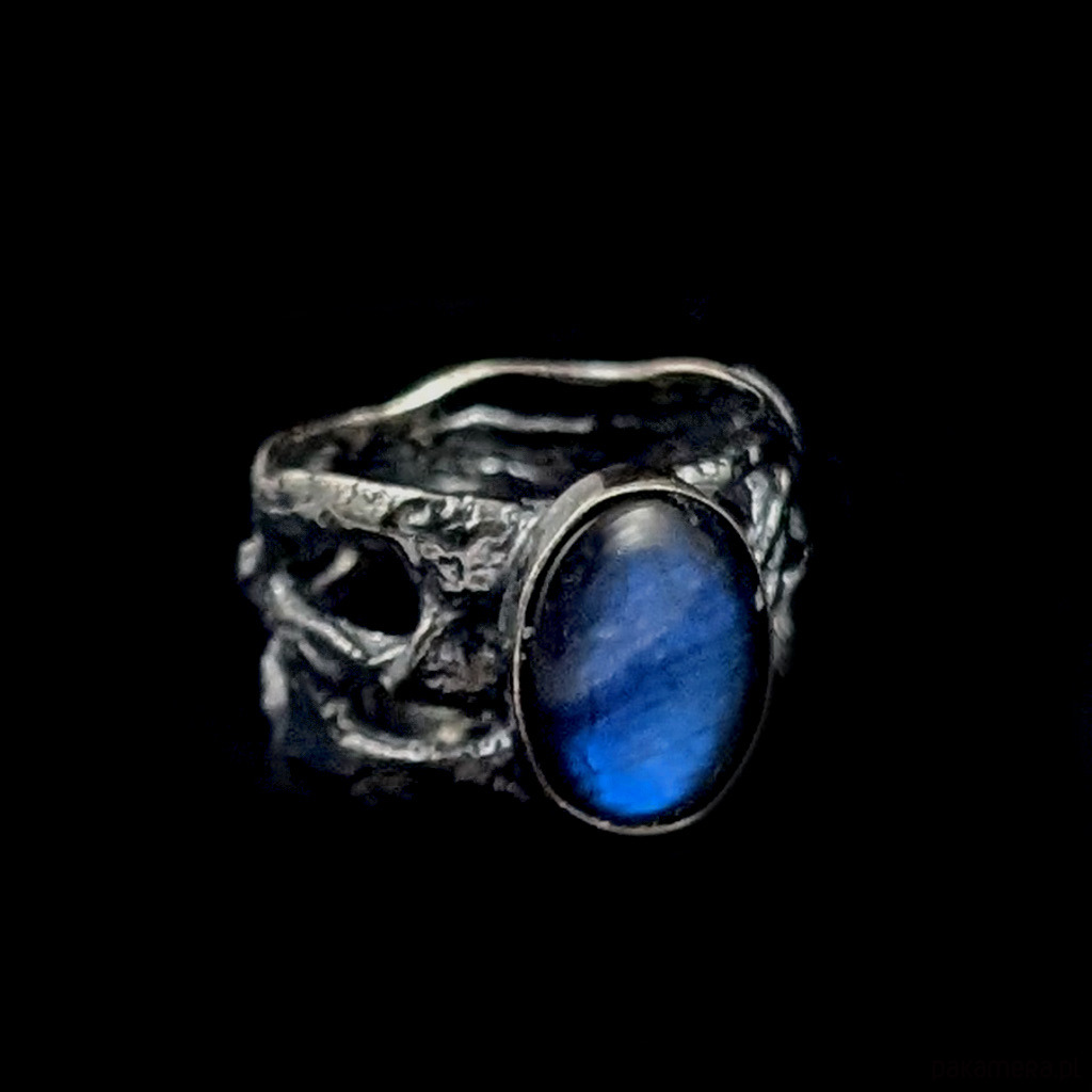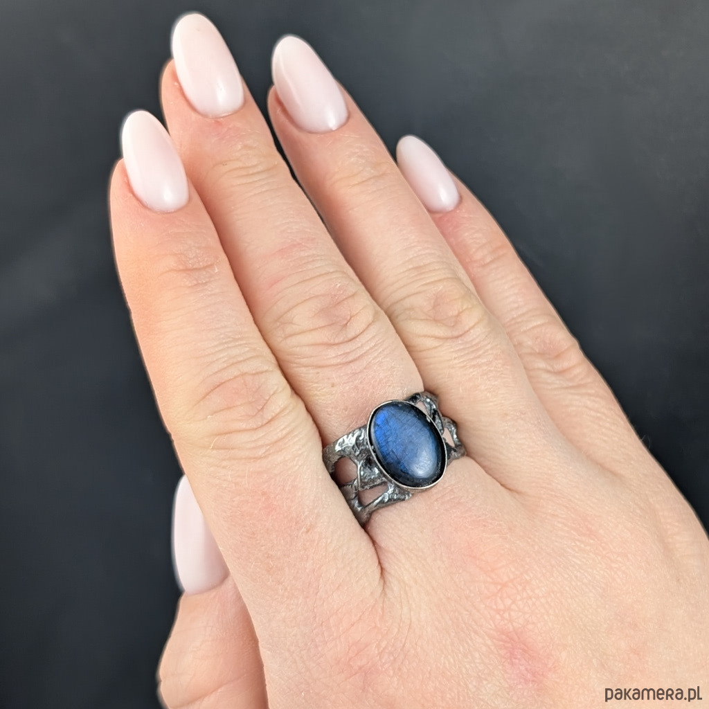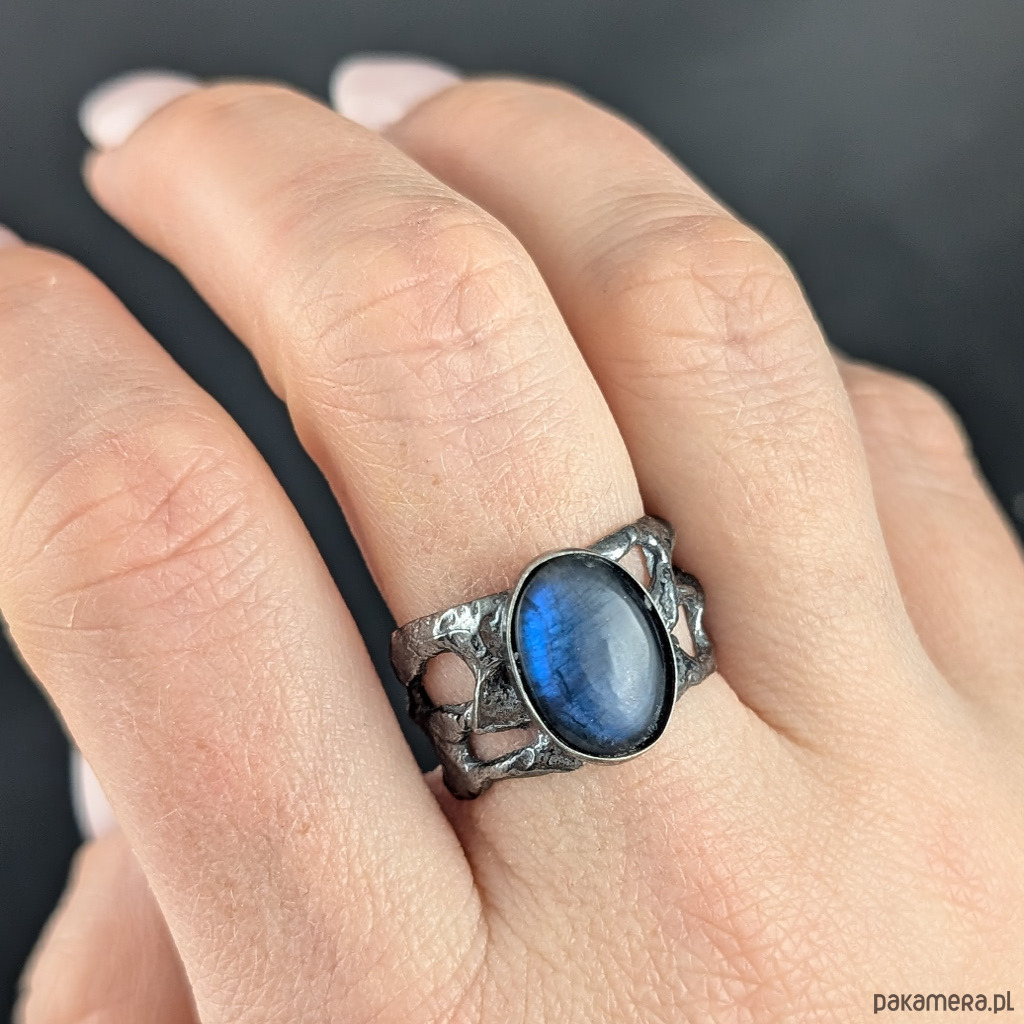 Pierścionek wykonany z oksydowanego srebra pr 925 oraz pięknego labradorytu. Rozmiar obrączki 19, mogę powięszyć na max 20, proszę napisać na jaki ustawić. Oprawa 15 x 11 mm. Waga 7 g.