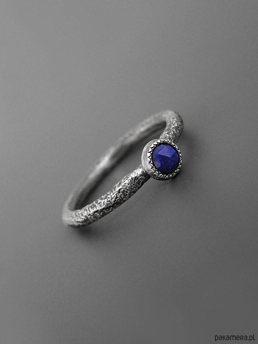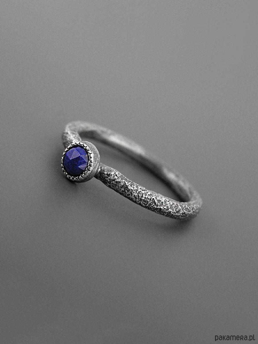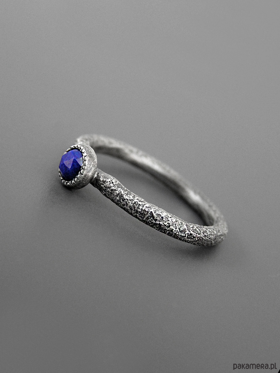 Unikatowy surowy pierścionek z Lapis Lazuli - wykonany z flamowanego srebra 925. Patynowany i szczotkowany.