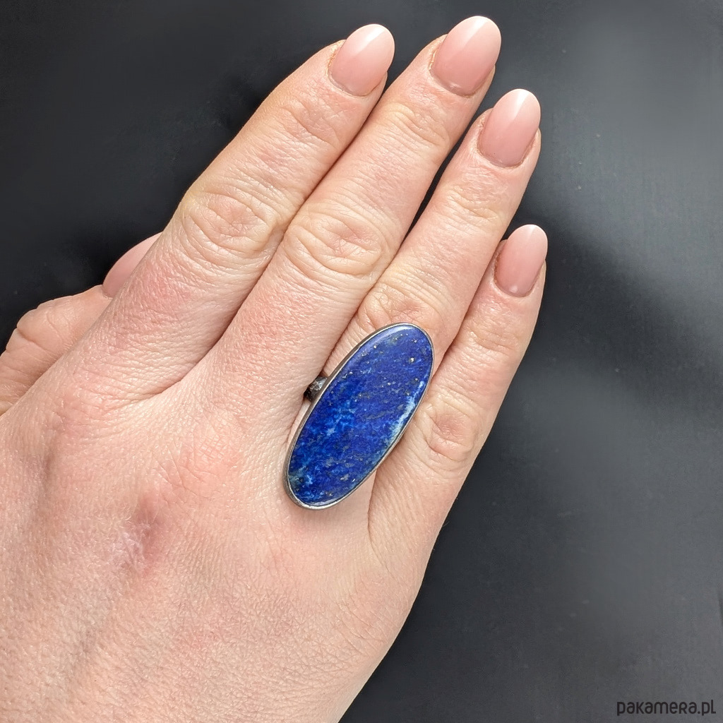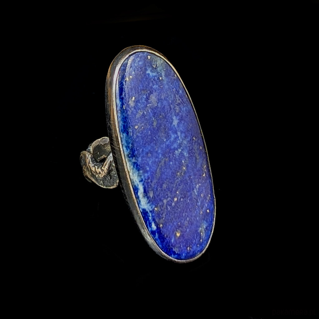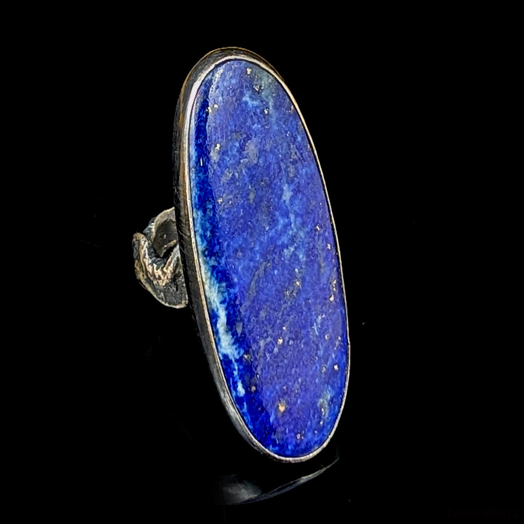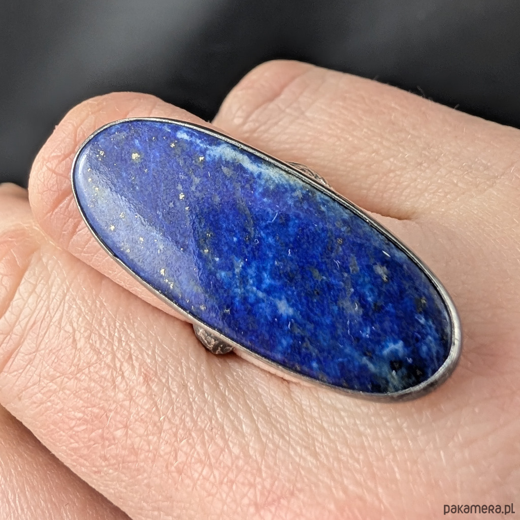 Okazały pierścień z lapisem lazuli oprawionym w oksydowane srebro próby 925. Kamień zawiera liczne inkluzje połyskującego pirytu, pożądanego zjawiska w tym minerale. Piękny, smukły kształt. Wymiary całej oprawy 36 x 16 mm. Waga 10.4 grama. Obrączka o szerokości 5 mm, asymetryczna, falowana. Rozmiar jubilerski 14. Pierścień zostanie zapakowany w ozdobne pudełeczko.