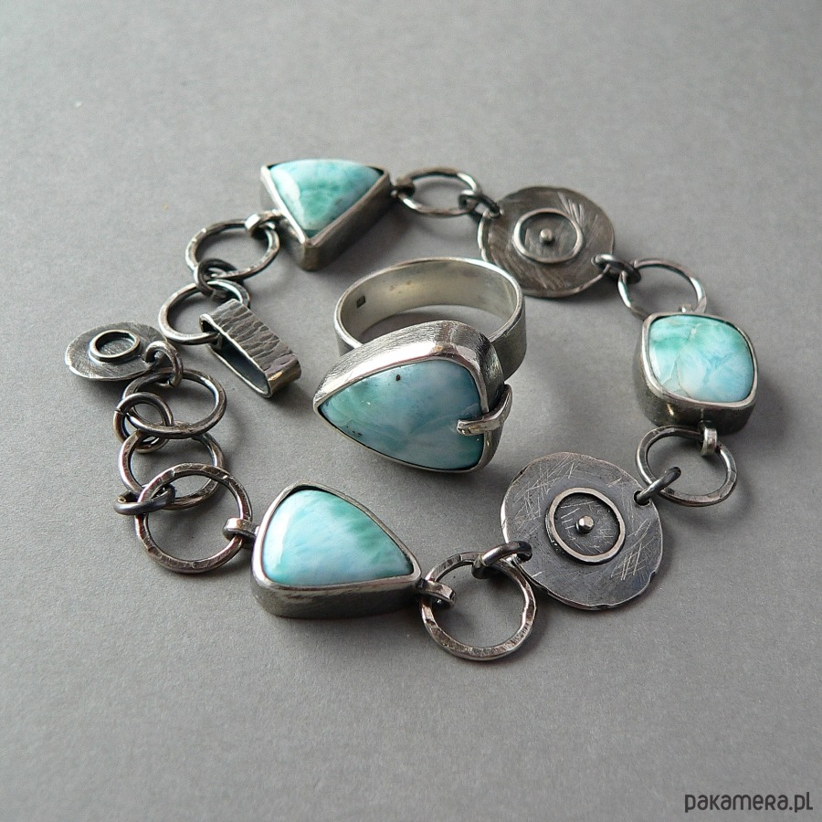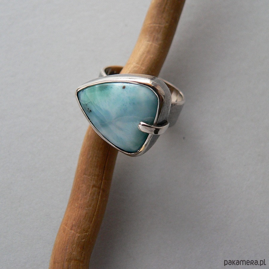 Prosty w formie pierścionek wykonany od podstaw ręcznie ze srebra, zdobiony naturalnym larimarem. Srebro pokryte wyraźną fakturą, oksydowane i polerowane. Wymiary kamienia- 2/1,6 cm Obrączka otwarta, rozmiar wyjściowy 16, możliwość powiększenia o 1-2 rozmiary.