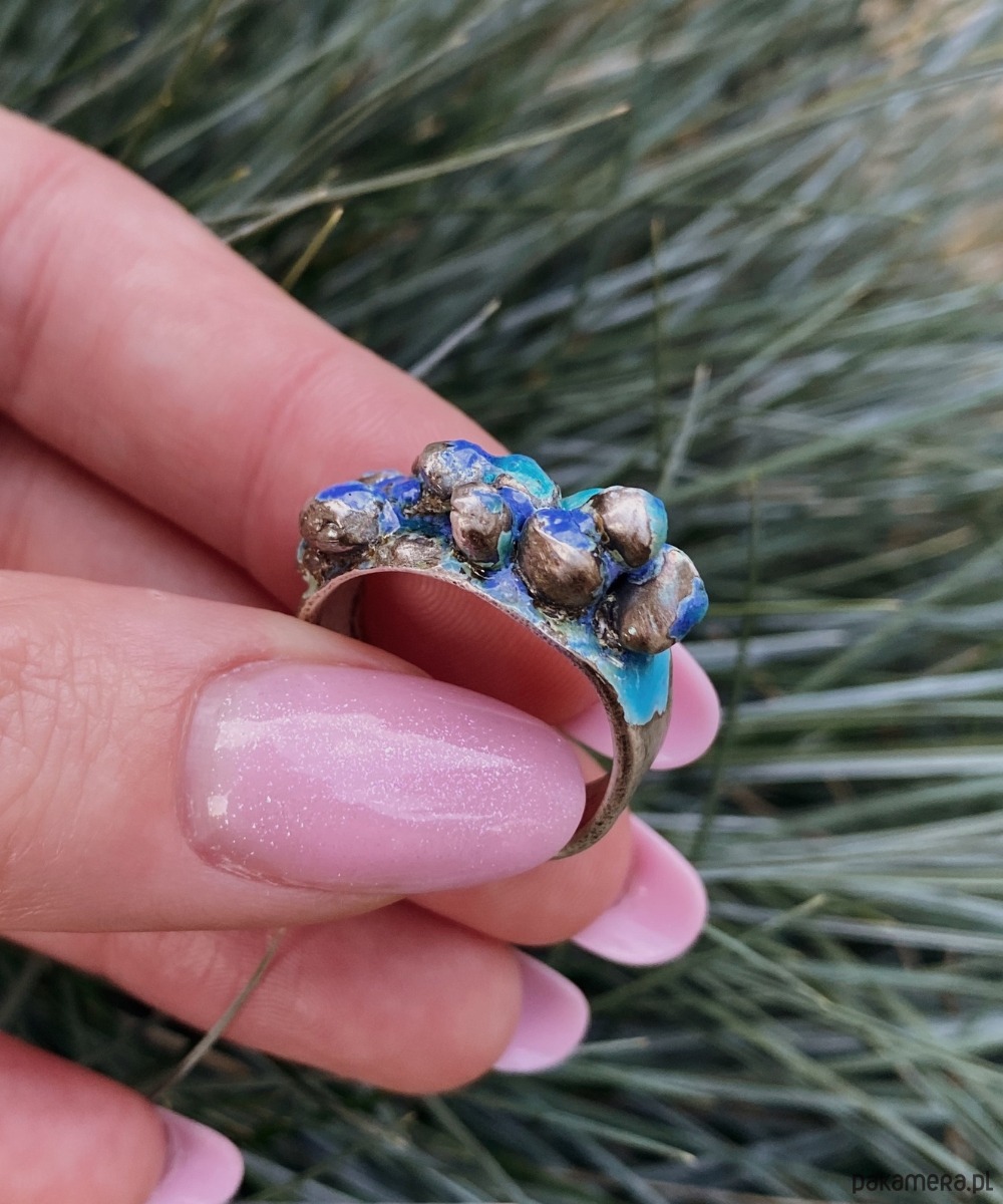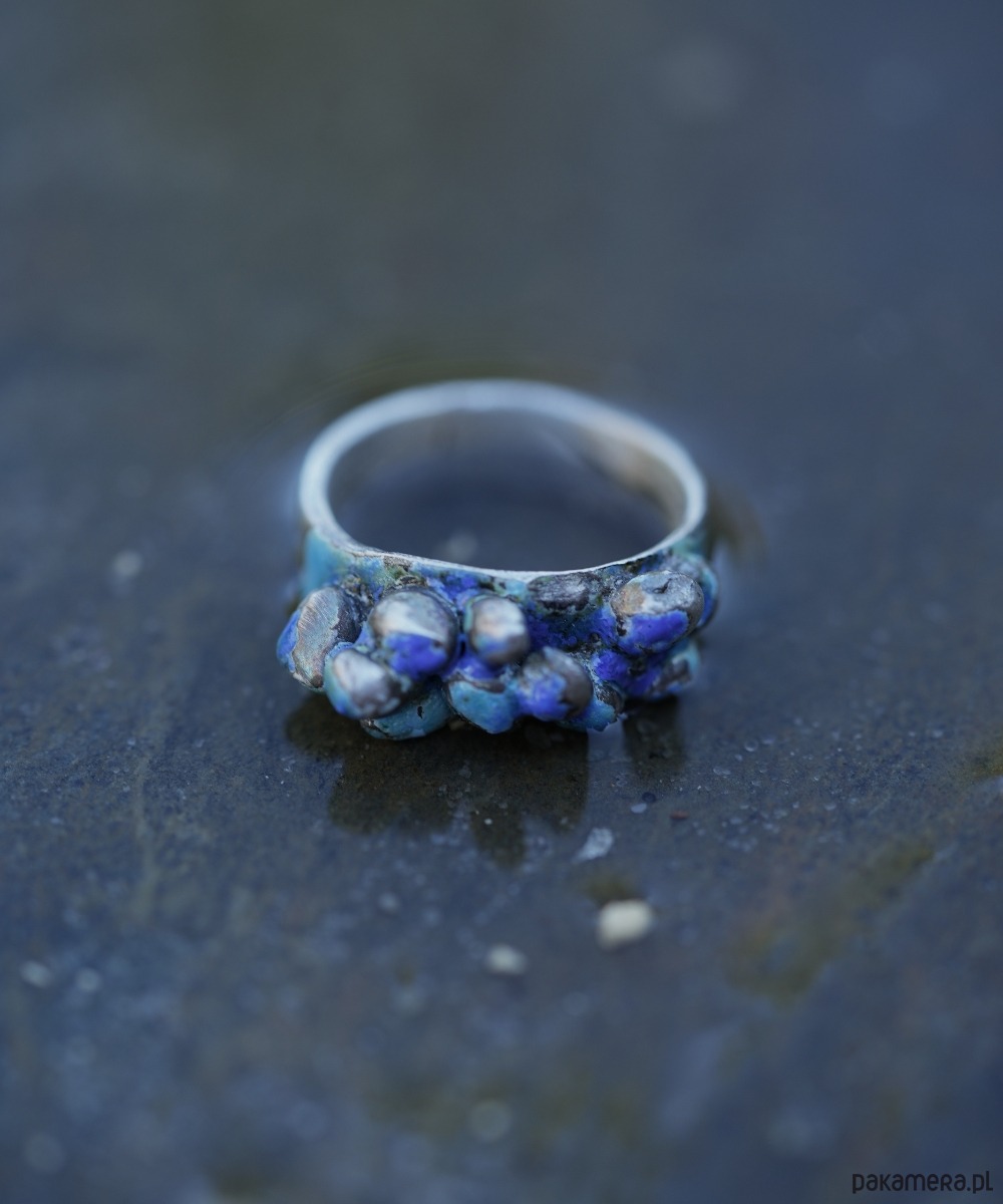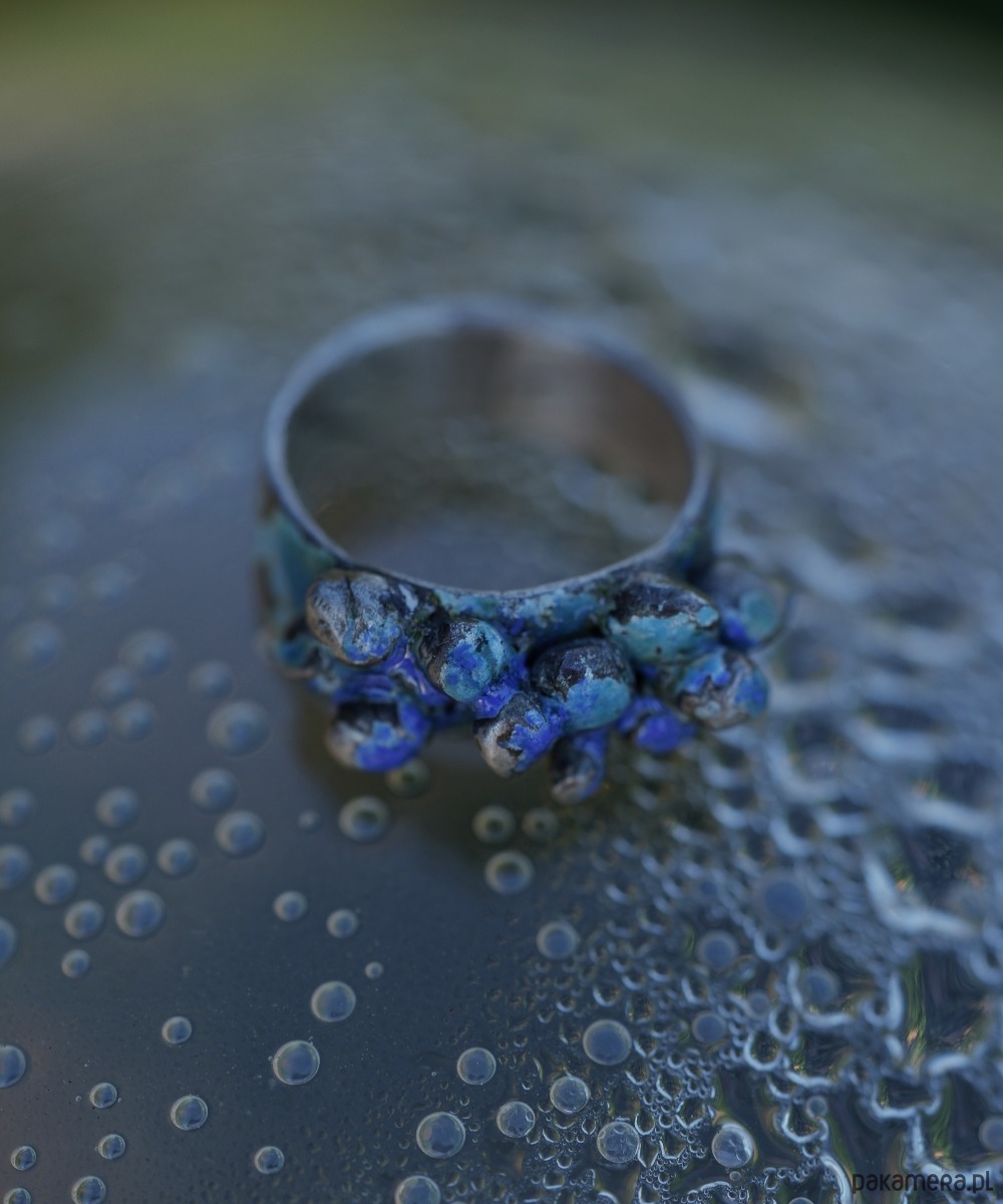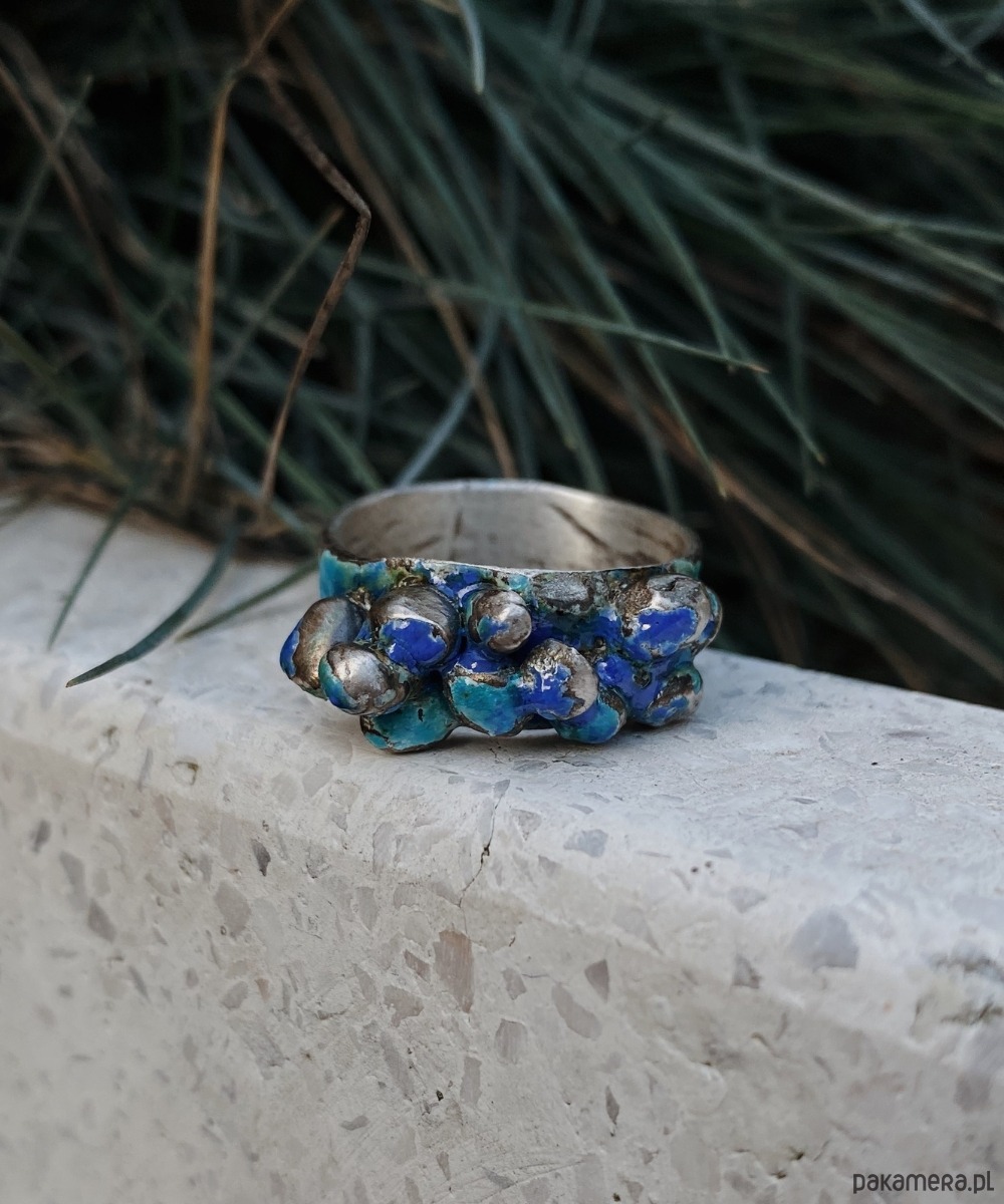 Pierścień wykonany ręcznie ze srebra, z kuleczkami o zróżnicowanych rozmiarach, które nakładają się na siebie, tworząc dynamiczną kompozycję. Każda kuleczka jest pokryta emalią w odcieniach niebieskiego, które płynnie przechodzą między sobą, tworząc efekt subtelnych kontrastów. Wyglądają jak drobne krople wody, które łapią światło, tworząc unikalną grę barw i kształtów.
