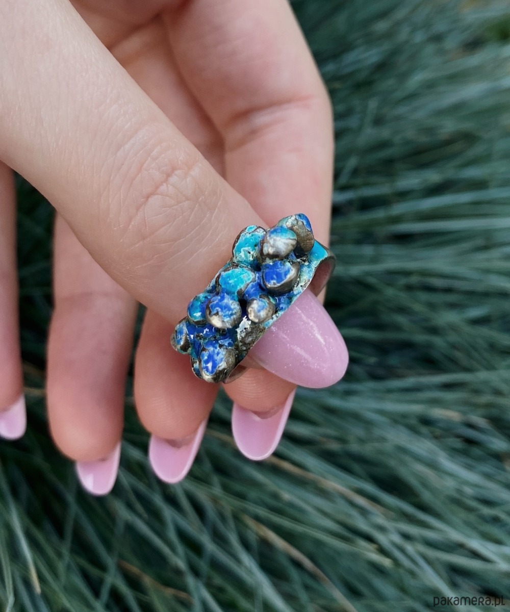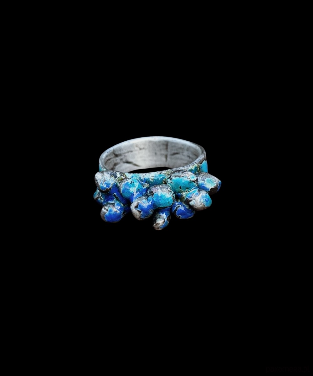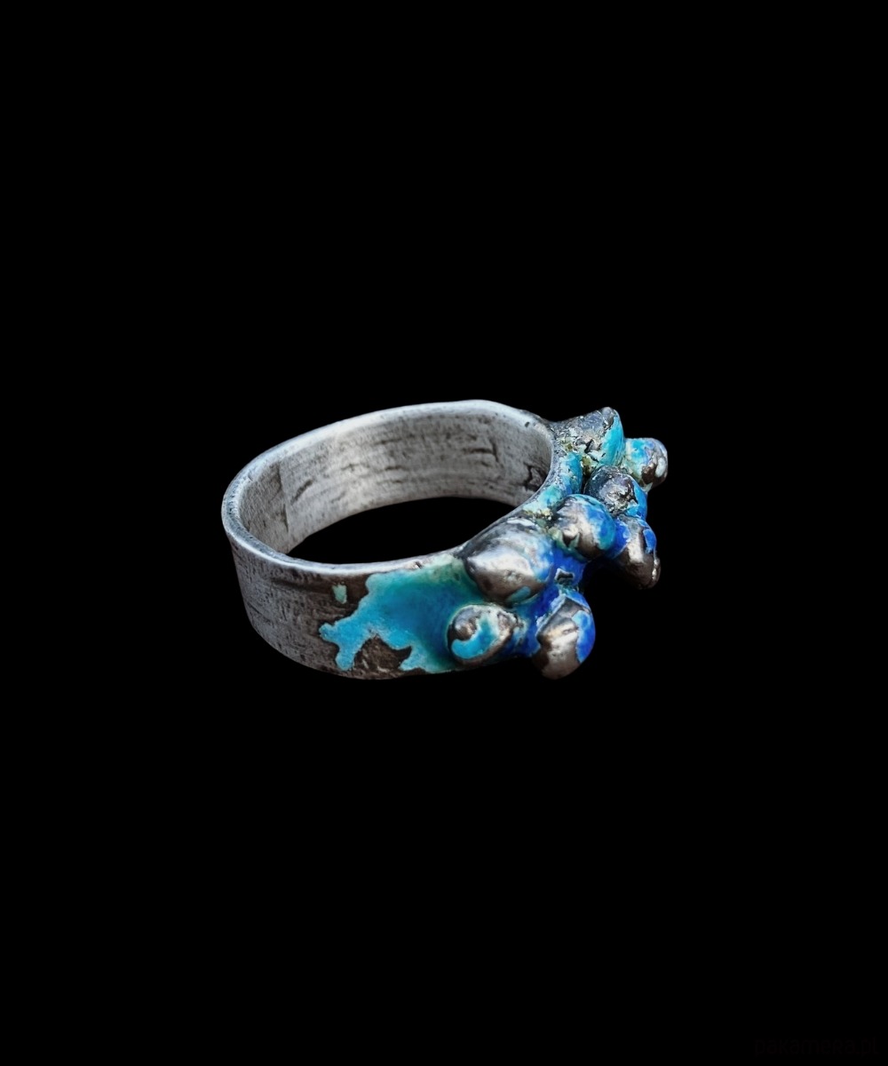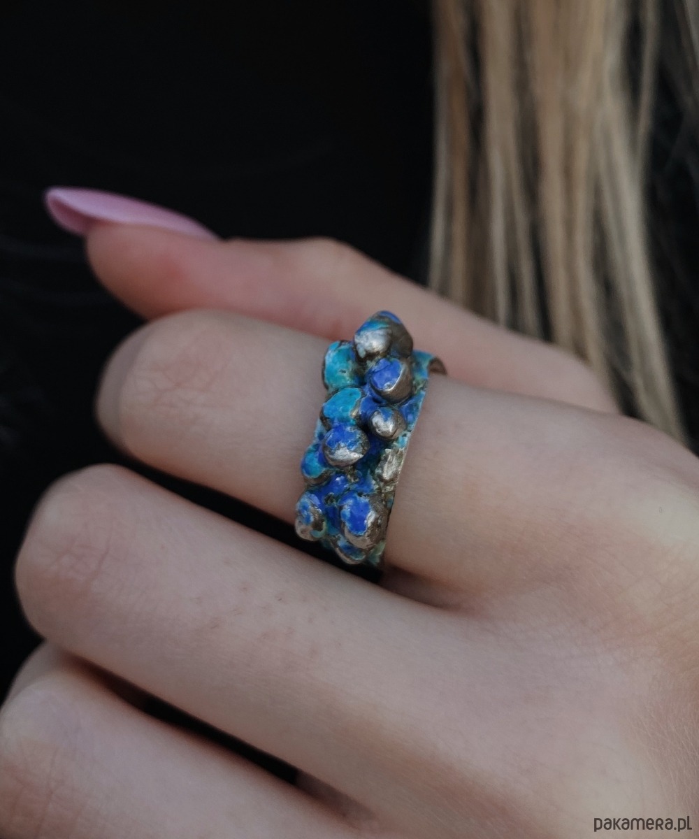 Pierścień wykonany ręcznie ze srebra, z kuleczkami o zróżnicowanych rozmiarach, które nakładają się na siebie, tworząc dynamiczną kompozycję. Każda kuleczka jest pokryta emalią w odcieniach niebieskiego, które płynnie przechodzą między sobą, tworząc efekt subtelnych kontrastów. Wyglądają jak drobne krople wody, które łapią światło, tworząc unikalną grę barw i kształtów.