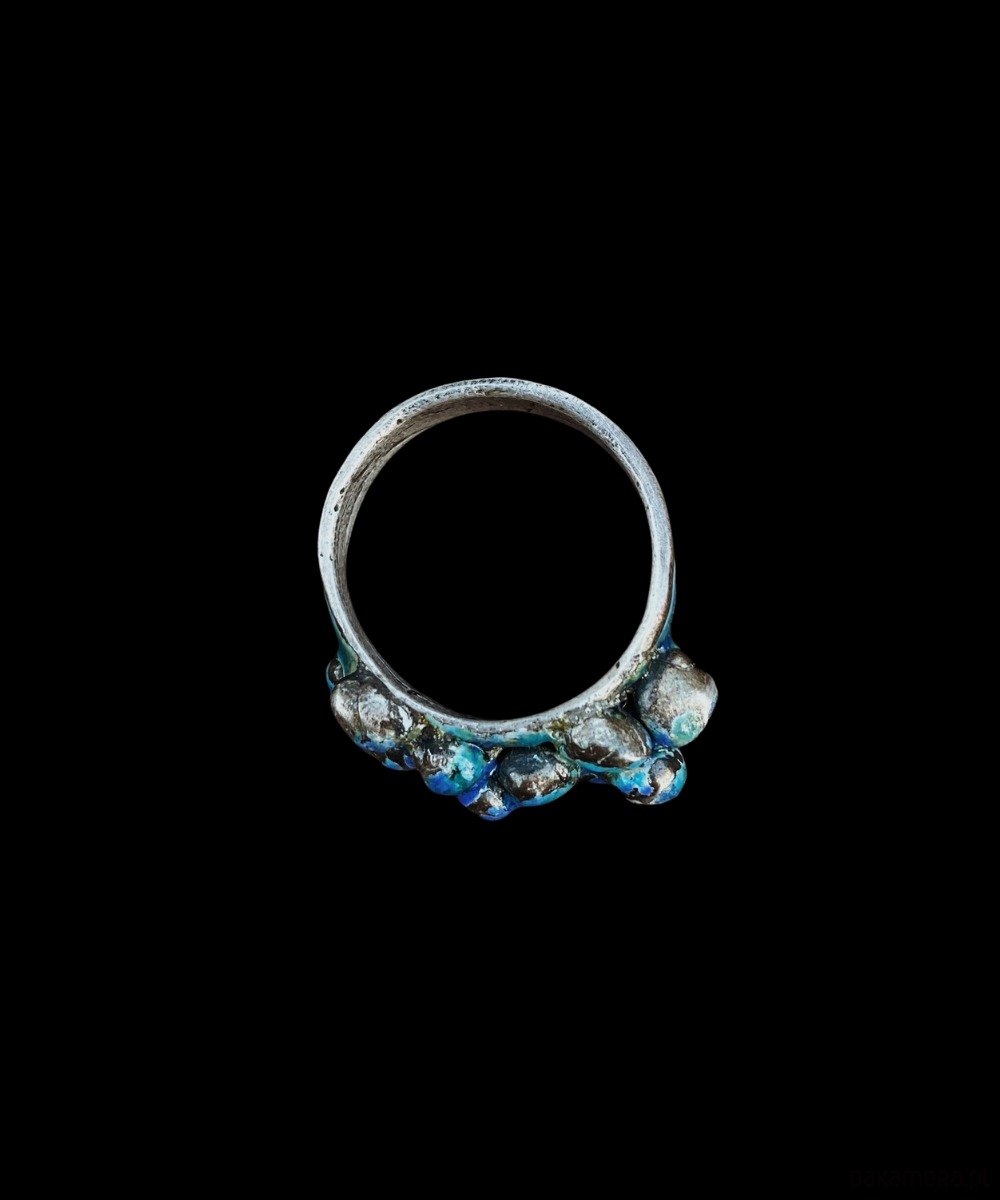 The ring is handmade of silver, with balls of varying sizes that overlap to create a dynamic composition. Each ball is covered with enamel in shades of blue, which flow seamlessly between each other, creating an effect of subtle contrasts. They look like tiny drops of water that catch the light, creating a unique play of colors and shapes.