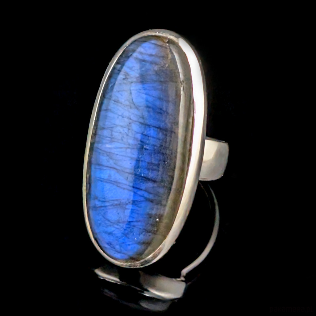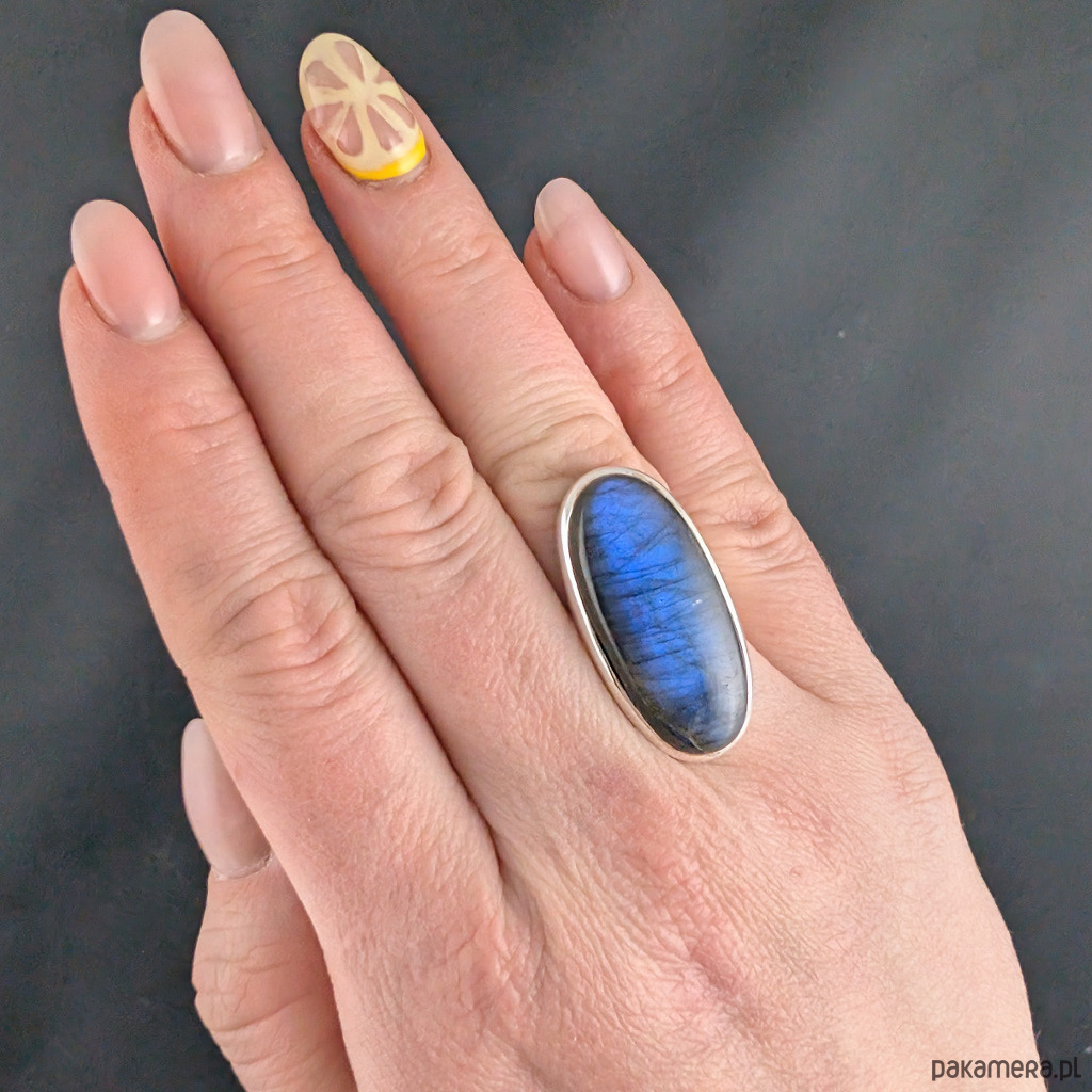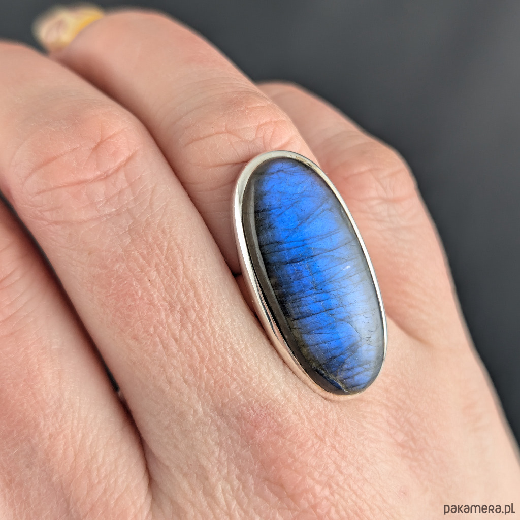 Pierścień z oprawionym w srebro próby 925 naturalnym labradorytem o przepięknej, niebieskiej tafli. Rozmiar jubilerski 14, bez możliwości zmiany rozmiaru. Wymiary całej oprawy 33 x 16 mm. Obrączka zwężana ma max.6 mm szerokości. Waga 10 g. Pierścień zostanie zapakowany w ozdobne pudełeczko. Wykonany przez dostawcę kamieni.