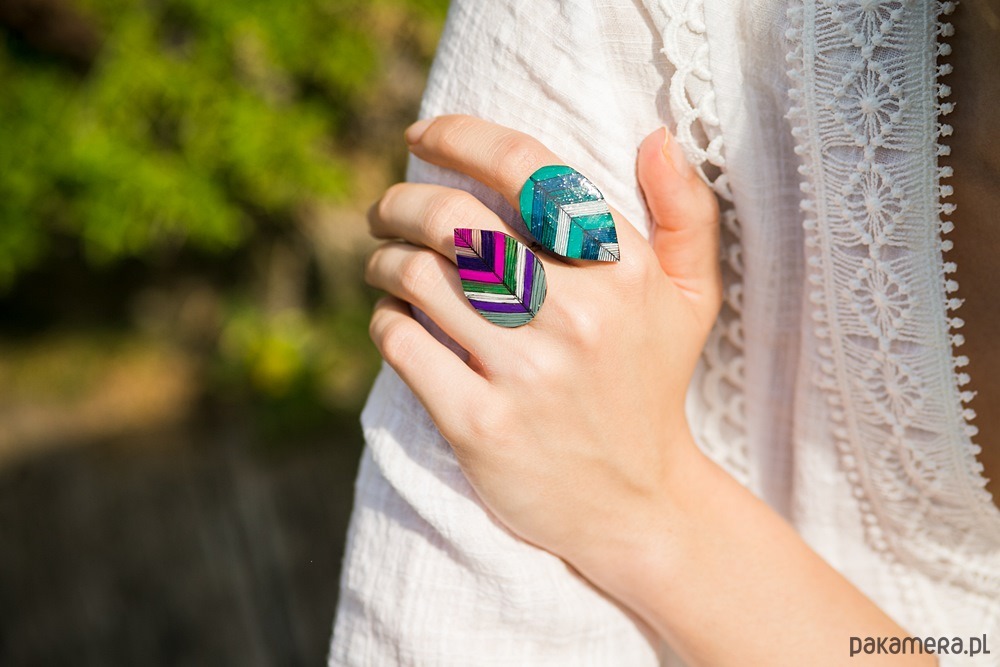 Słodki pierścionek listek, ręcznie rysowany na folii termokurczliwej i zabezpieczony lakierem ekologicznym.
