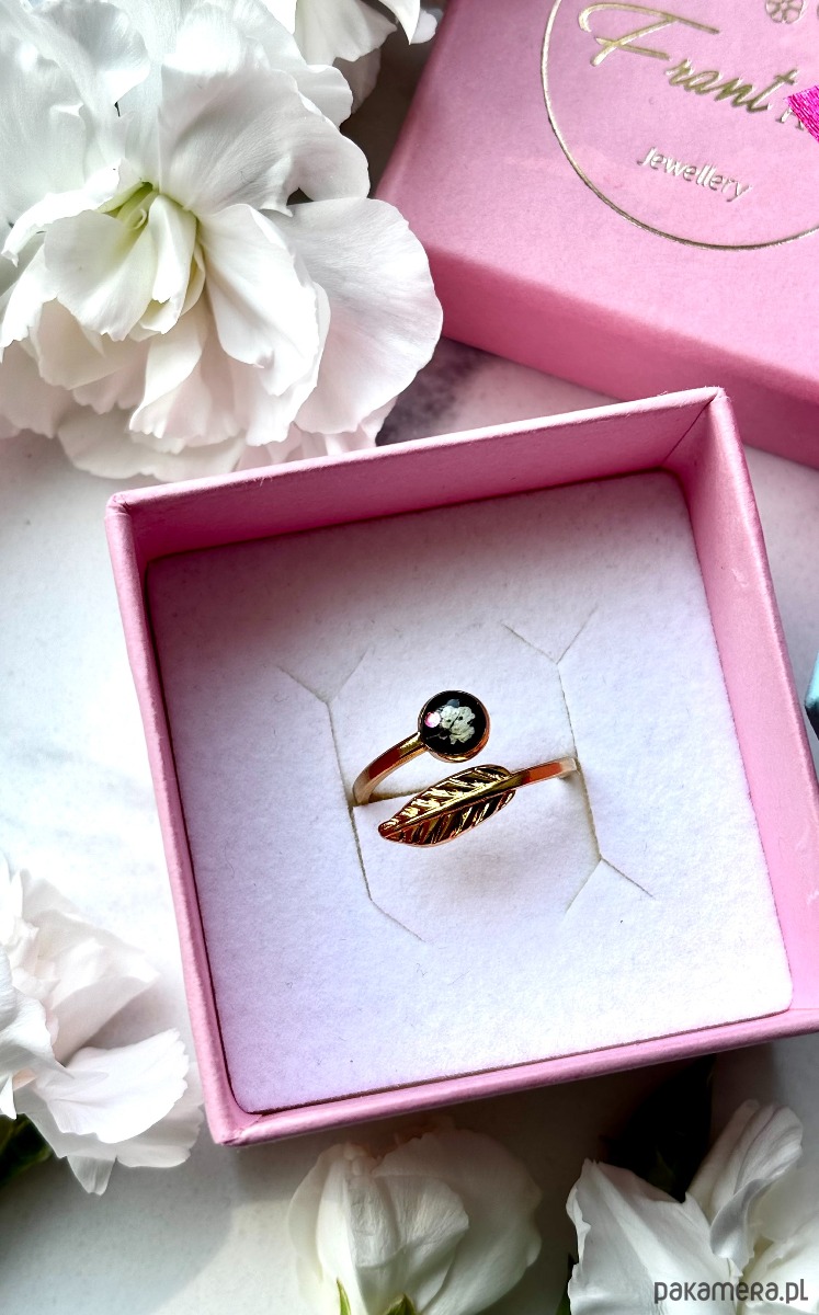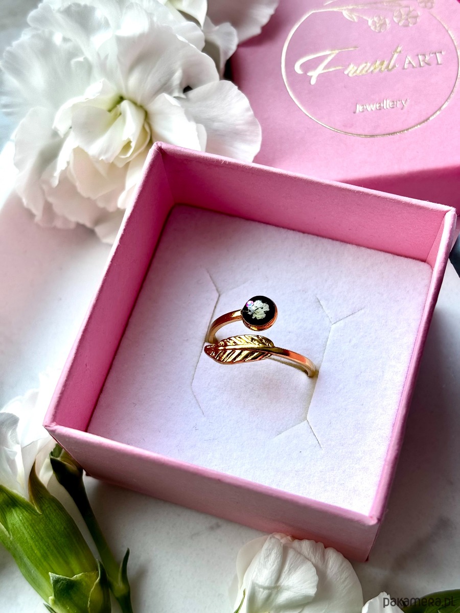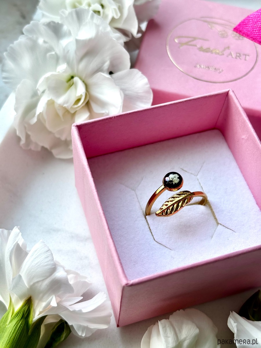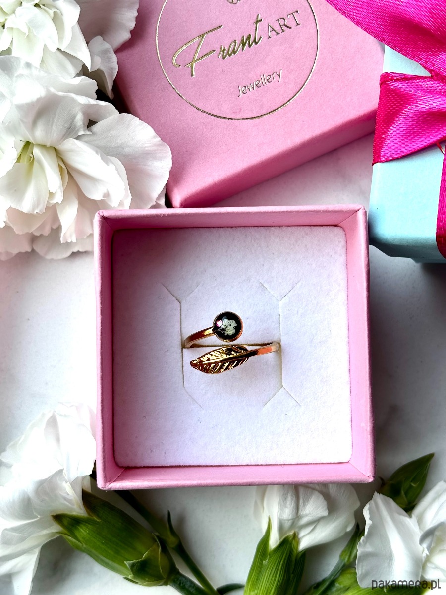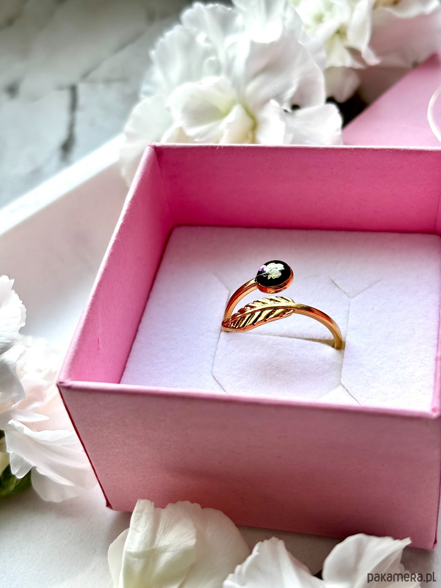 Ten wyjątkowy pierścionek z liściem to subtelne połączenie natury i elegancji. Delikatna, otwarta forma obrączki zakończona została dekoracyjnym motywem liścia oraz okrągłą kompozycją z prawdziwym, ręcznie suszonym kwiatem zatopionym w żywicy jubilerskiej. Kontrast głębokiej czerni tła z jasnym kwiatem dzikiej marchwi podkreśla jego naturalne piękno i nadaje pierścionkowi wyrazisty, ale wciąż minimalistyczny charakter. Regulowana obrączka zapewnia wygodne dopasowanie do palca, co czyni go idealnym wyborem na prezent – bez ryzyka nietrafionego rozmiaru.