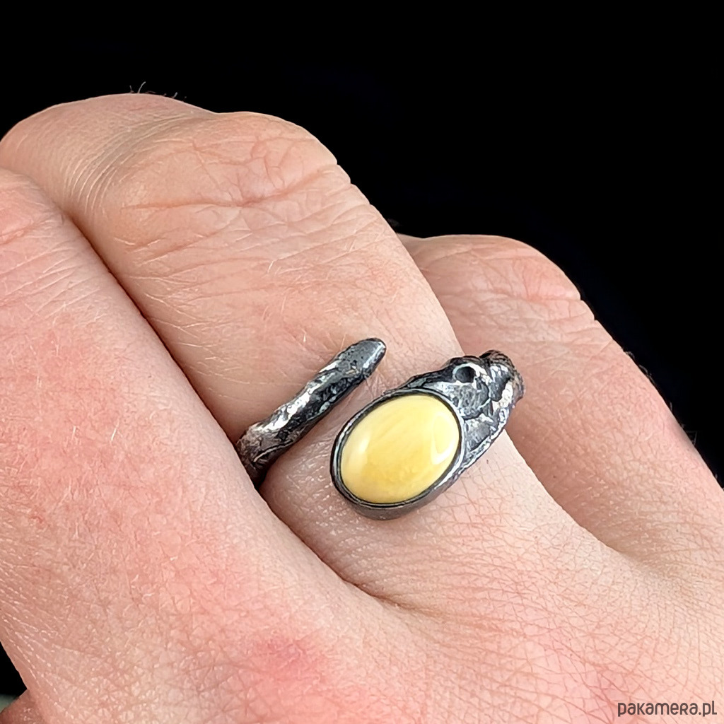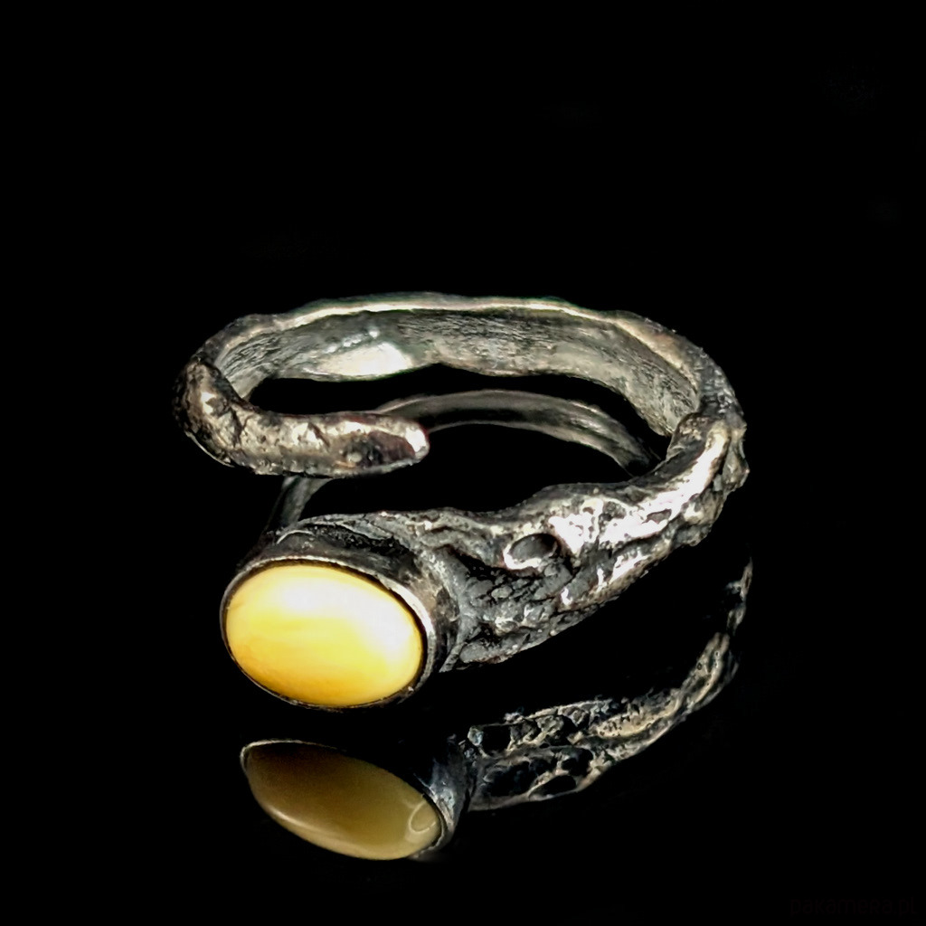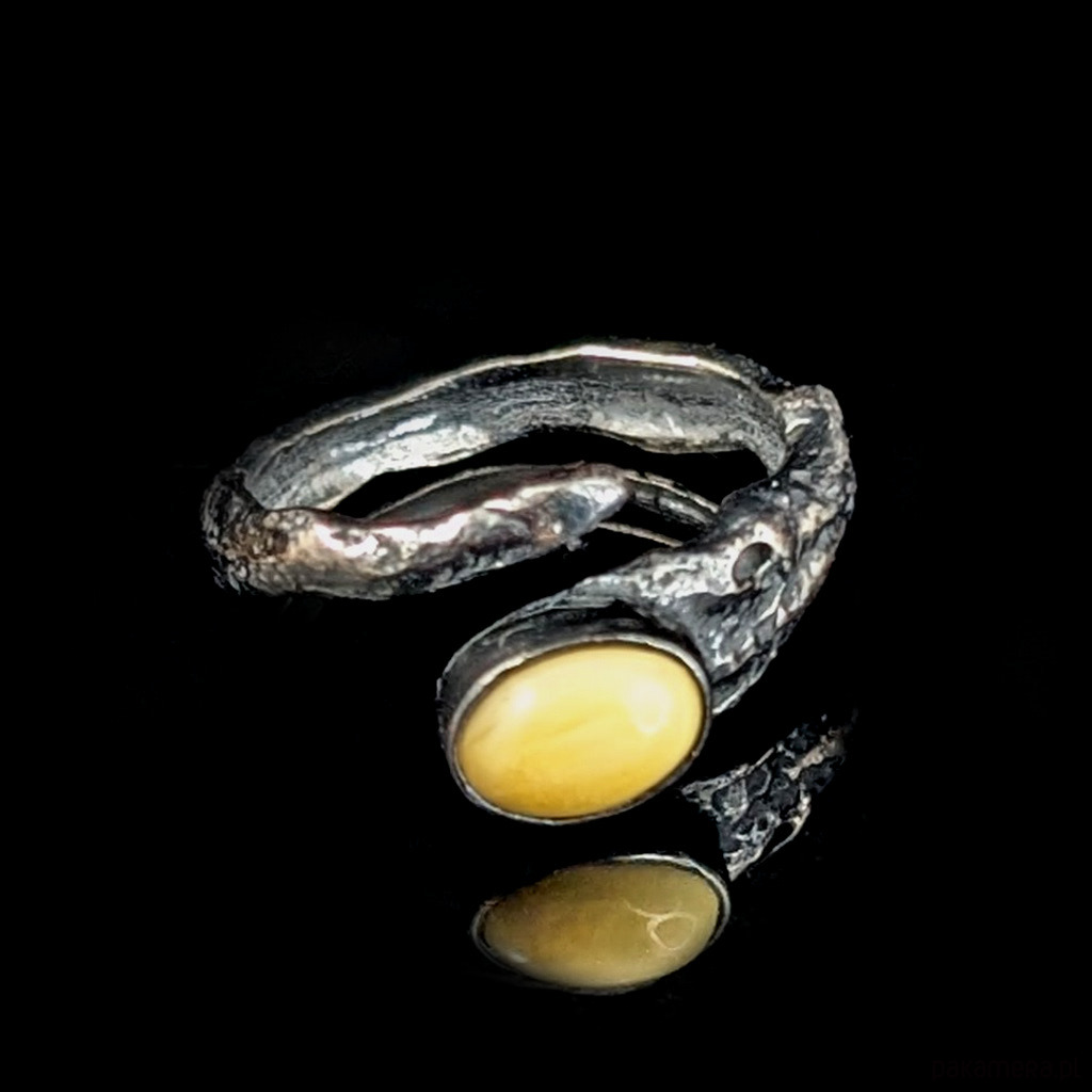 Ozdobą pierścionka jest subtelny, jasny bursztyn.