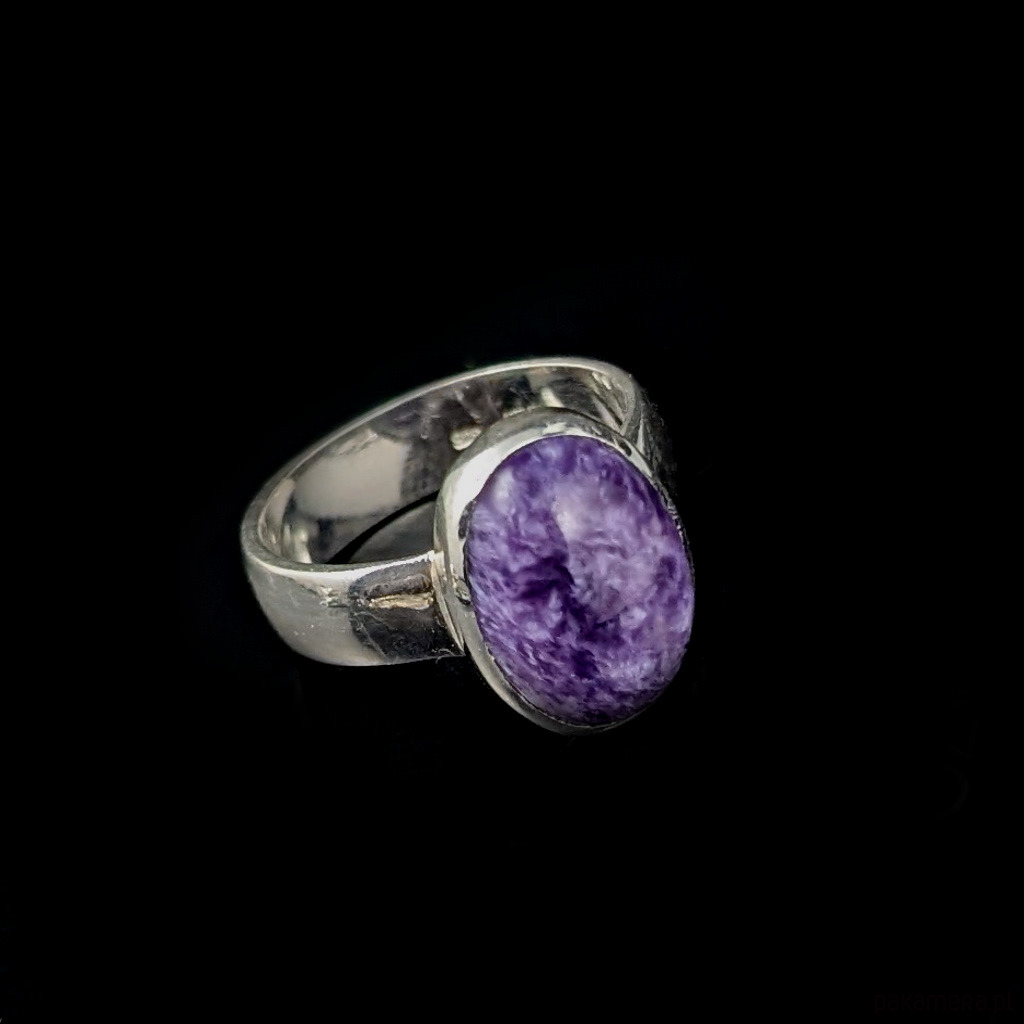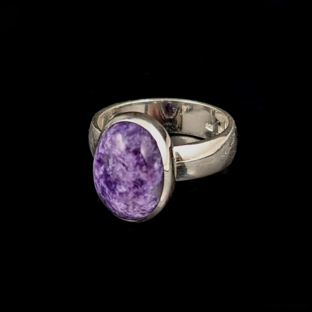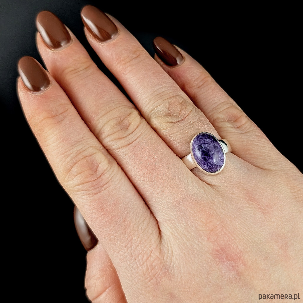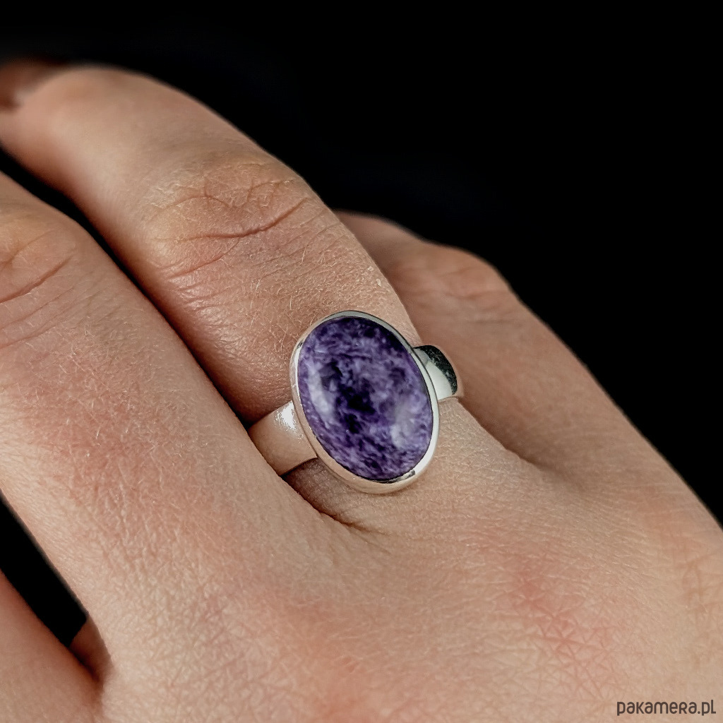 Pierścionek wykonany ze srebra próby 925 oraz niezwykłego, naturalnego czaroitu. Wymiary całej oprawy max. 15 x 11 mm. Waga 5,74 grama. Rozmiar jubilerski regulowany, dopasuję po zakupie (zakres rozmiaru 14-20). Pierścień zostanie zapakowany w ozdobne pudełeczko. Wykonany przez dostawcę kamieni.