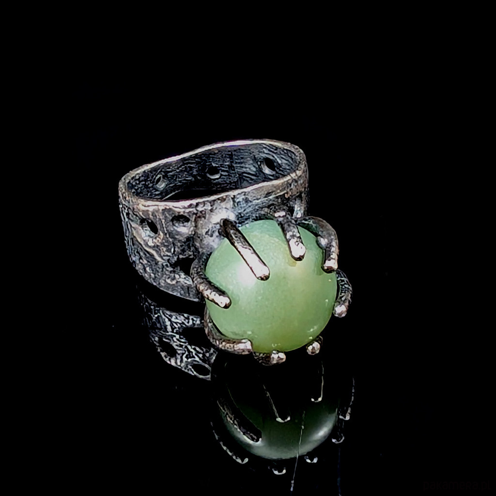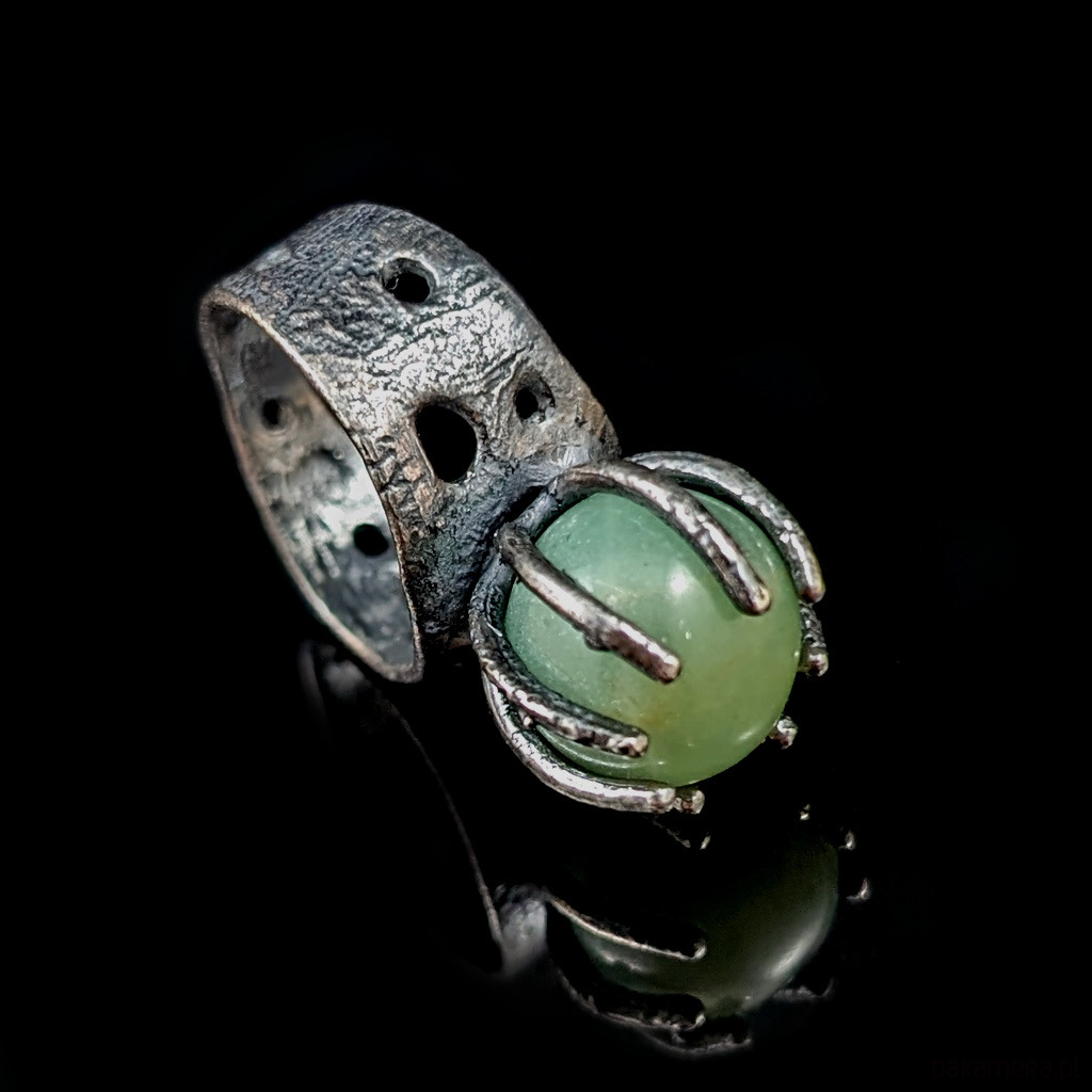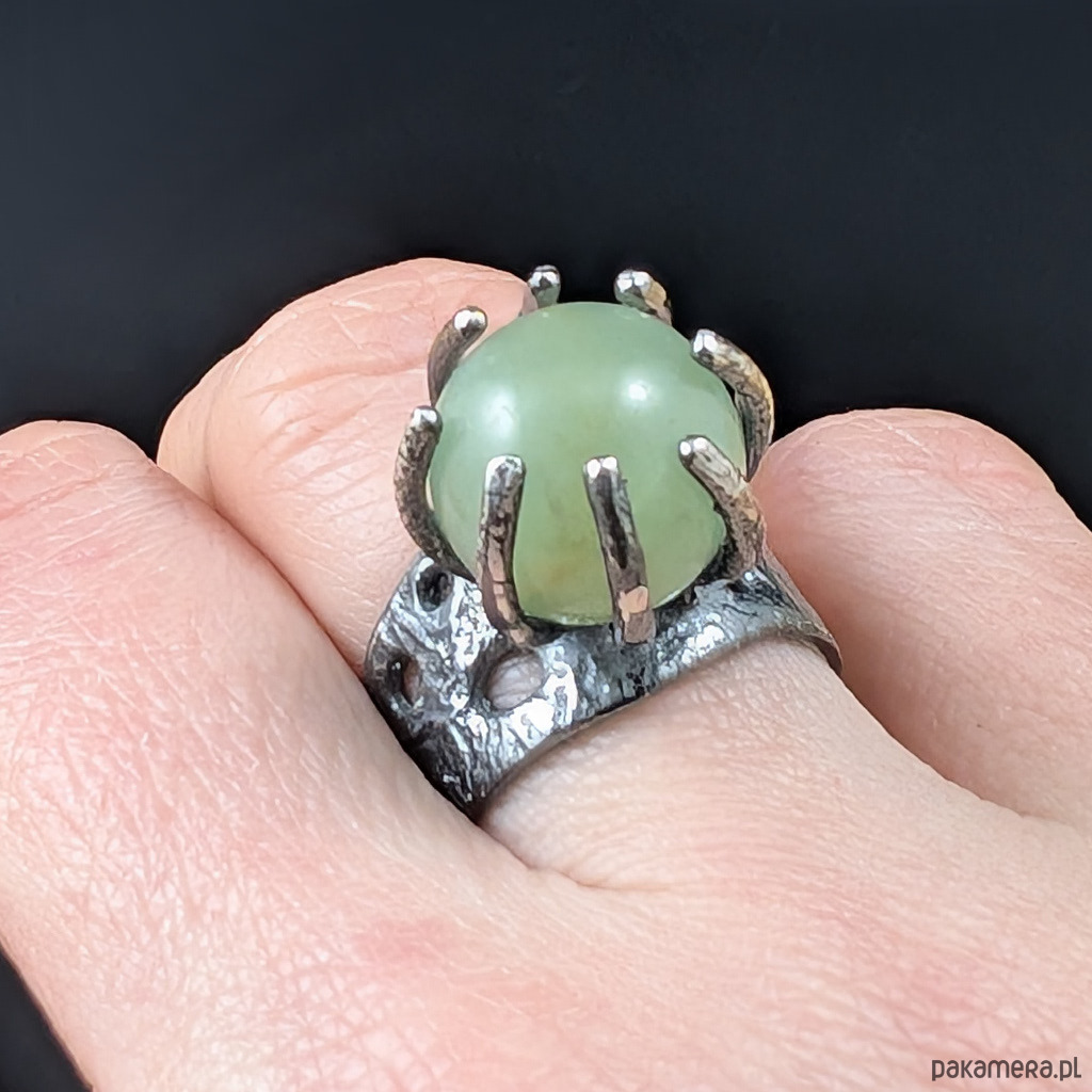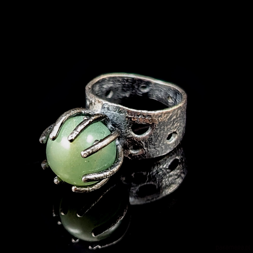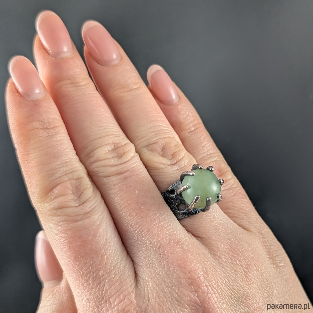 Okazały pierścień z jasnozielonym awenturynem. Kamień oprawiony w srebro pr. 925, oksydowane, przecierane. Kulę można obracać. Rozmiar pieścionka 15, mogę powiększyć obrączkę do rozmiaru max. 16. Średnica oprawy 14 mm, wysokość 13mm, waga 9,5 g, obrączka szer.4-12 mm. Pierścień będzie zapakowany w ozdobne pudełeczko.