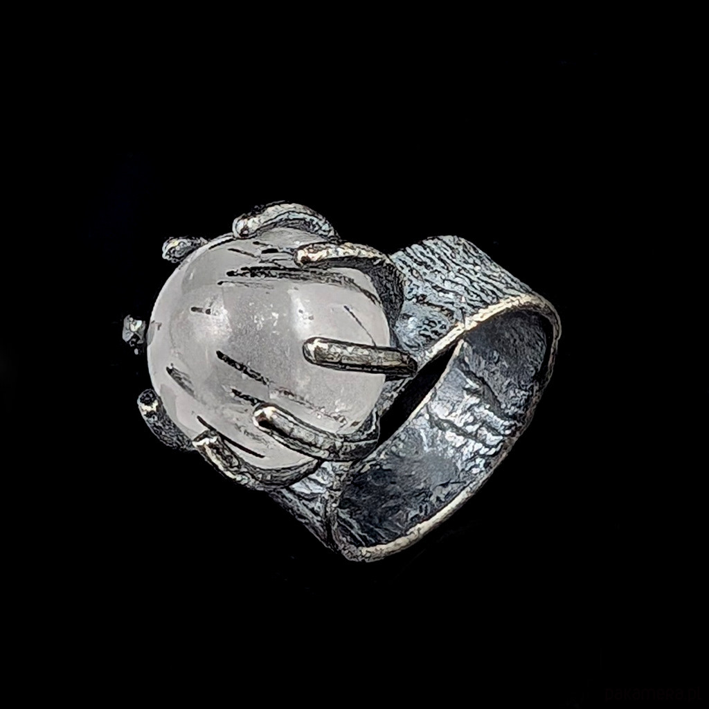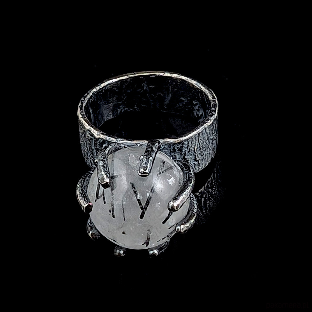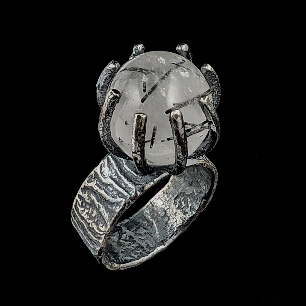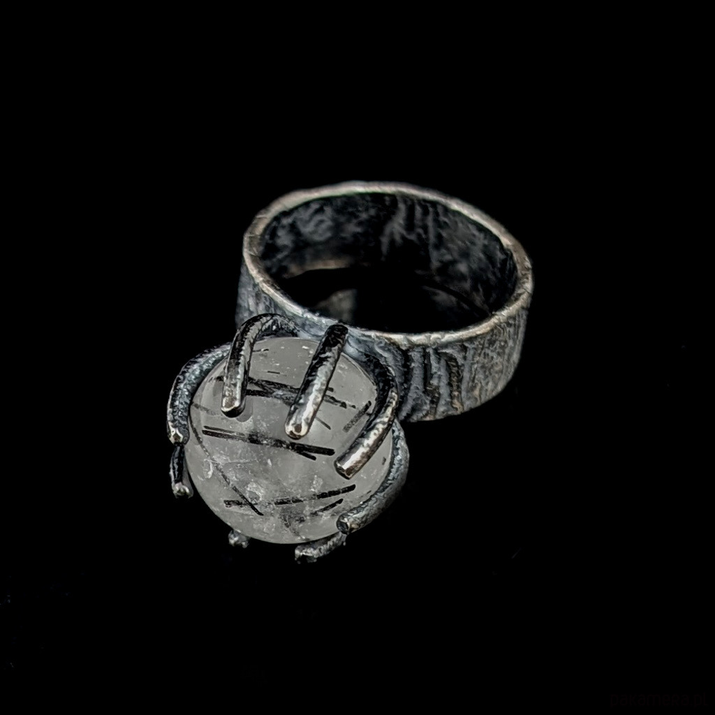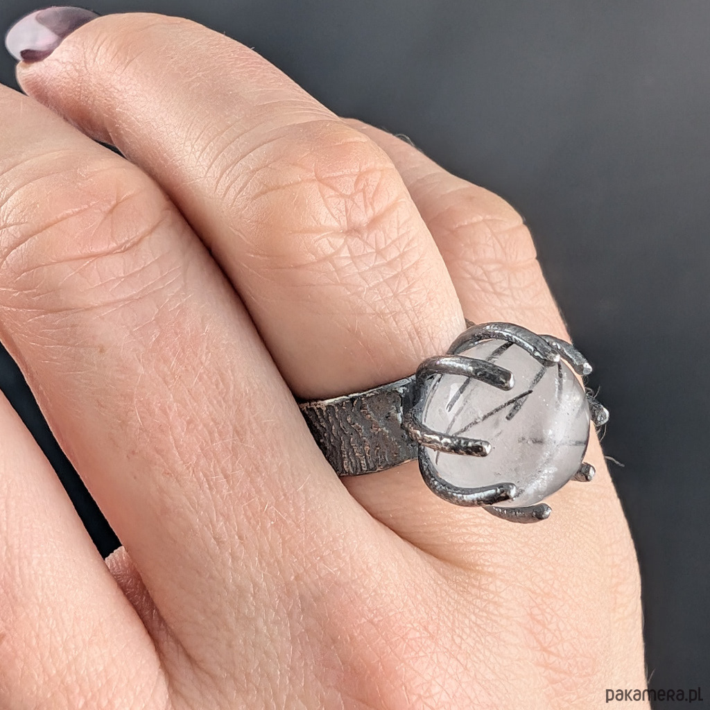 Oryginalny pierścień z ciekawym kwarcem z inkluzjami czarnego turmalinu. Kamień oprawiony w oksydowane srebro pr. 925. Kulę można obracać. Średnica oprawy 15mm, rozmiar jubilerski 16, mogę powiększyć do max 17. Waga 10 g, Pierścień będzie zapakowany w ozdobne pudełeczko.
