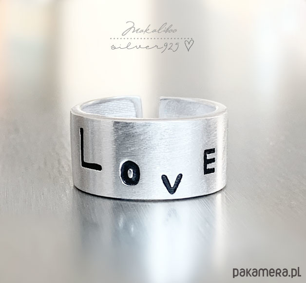Piękna, szeroka obrączka wykonana ze stali szlachetnej, ozdobiona subtelnym, ale wyrazistym napisem LOVE.
