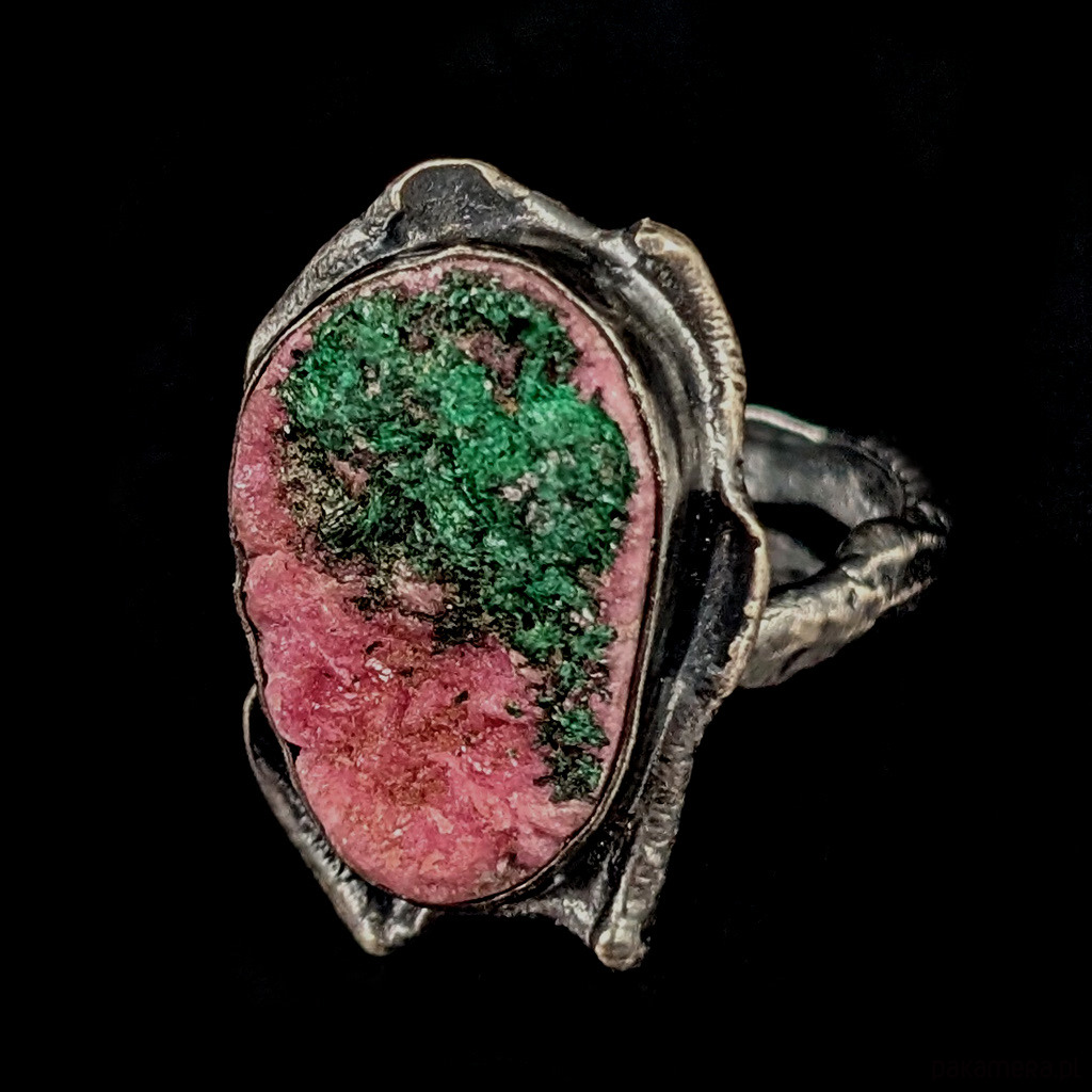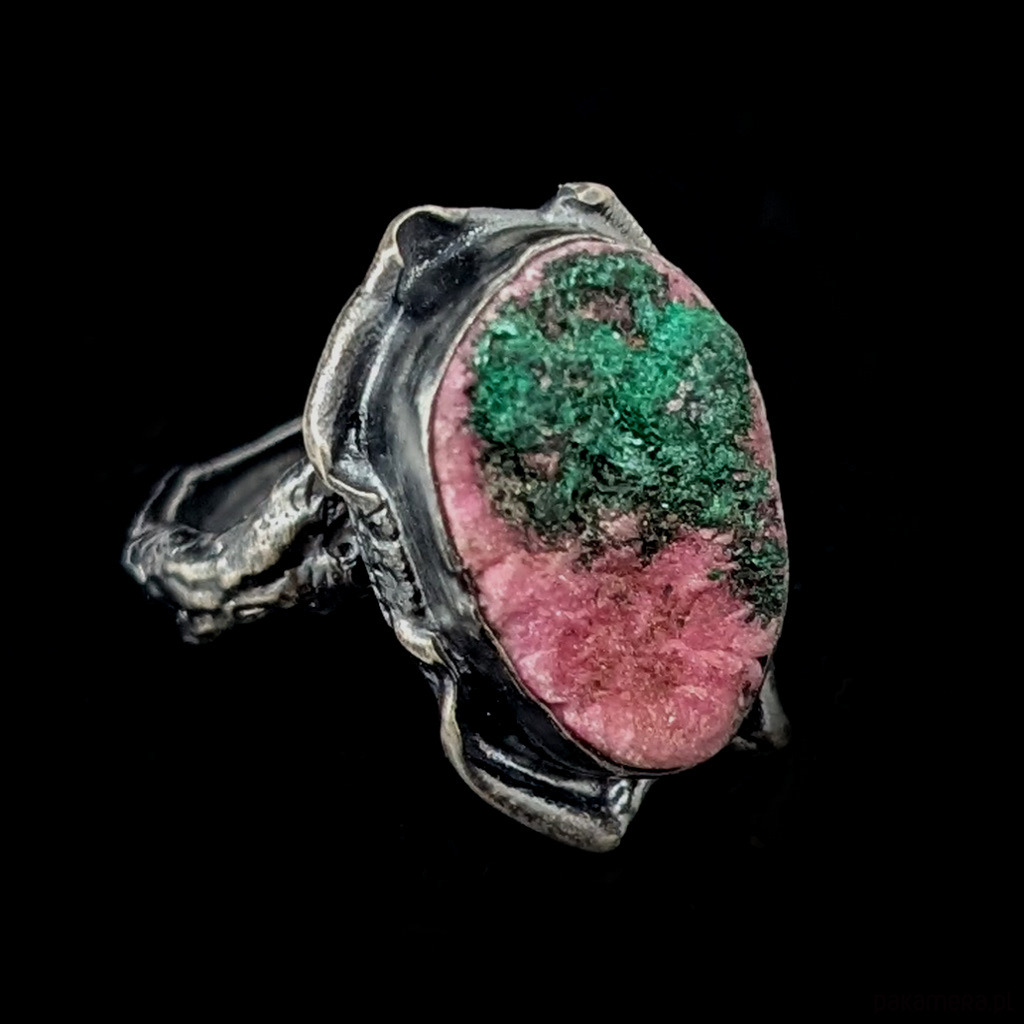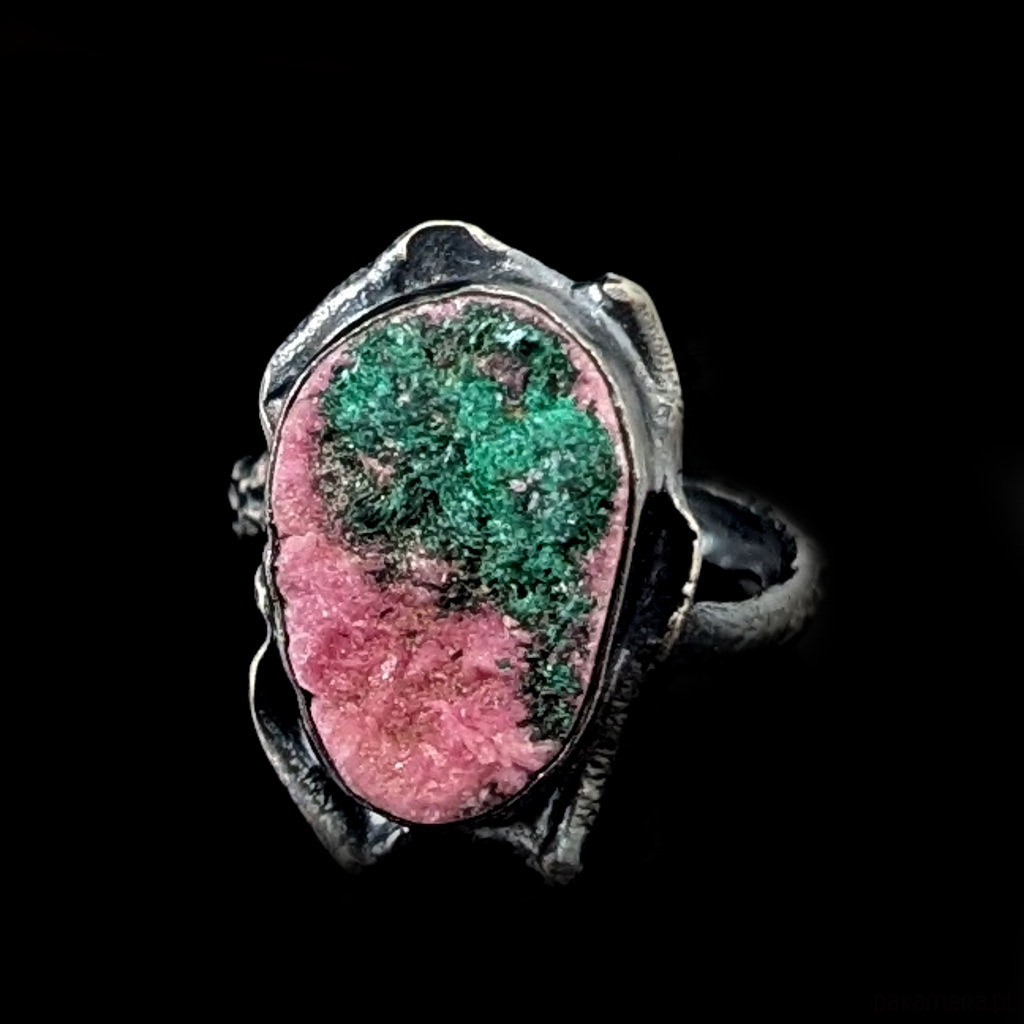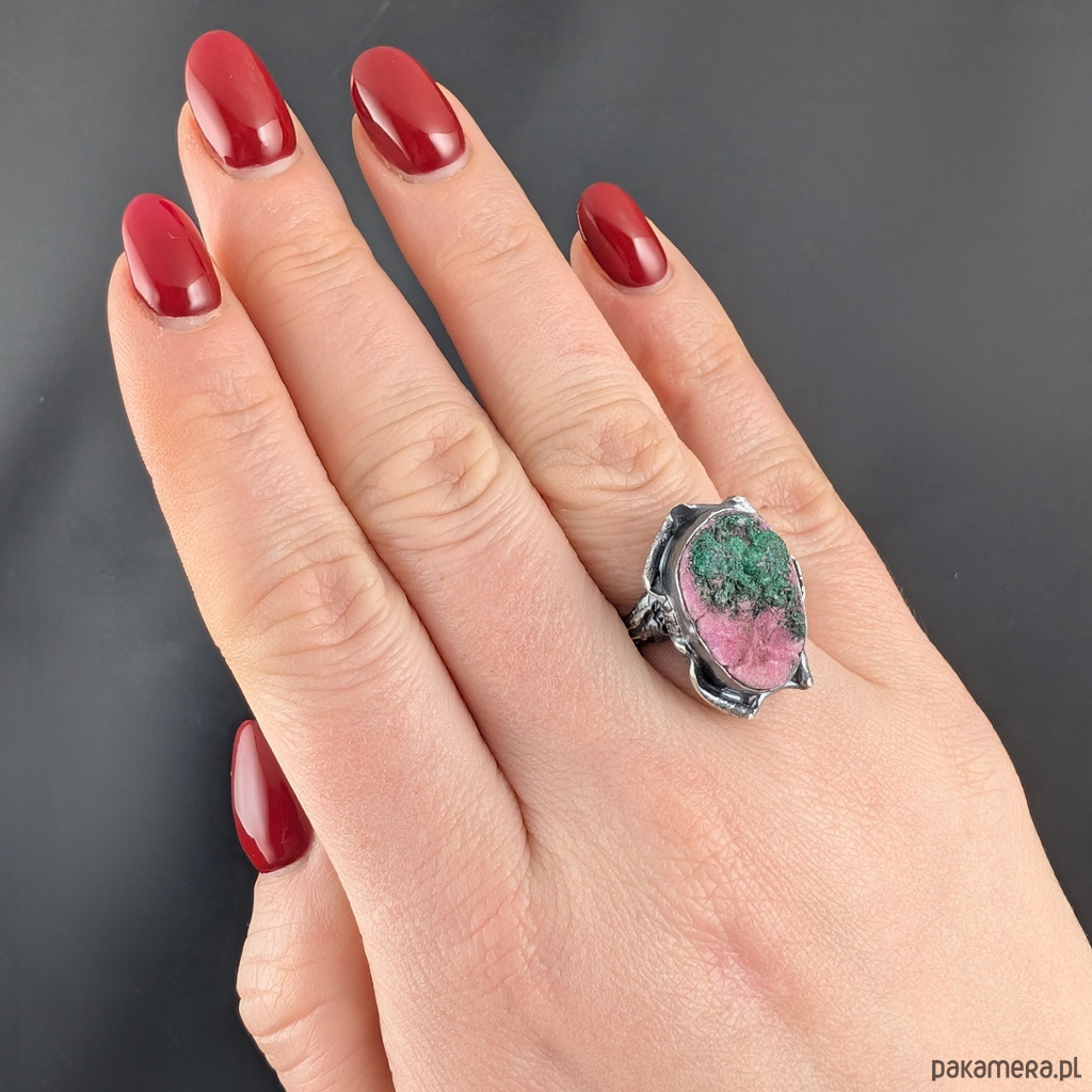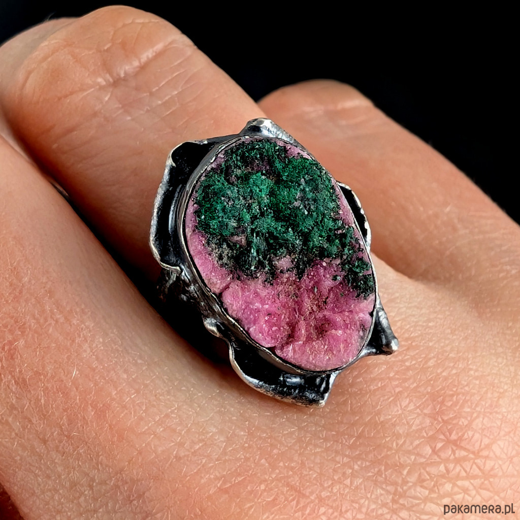 Oryginalny pierścień z oprawionym w srebrną, oksydowaną ramę pięknym malachitem włóknistym o unikalnej strukturze kryształków przypominającej włókna. Wewnątrz kamienia wrosty kobaltokalcytu. Gratka dla kolekcjonerów. Wymiary całej oprawy 23 x 16 mm. Waga 9 g. Rozmiar jubilerski regulowany w szerokim zakresie, od 10 do 23, proszę napisać na jaki dopasować. Pierścień zostanie zapakowany w ozdobne pudełeczko.