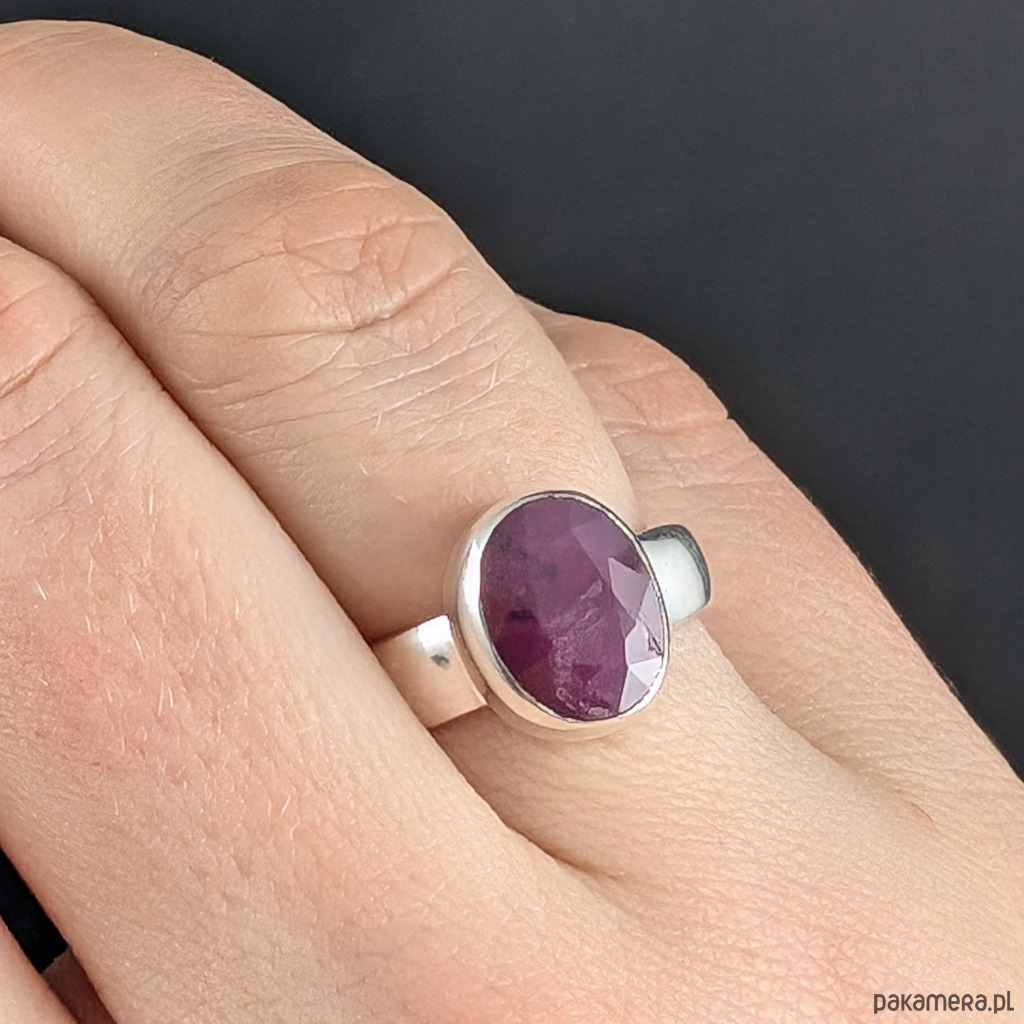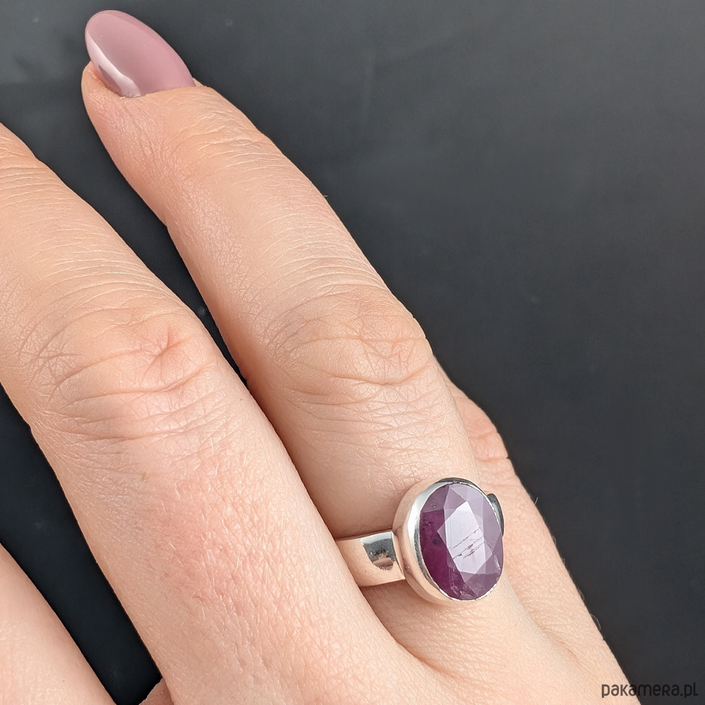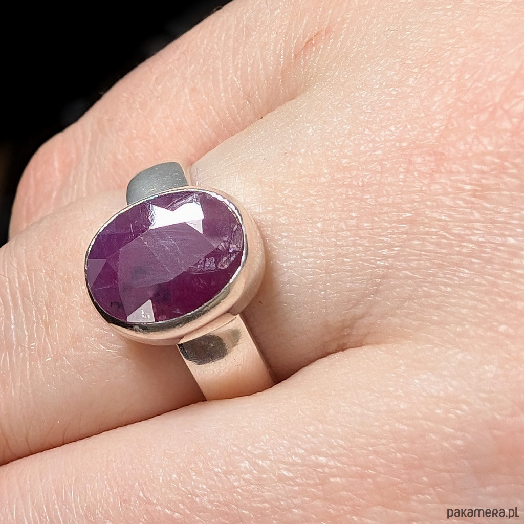 Pierścionek z oprawionym w srebro próby 925 fasetowanym rubinem o pięknej barwie. Wymiary oprawy kamienia 12 x 9 mm. Rozmiar jubilerski regulowany w wąskim zakresie 15-19. Proszę napisać na jaki dopasować. Waga 5,7 grama. Szeroka obrączka ma 5 mm. Pierścień zapakowany zostanie w ozdobne pudełeczko.