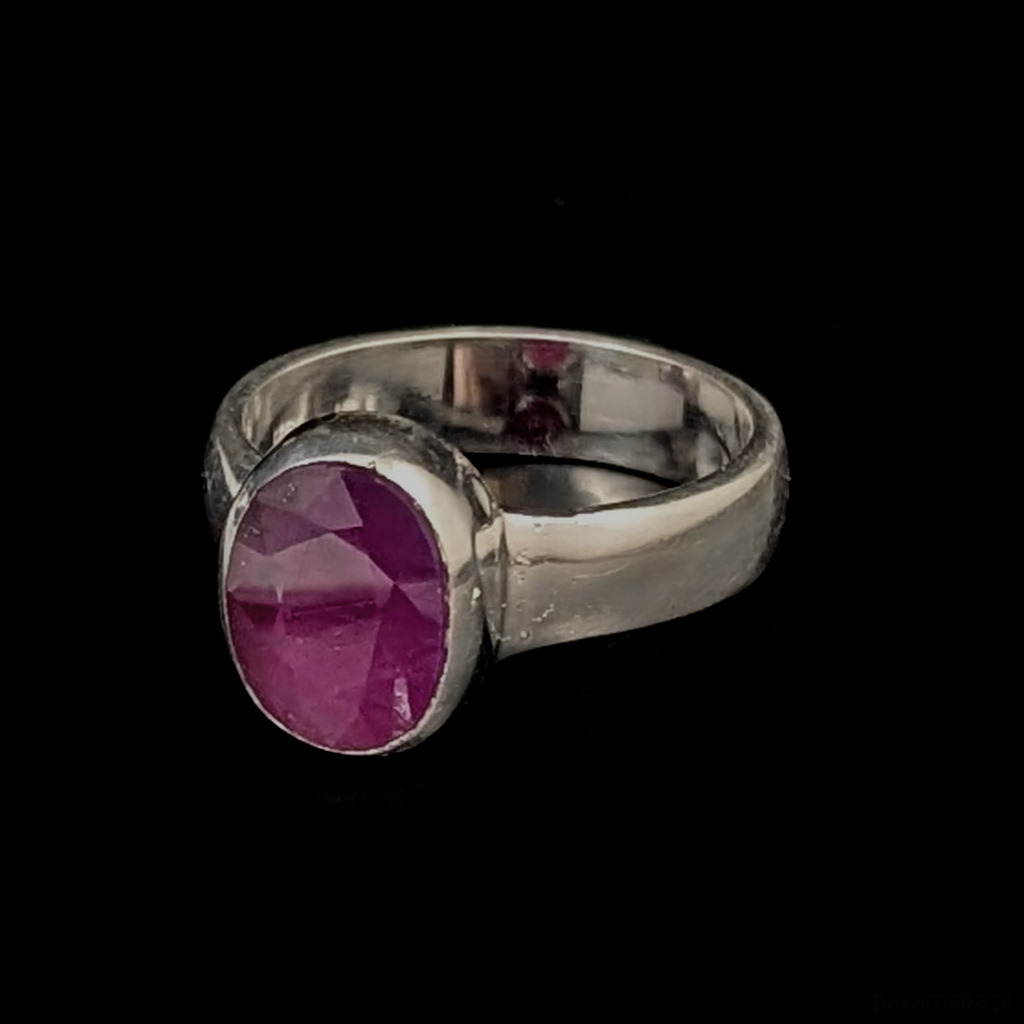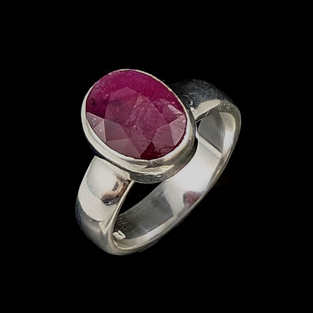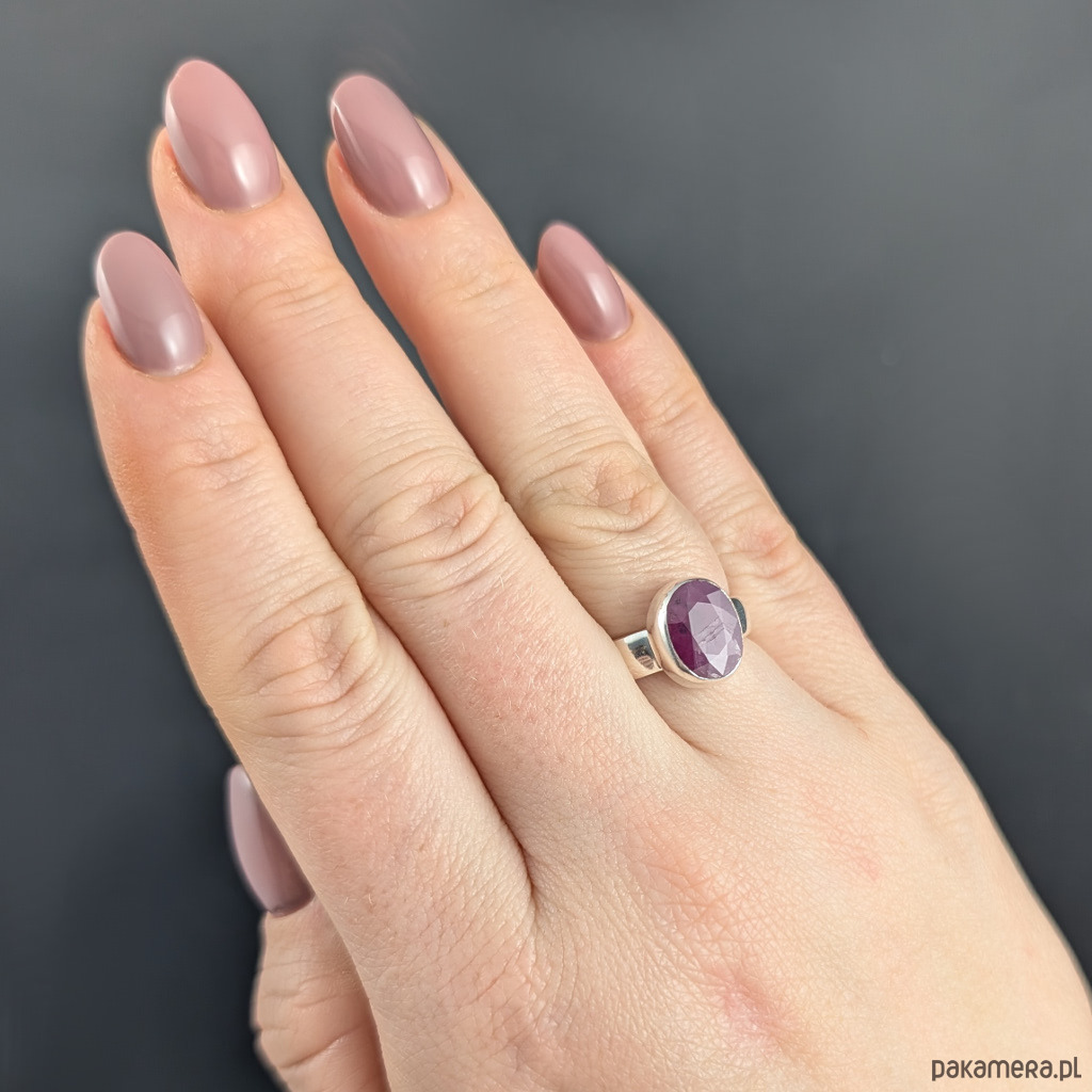 Pierścionek z oprawionym w srebro próby 925 fasetowanym rubinem o pięknej barwie. Wymiary oprawy kamienia 12 x 9 mm. Rozmiar jubilerski regulowany w wąskim zakresie 15-19. Proszę napisać na jaki dopasować. Waga 5,7 grama. Szeroka obrączka ma 5 mm. Pierścień zapakowany zostanie w ozdobne pudełeczko.