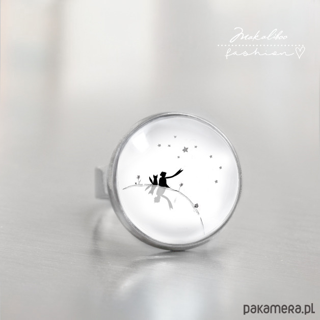 Sympatyczny pierścionek, z kolekcji Mały Książę. Autorska grafika ukryta pod 20 mm szkiełkiem , metalowa baza w tonacji ciemnego srebra wielkość pierścionka regulowana. Projekt autorski. Wszystkie prawa zastrzeżone.