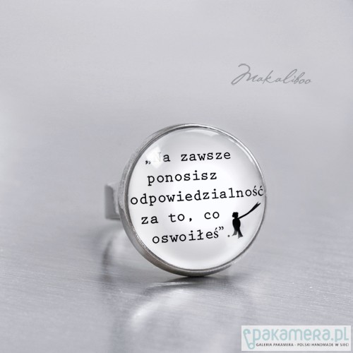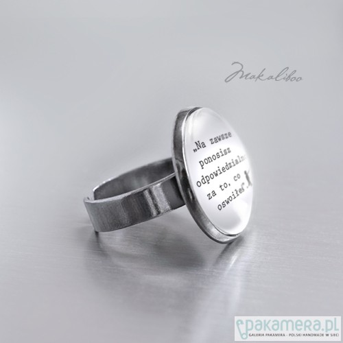 Sympatyczny pierścionek, z kolekcji Mały Książę. Cytat z kultowej książki Antoine de Saint-Exupéry Na zawsze ponosisz odpowiedzialność za to co oswoiłeś . ukryty pod 20 mm szkiełkiem , metalowa baza w tonacji ciemnego srebra wielkość pierścionka regulowana. Projekt autorski. Wszystkie prawa zastrzeżone.