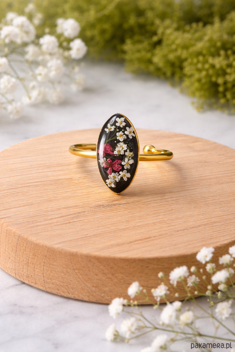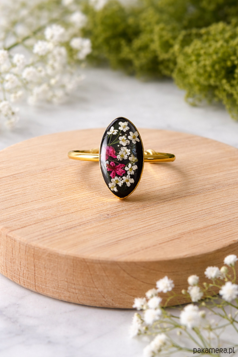 Subtelny, a jednocześnie wyrazisty pierścionek, w którym zatrzymana została prawdziwa dzika marchew. Delikatne, białe kwiaty zostały ręcznie zatopione w żywicy, tworząc unikatową kompozycję widoczną na głębokim, kontrastowym tle. Każdy egzemplarz jest niepowtarzalny — tak jak sama natura.