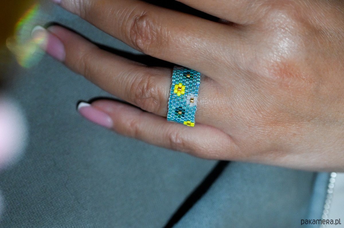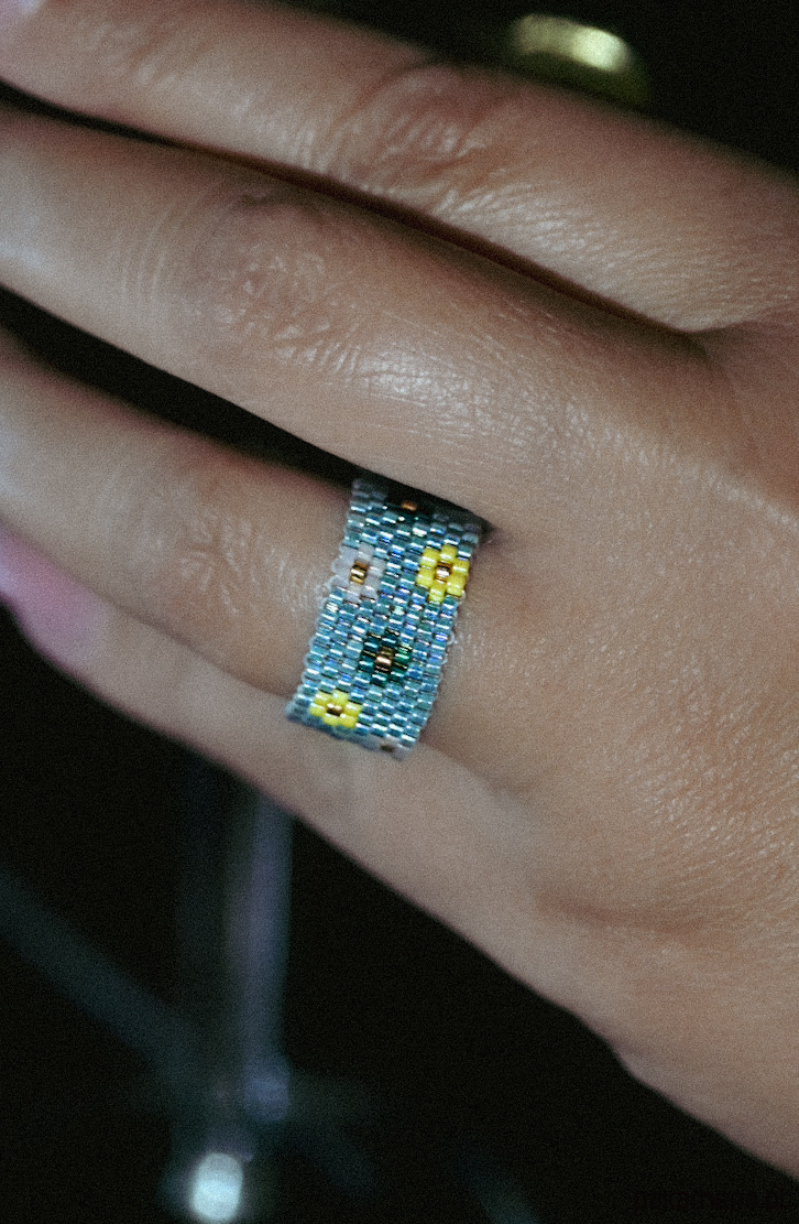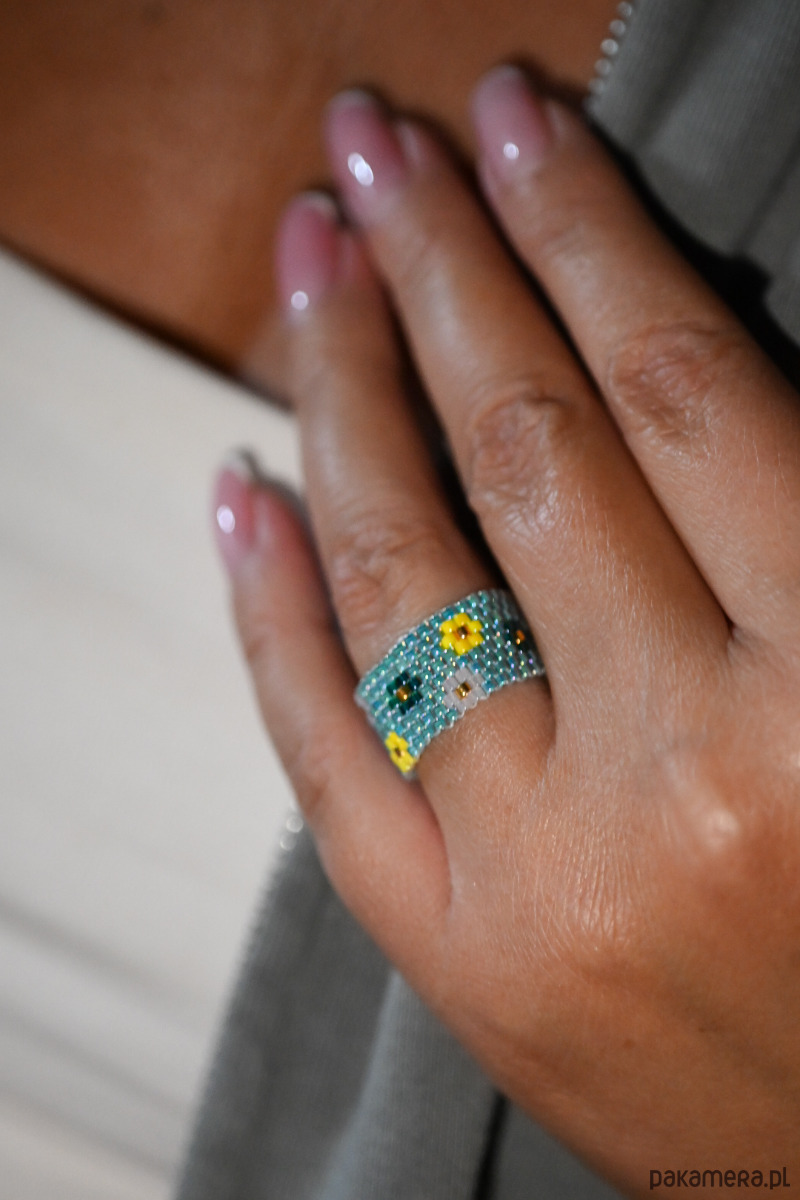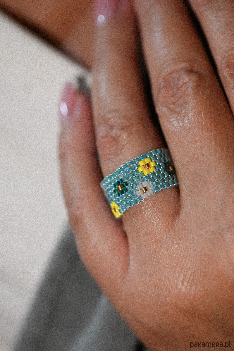 Odkryj wyjątkowy, ręcznie pleciony pierścionek z kolekcji MEGAN, który z pewnością przyciągnie spojrzenia i zbierze wiele komplementów. Ten 8-rzędowy, wielokolorowy pierścionek wykonany jest z najwyższej jakości japońskich szklanych koralików Miyuki Delica, tworząc uroczy wzór kwiatków w stylu boho.