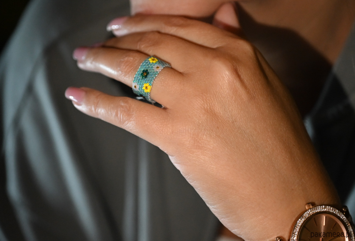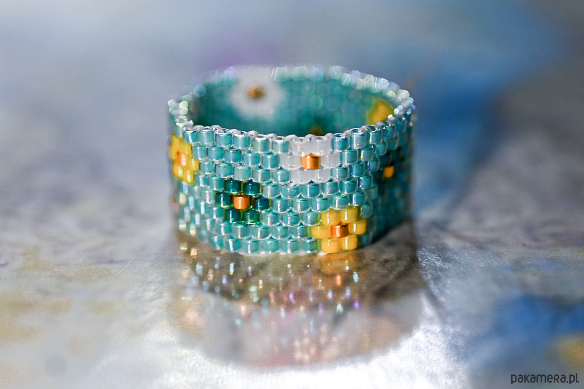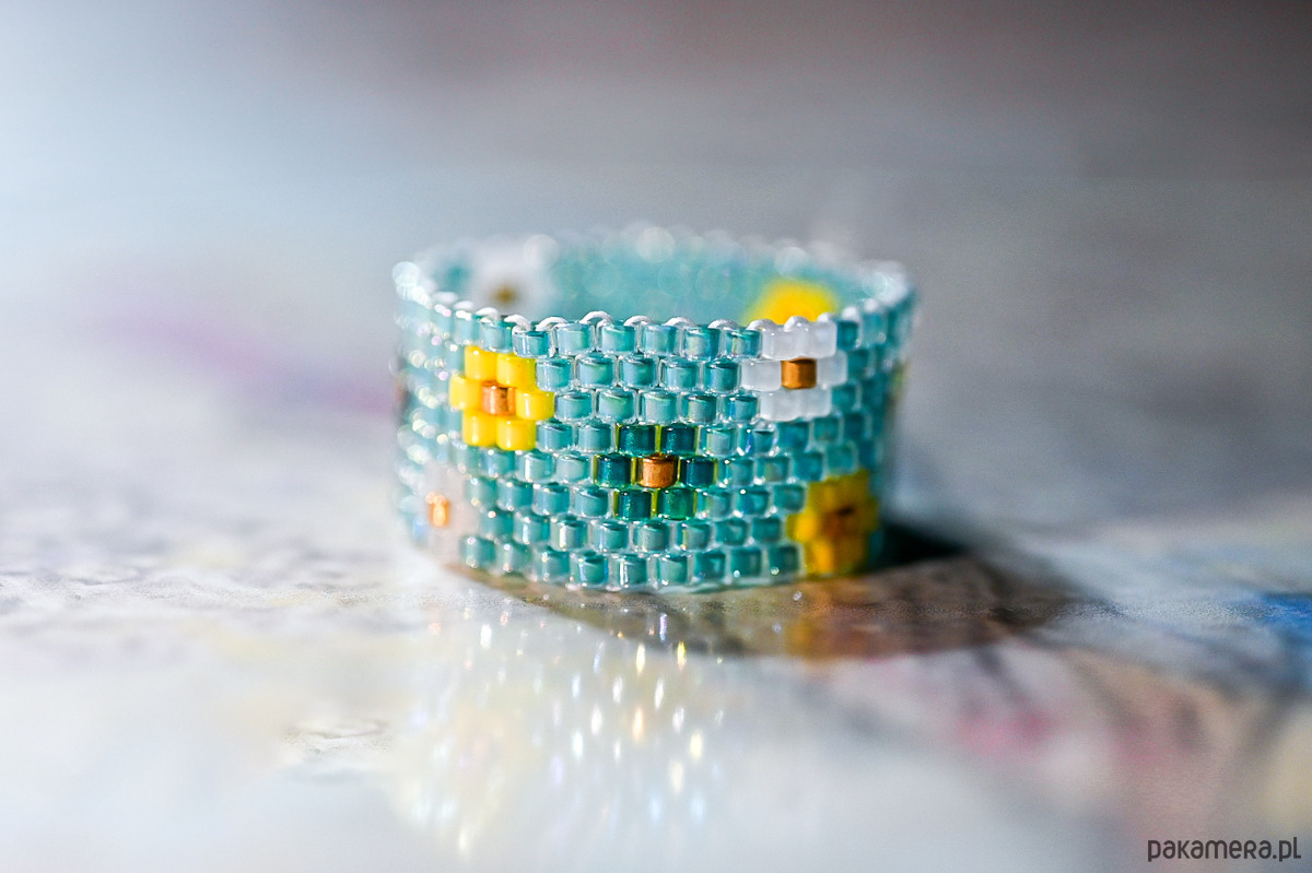 Odkryj wyjątkowy, ręcznie pleciony pierścionek z kolekcji MEGAN, który z pewnością przyciągnie spojrzenia i zbierze wiele komplementów. Ten 8-rzędowy, wielokolorowy pierścionek wykonany jest z najwyższej jakości japońskich szklanych koralików Miyuki Delica, tworząc uroczy wzór kwiatków w stylu boho.