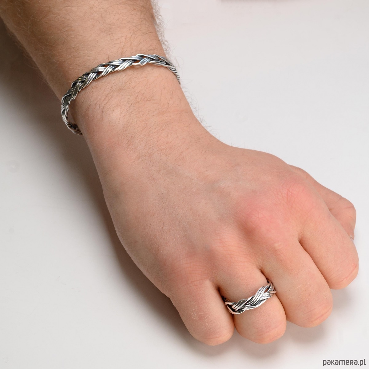Oryginalny, pierścionek wzór warkocz -plecionka. Bardzo elegancki męski pierścionek/obrączka wykonana ze srebrnych drucików, ręcznie plecionych. Obrączka jest niepowtarzalna, spodoba się każdemu mężczyźnie ceniącegu wykonanie ręczne.