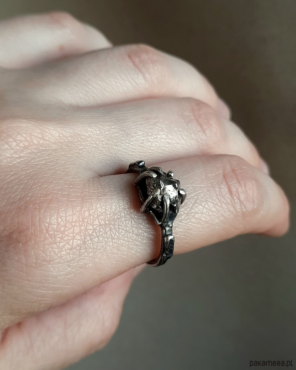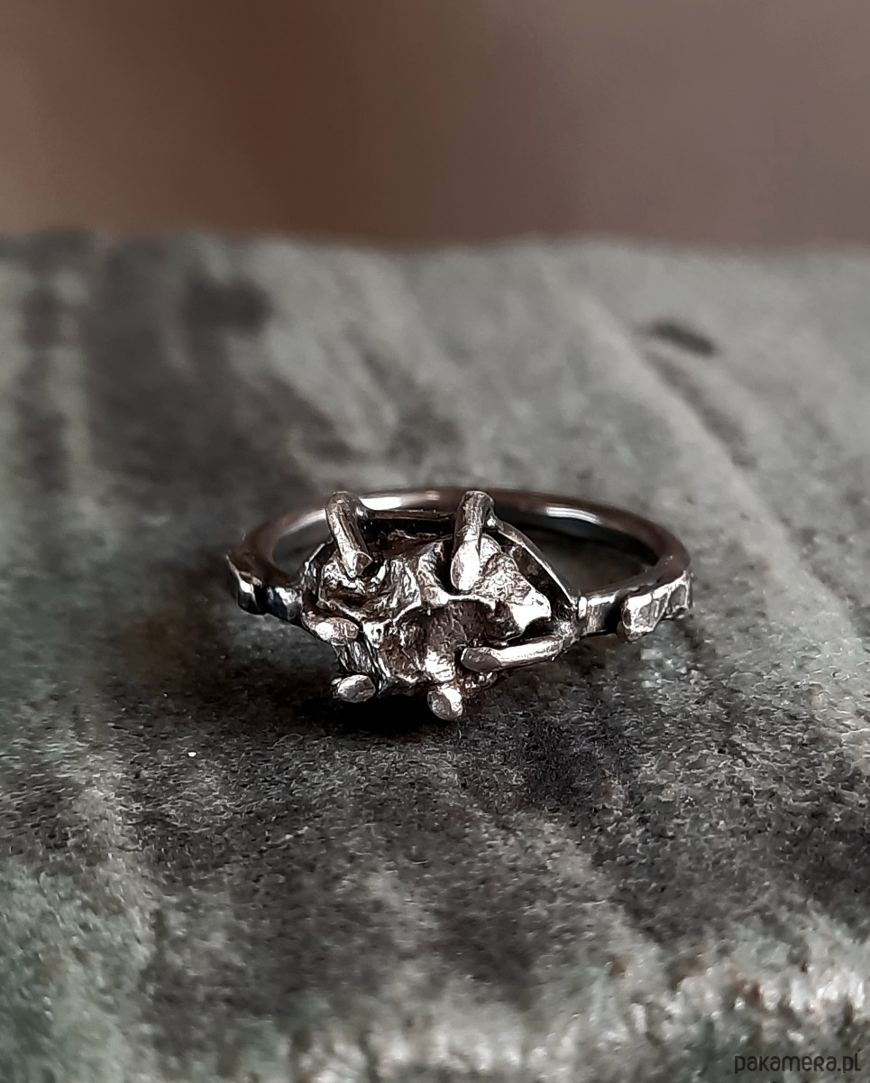 Pierścionek METEORYT jest surowy, prosty, czarujący. Górę pierścionka zdobi naturalny żelazowy meteoryt z Argentyny.