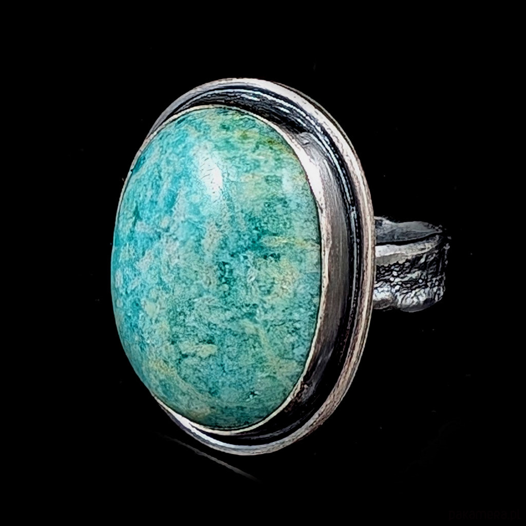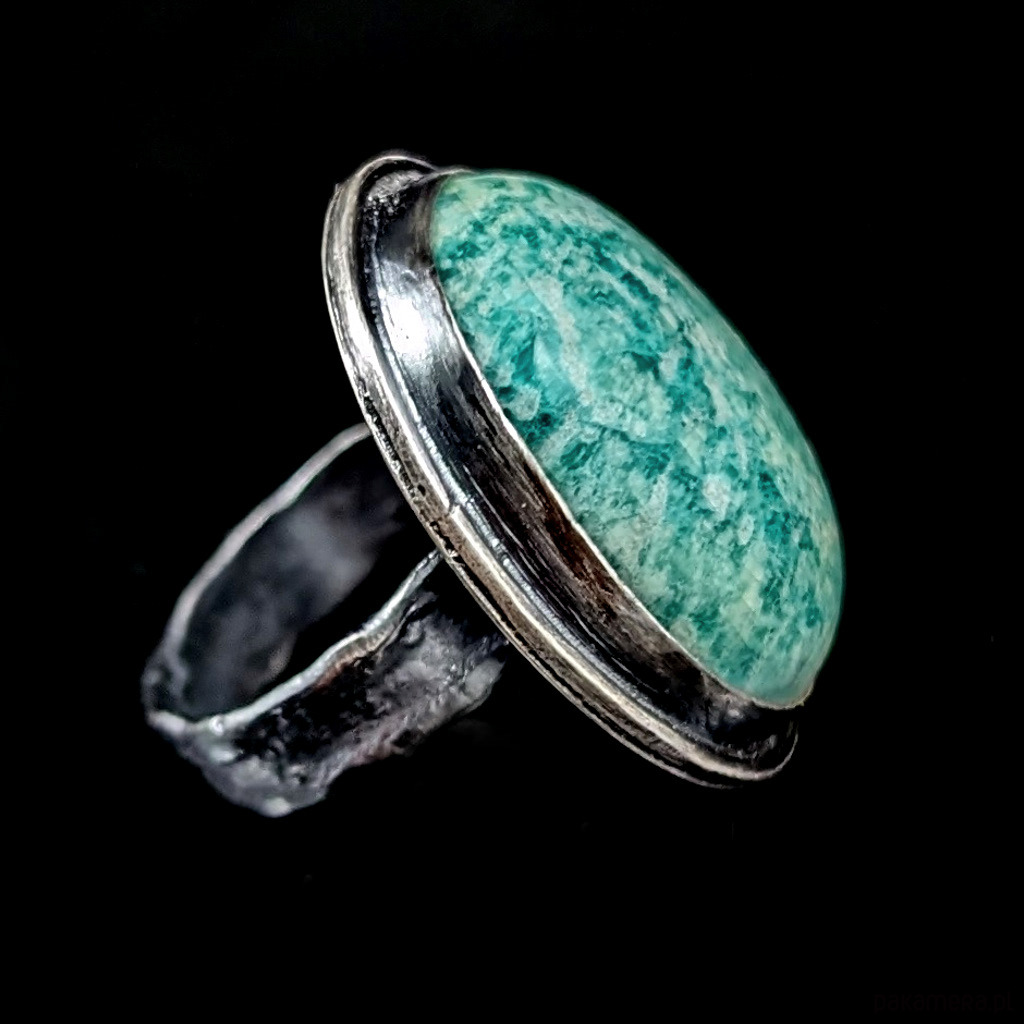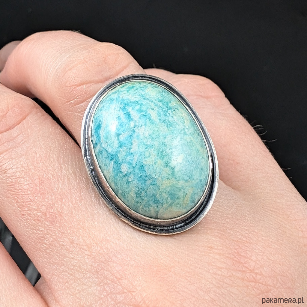 Pierścień wykonany z oksydowanego srebra próby 925 oraz naturalnego, miętowego amazonitu. Piękny okaz. Wymiary oprawy 28 x 22 mm, rozmiar jubilerski 15, mogę powiększyć na max rozmiar 16. Waga 13 gramów. Obrączka ma 4 mm szerokosci. Pierścień zostanie zapakowany w ozdobne pudełeczko.