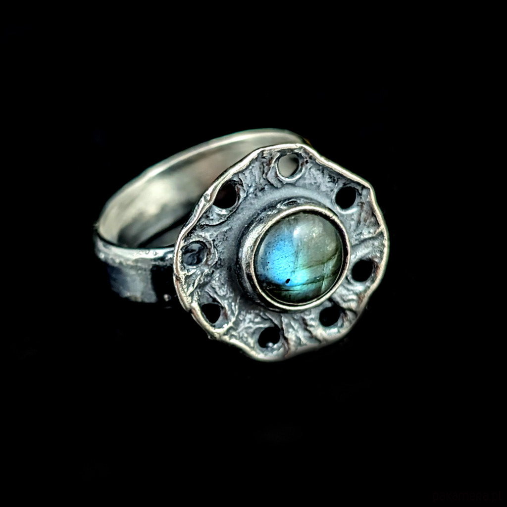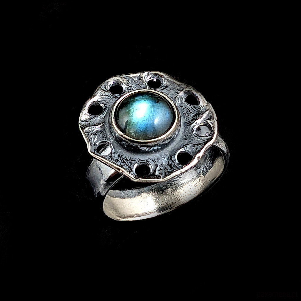 Pierścień z oprawionym w srebro próby 925 labradorytem. Srebro ciekawie fakturowane, oksydowane. Średnica oprawy 17 mm, kamienia 8 mm, waga 6 g. Obrączka o szerokości 5 mm, regulowana w szerokim zakresie, proszę napisać jaki rozmiar dopasować.