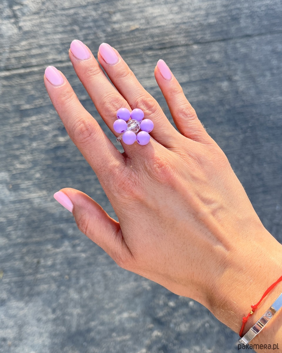 Delikatny i z nutą dziewczęcego uroku – ten pierścionek z koralikowym kwiatkiem to subtelny dodatek, który doda blasku każdej stylizacji. Centralnie osadzony szklany koralik otoczony jest akrylowymi płatkami w liliowym kolorze o matowym wykończeniu, tworząc kwiat o lekko vintage’owym charakterze. Przezroczysta, elastyczna baza z drobnych koralików sprawia, że pierścionek dopasowuje się do palca i niemal stapia się ze skórą.