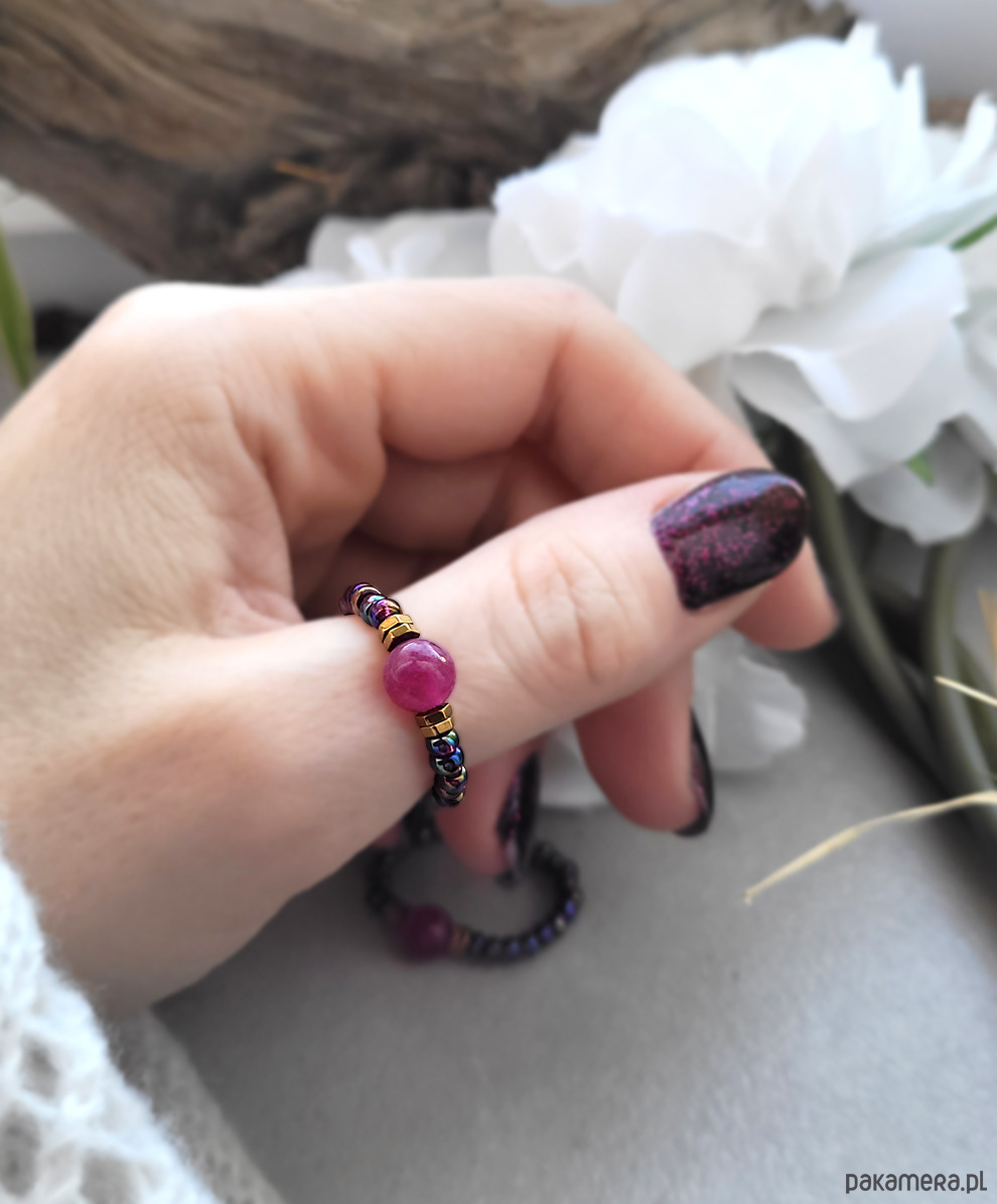Piękny pierścionek elastyczny z Turmalinem różowym oraz Hematytem w kolorze złota.