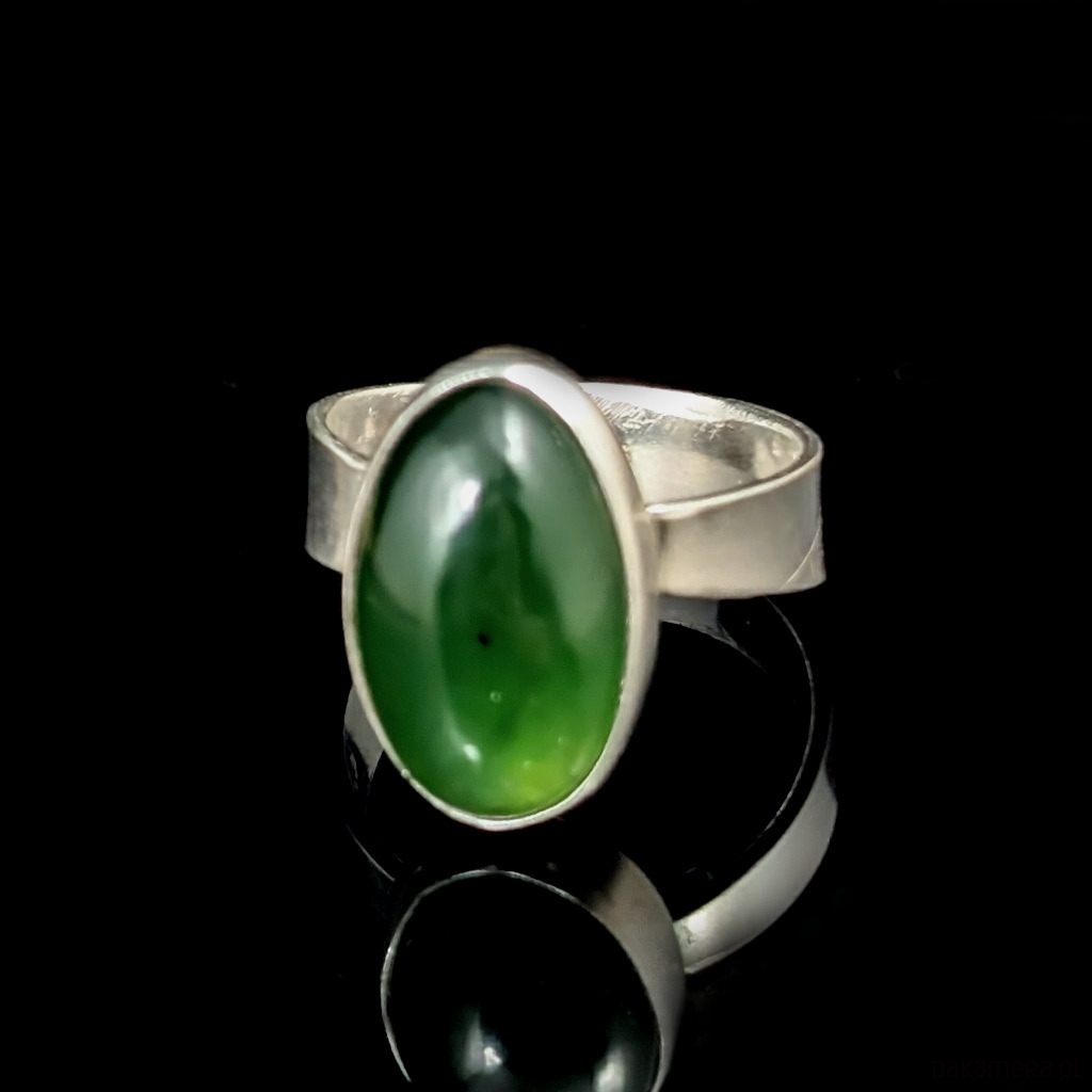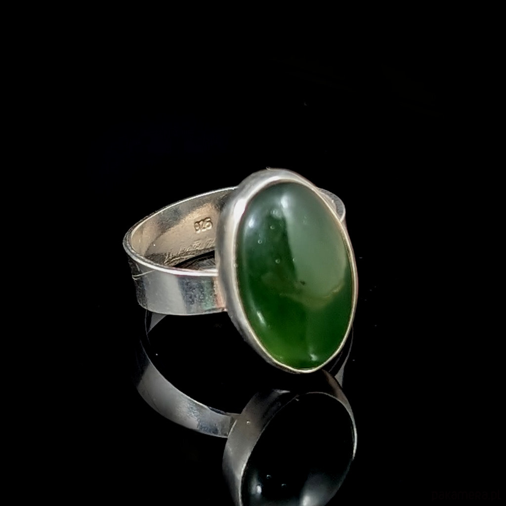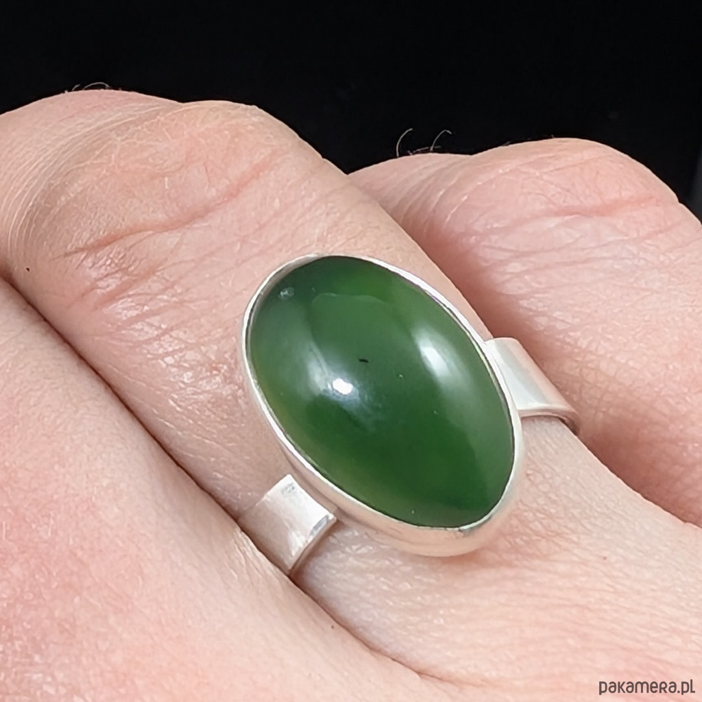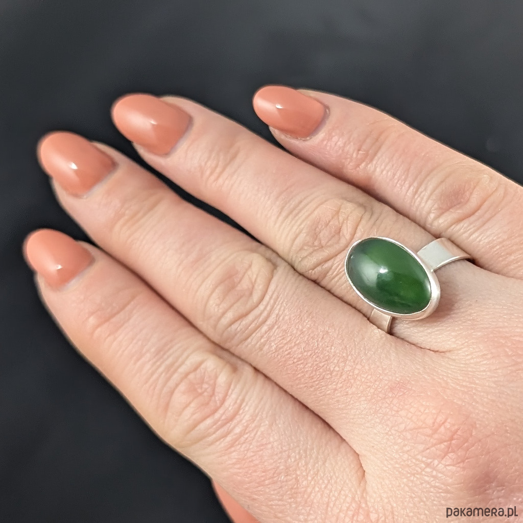 Retro pierścionek z naturalnym nefrytem w pięknym kolorze stonowanej zieeni charakterystycznej dla tego kamienia. Wymiary oprawy 17 x 11 mm. Waga 5,5 grama. Rozmiar jubilerski regulowany w szerokim zakresie, proszę napisać na jaki dopasowac. Będzie wysłany w ozdobnym pudełeczku.