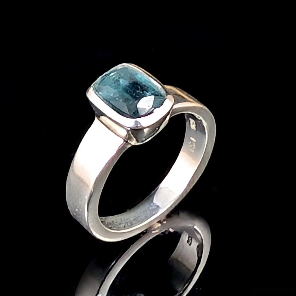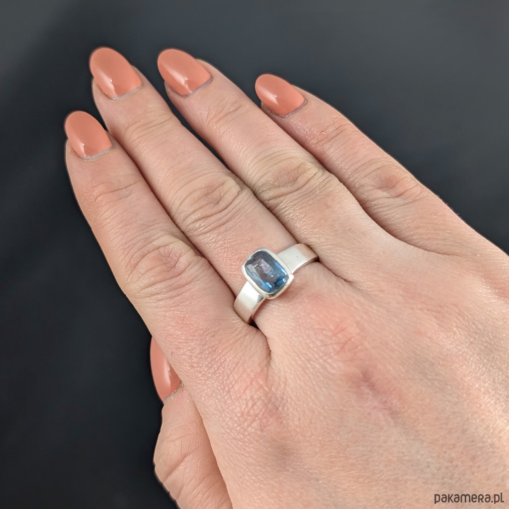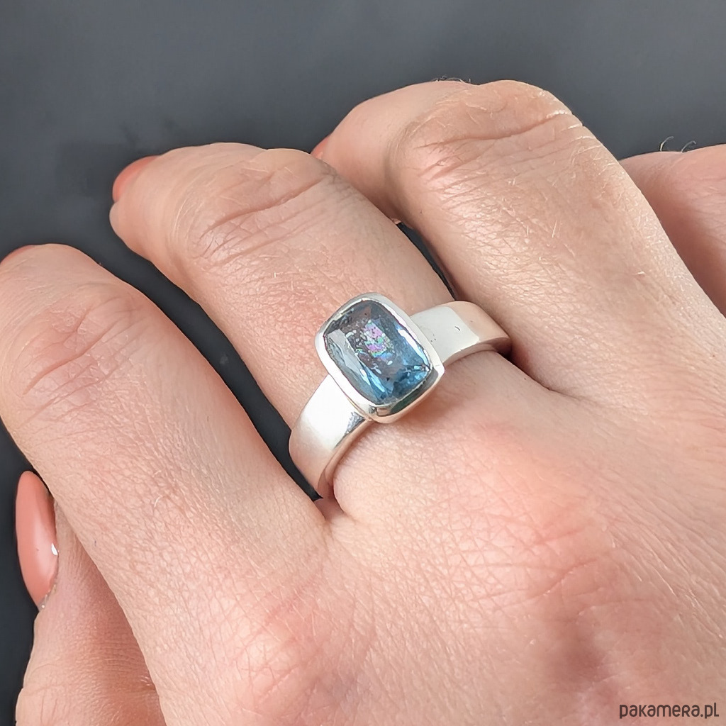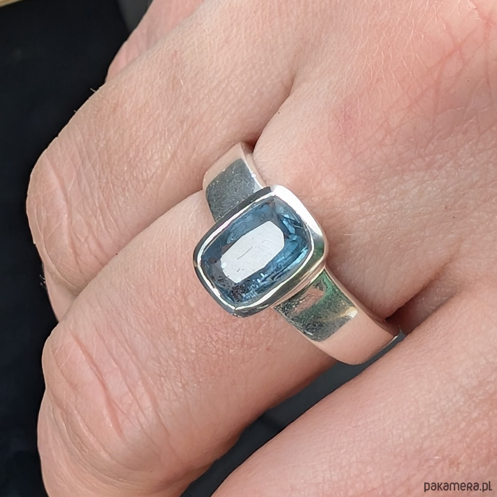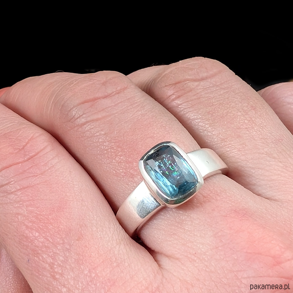 Piękny kyanit o dużej przejrzystości spotęgowanej szlifem. Wymiary 10 x 8 mm, Oprawa wykonana została ze srebra próby 925, obrączka zwężana, mam max 5 mm szerokości. Rozmiar jubilerski 18. Wykonany przez dostawcę kamieni. Pierścionek zapakowany w ozdobne pudeleczko.