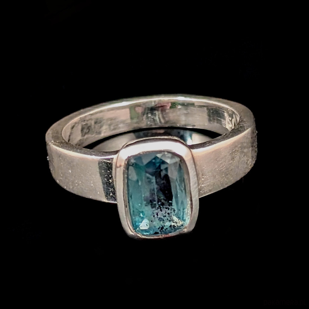 Piękny kyanit o dużej przejrzystości spotęgowanej szlifem. Wymiary 10 x 8 mm, Oprawa wykonana została ze srebra próby 925, obrączka zwężana, mam max 5 mm szerokości. Rozmiar jubilerski 18. Wykonany przez dostawcę kamieni. Pierścionek zapakowany w ozdobne pudeleczko.