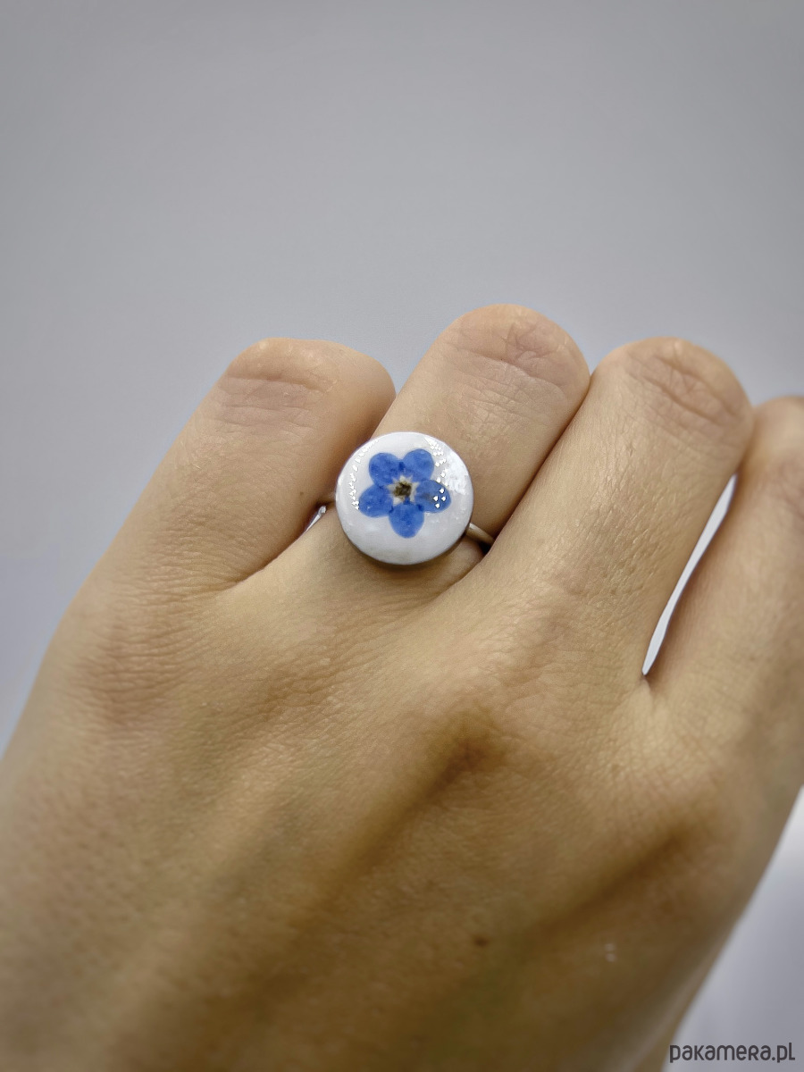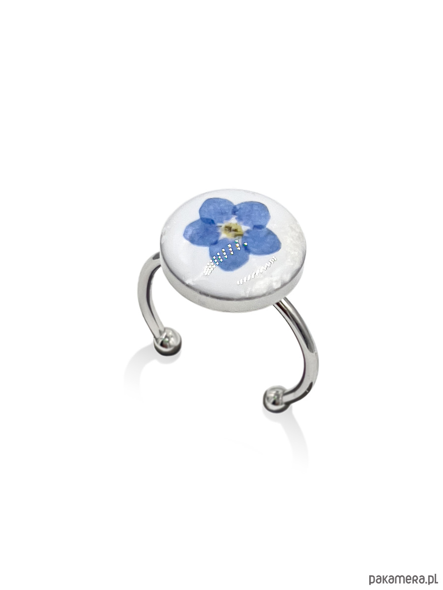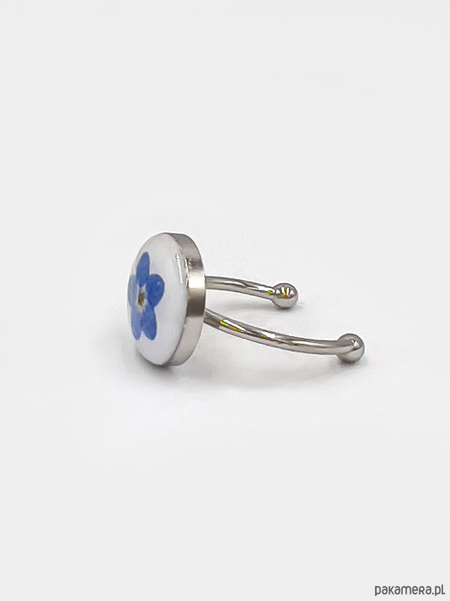 Romantyczny pierścionek z prawdziwym kwiatuszkiem niezapominajki na jasnym tle z perłowym błyskiem. Subtelny dodatek, który spodoba się fankom niepowtarzalnej biżuterii, inspirowanej naturą. Do kompletu polecamy kolczyki, naszyjnik oraz bransoletkę z niezapominajkami.