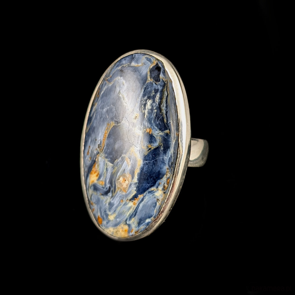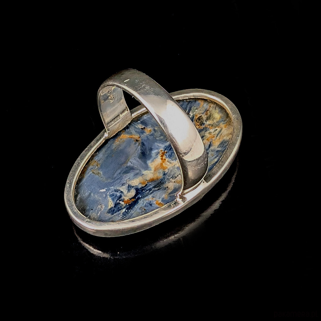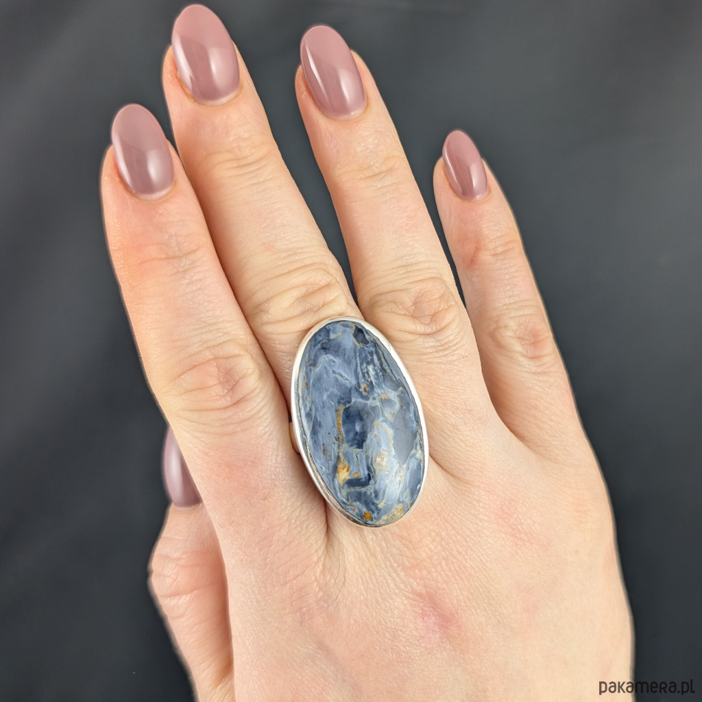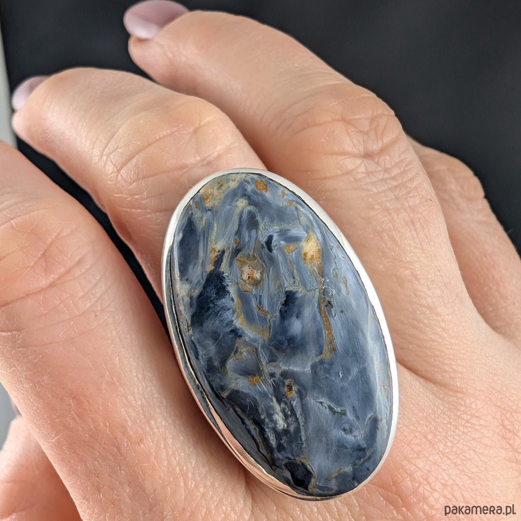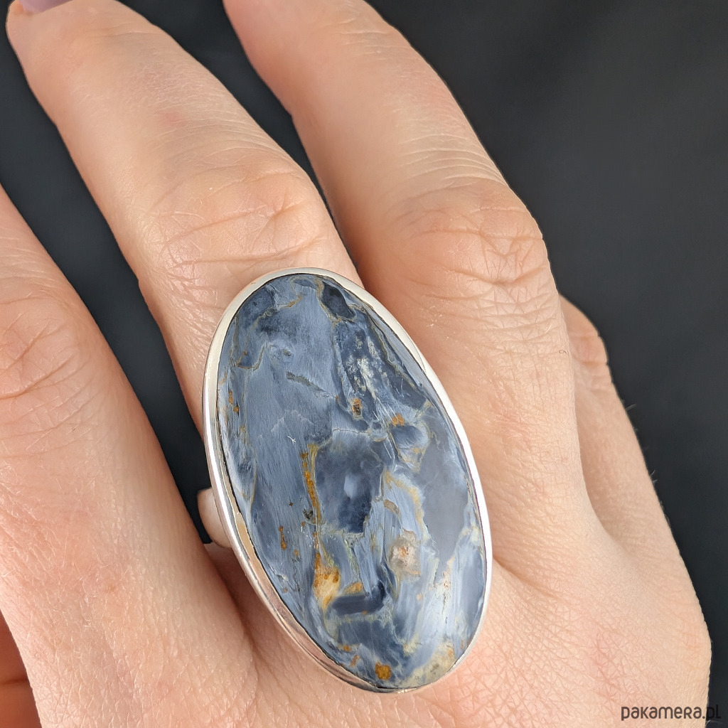 Pierścień wykonany własnoręcznie z oksydowanego srebra próby 925 oraz przepięknego, naturalnego pietersitu (pietersite). Niezwykły minerał pochodzi z Afryki, Namibia. Wspaniały efekt włókien mieniących się podczas ruchu, niczym ruchome piaski czy wodospady. Petersit ukazuje efekt kociego oka, strukturą przypomina nieco czaroit. Rzadki bardzo jakościowy minerał. Wymiary oprawy 38 x 23mm. Rozmiar jubilerski 21 bez m ożliwości zmiany. Obrączka ma 5 mm szerokości. Waga 11 g. Pierścień wysyłamy w ozdobnym pudełeczku. Wykonany przez dostawcę kamieni