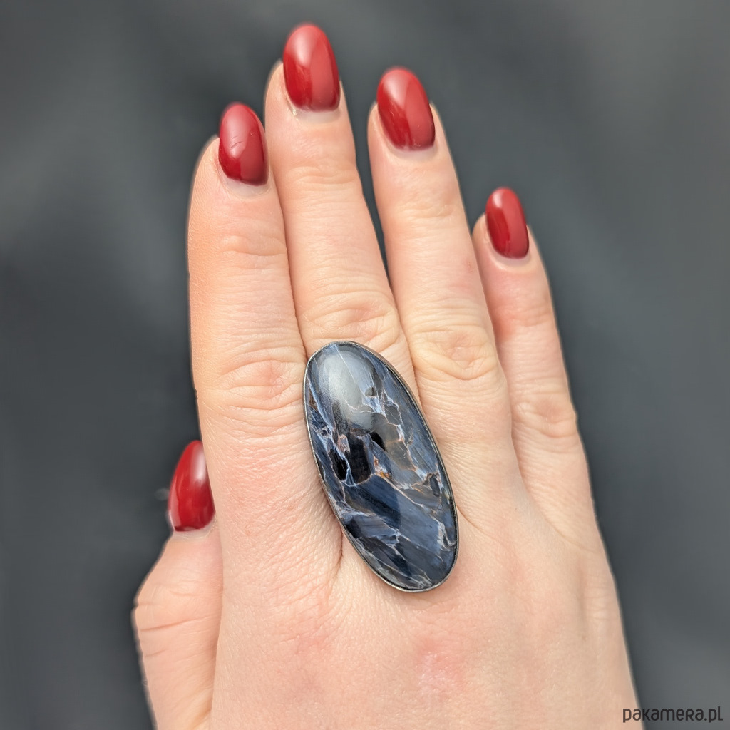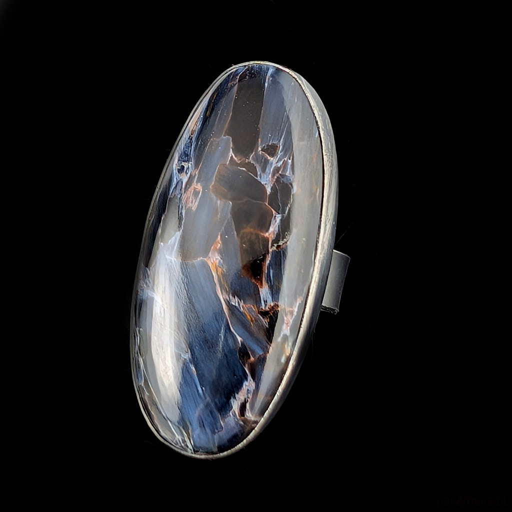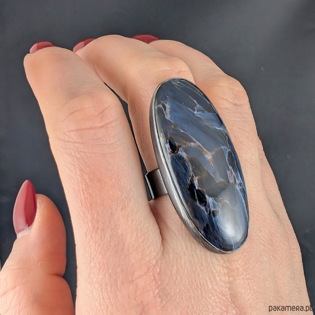 Pierścień wykonany z oksydowanego srebra próby 925 oraz ogromnego, naturalnego pietersitu (pietersite). Niezwykły minerał.Wspaniały efekt włókien mieniących się podczas ruchu, niczym ruchome piaski czy wodospady. Petersit ukazuje efekt kociego oka, strukturą przypomina nieco czaroit. Rzadki bardzo jakościowy minerał. Wymiary oprawy 45 x 20 mm. Rozmiar jubilerski 19, mogę powiększyć na rozmiar max.21. Obrączka ma 6 mm szerokości. Waga 16,3 g. Pierścień wysyłamy w ozdobnym pudełeczku.