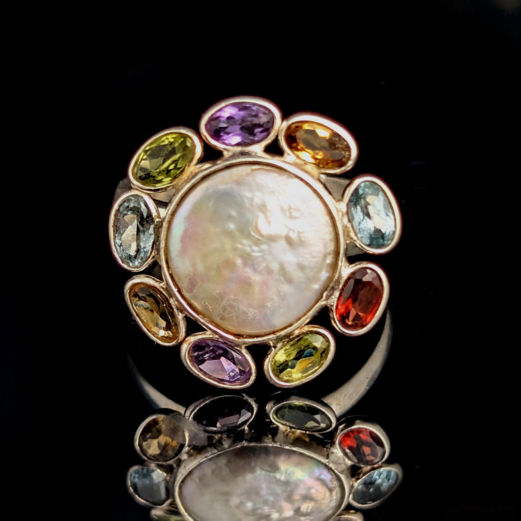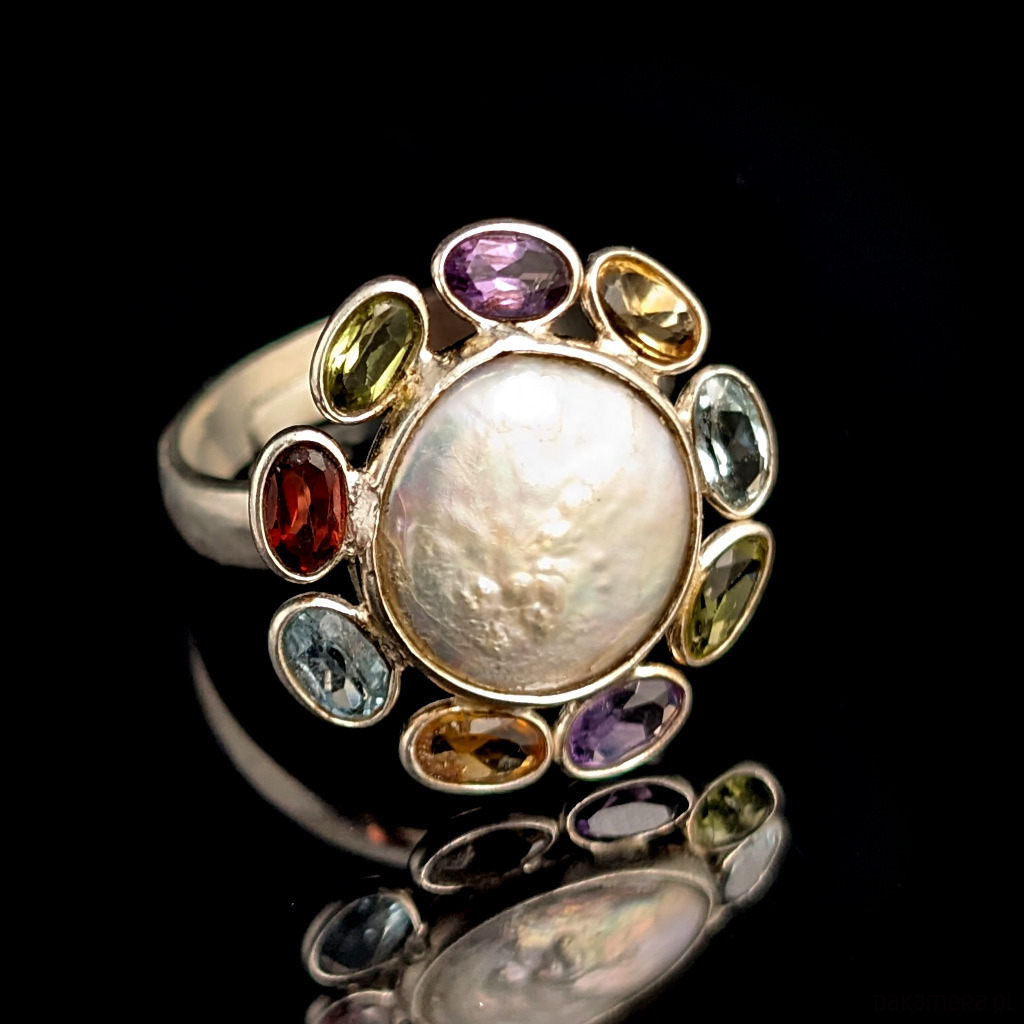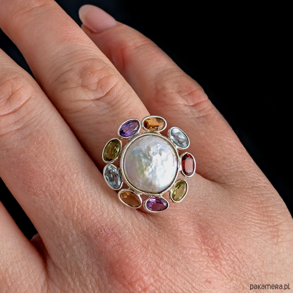 Unikat! Pierścień niczym bombonierka z cukiereczkami :) Niezwykle piękny, misterny, wykonany ze srebra pr. 925 oraz ciekawych kamieni: pięknej perły oraz kompozycji drobnych kamieni, które mają imitować płatki perłowego kwiatu. Bliżej wiosny! Mamy tu granat, topazy, peridoty, ametysty oraz topazy. Średnica całej kompozycji 21 mm. Rozmiar jubilerski mogę dopasować w zakresie ,16- 23. Ustawię odpowiedni, proszę o wiadomość. Waga 4,66 g. Wykonany przez dostawcę kamieni. Pierścień zostanie zapakowany w ozdobne pudełeczko.