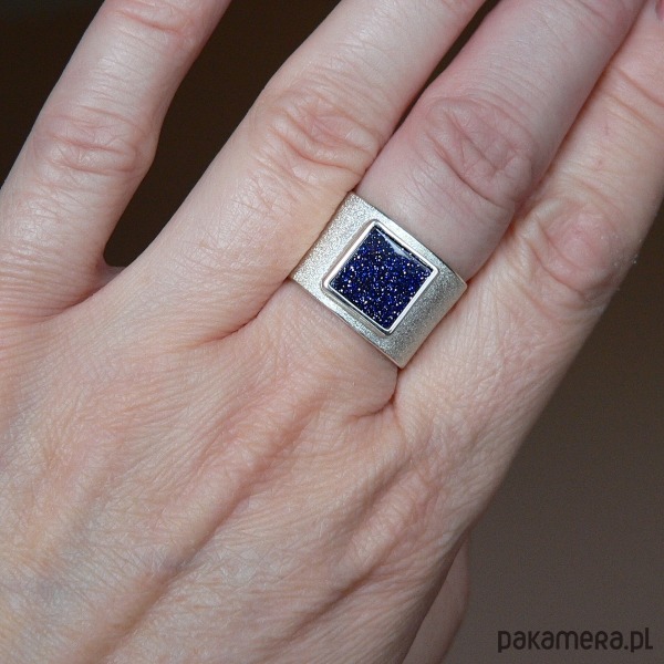 Szeroki pierścionek wykonany ze srebra i płytki efektownego kamienia zwanego nocą Kairu. Srebro piaskowane, detale polerowane. Szerokość obrączki 1,4 cm Wymiary kamienia-1/1 cm Pierścionek pasuje na palec w rozmiarze 17