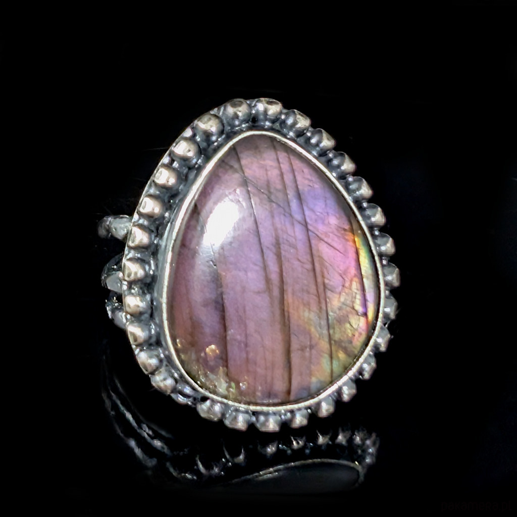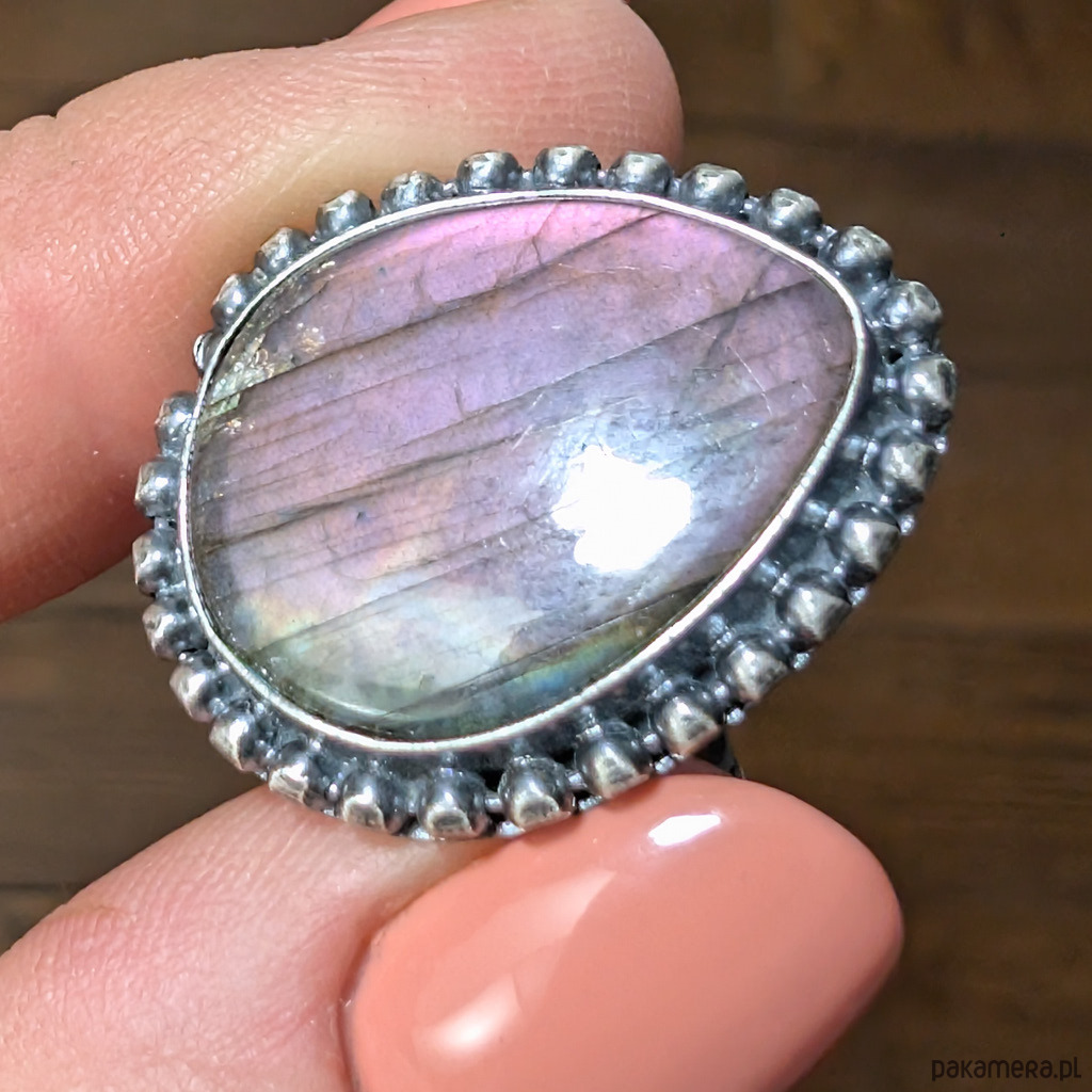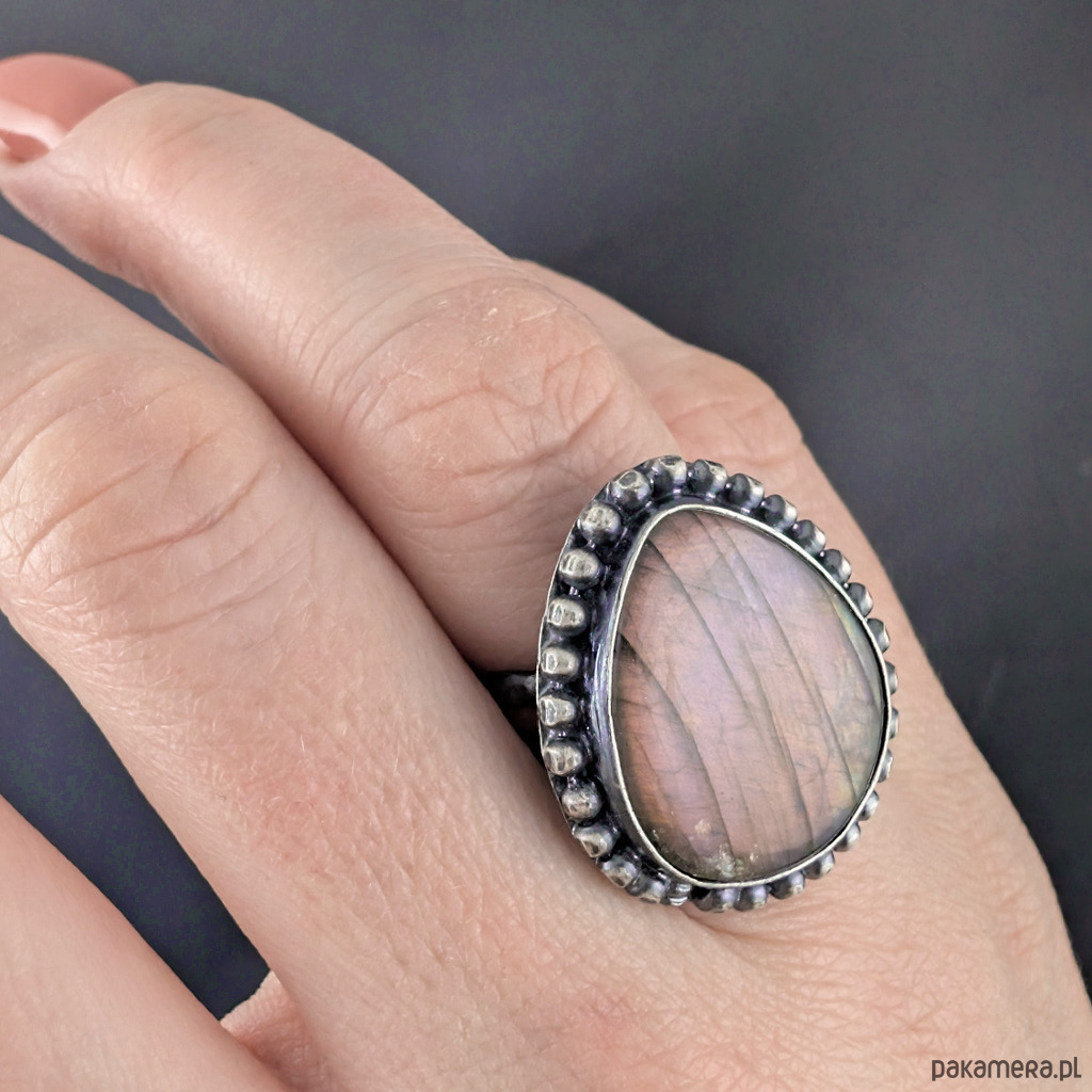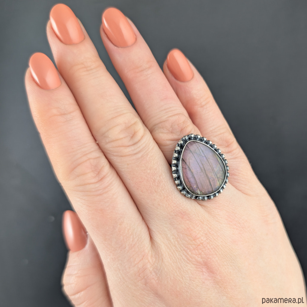 Pierścionek z oprawionym w oksydowane srebro próby 925 labradorytem o fioletowej tafli. Oprawa 27 x 22 mm, Rozmiar jubilerski 13, mogę powiekszyć do max 14, proszę napisać na jaki dopasować. Obrączka ma szerokość 13 mm. Waga 10 g. Pierścień zostanie wysłany w ozdobnym pudełeczku.