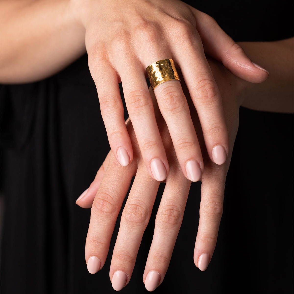 Obrączka jest szerokości 1,0 cm, można ją lekko dogiąć i odgiąć - dopasowując się do palca.