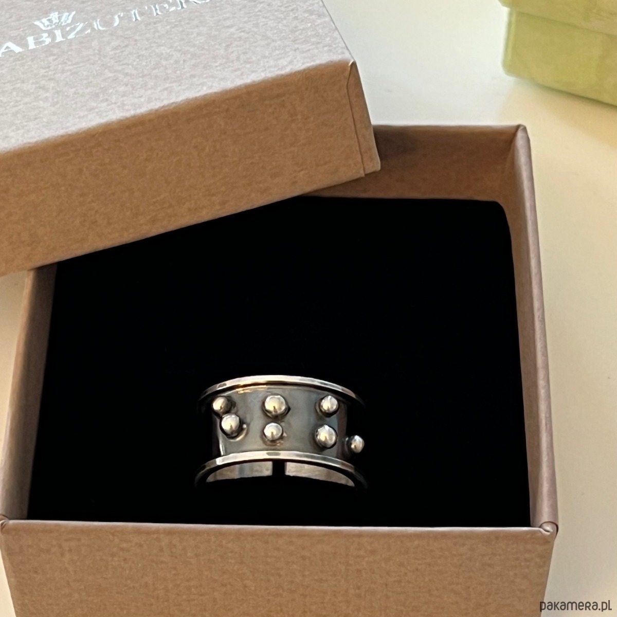 Obrączka jest szerokości 1,0 cm, można ją lekko dogiąć i odgiąć - dopasowując się do palca.
