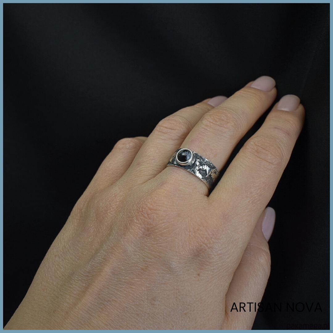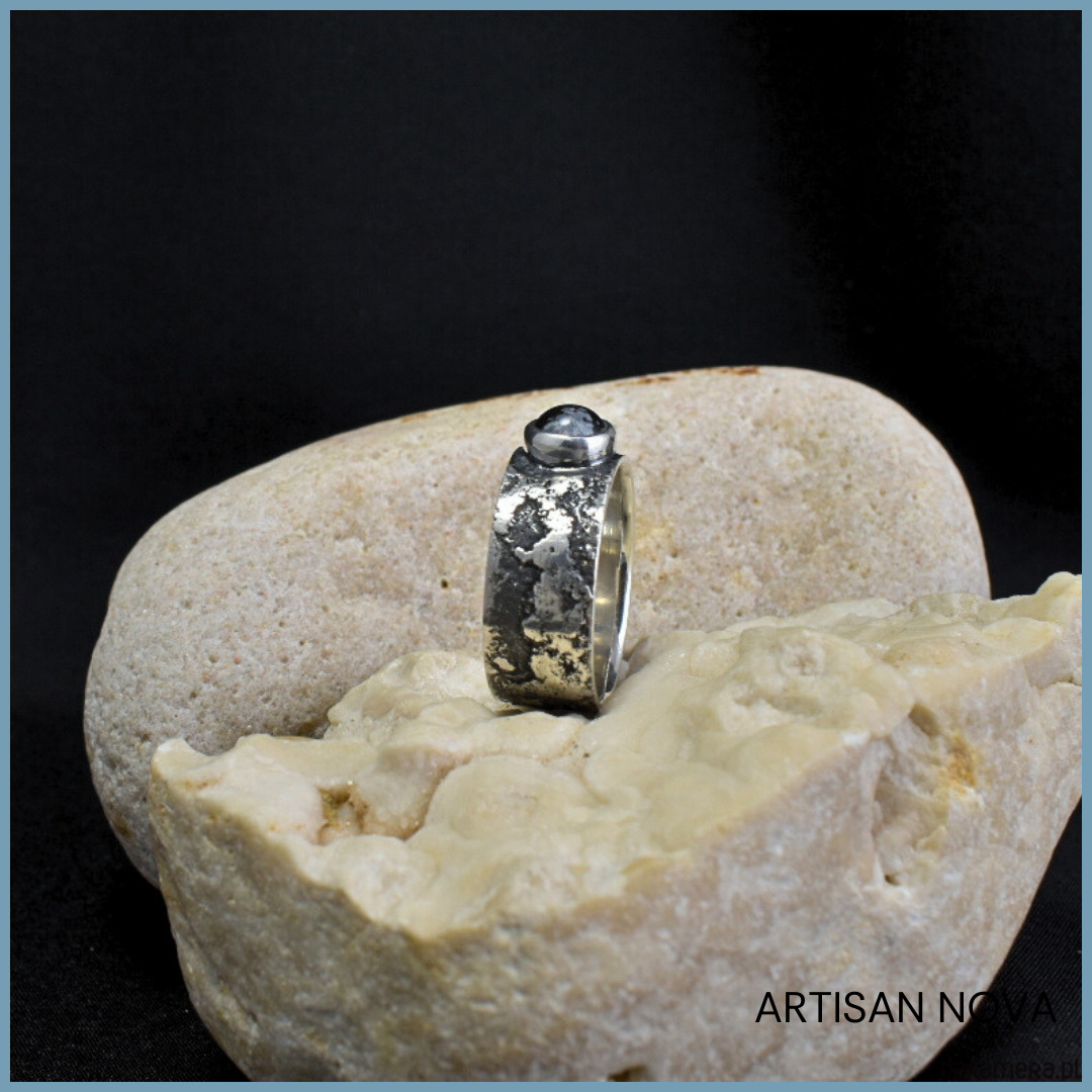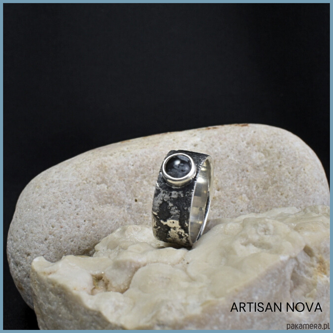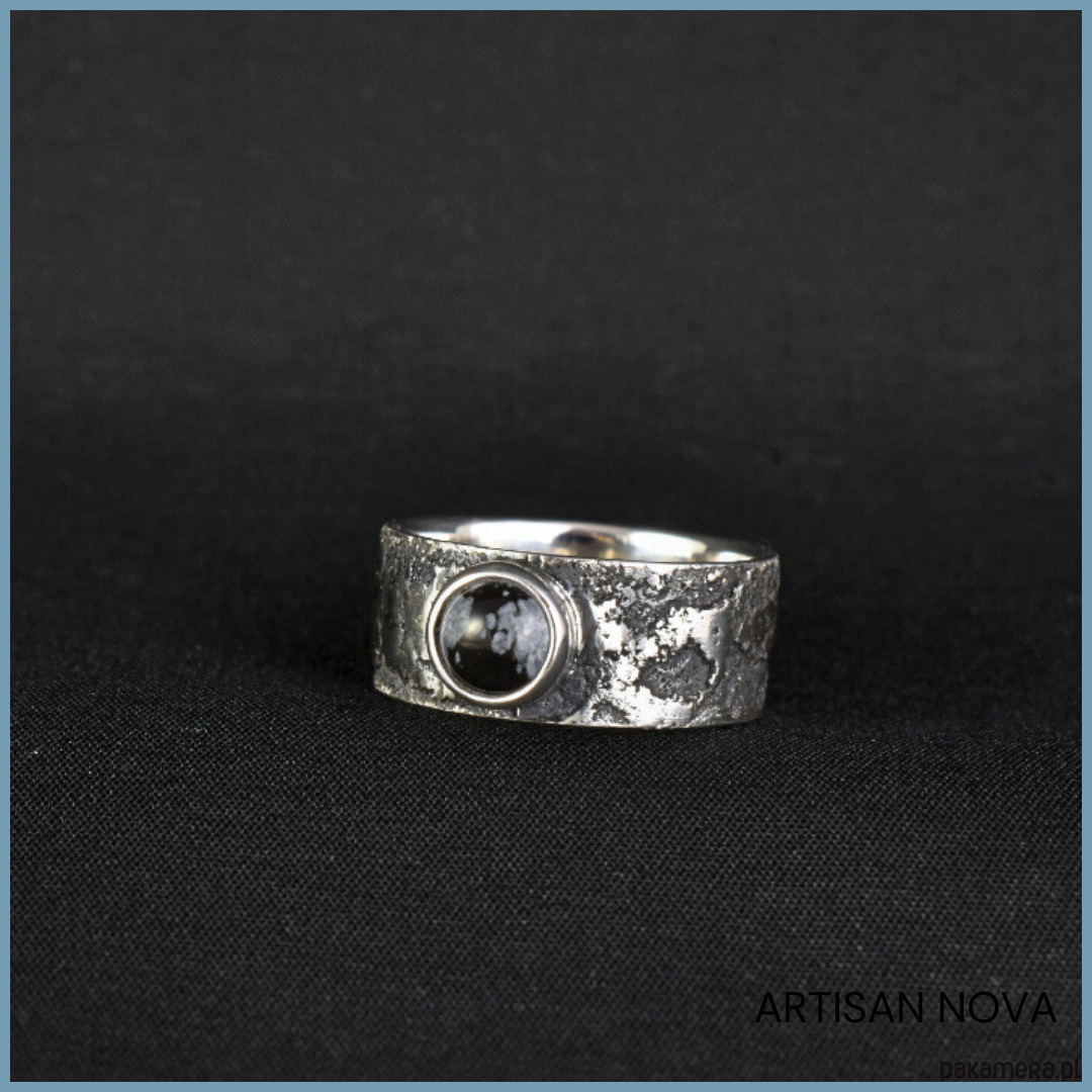 Ten ręcznie robiony pierścionek to wyrazisty unikat, który łączy siłę natury z pięknem rzemiosła. Pierścionek, wykonany ze srebra próby 925, ma formę szerokiej obrączki. Charakteryzuje go bardzo surowa, oksydowana faktura, która celowo przypomina powierzchnię wulkanicznej lawy. Kontrastem dla tej struktury jest obsydian śnieżny, którego mozaikowe kolory i wzory idealnie dopasowują się do surowej estetyki obrączki. W rezultacie uzyskano projekt z charakterem, który z pewnością podkreśli wyjątkowość w każdym detalu. Dzięki odważnemu połączeniu tekstur i zastosowaniu kamienia naturalnego, pierścionek jest doskonałym wyborem dla kobiet ceniących ponadczasowy styl, a także biżuterię z mocnym, autentycznym przesłaniem.