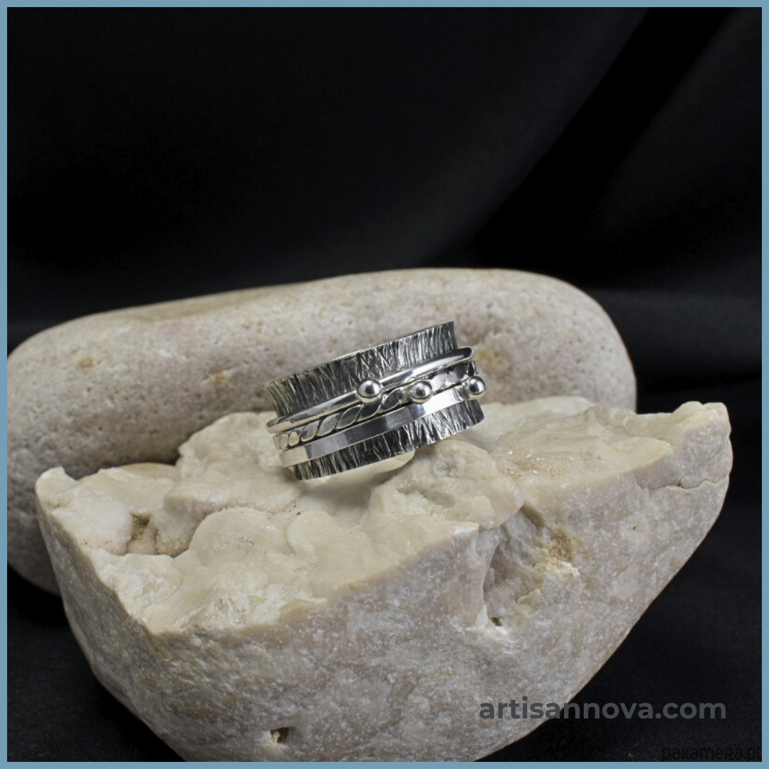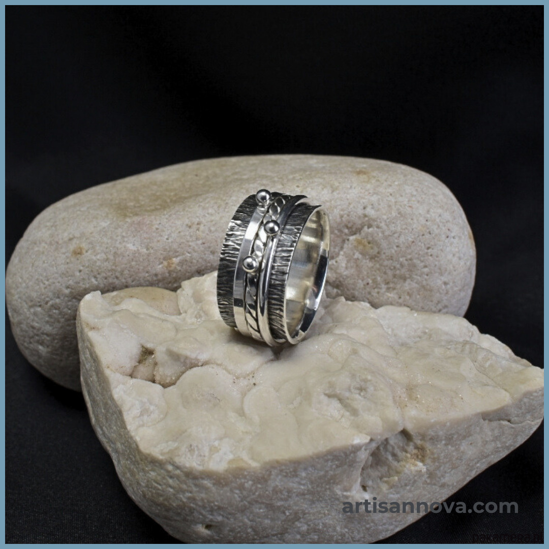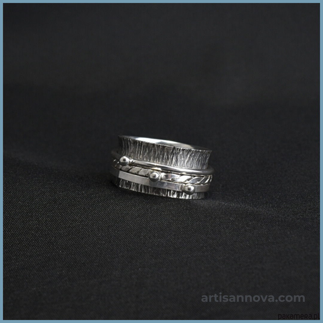 Na główną obrączkę nałożono trzy cienkie, ruchome obrączki. Każda z nich ma inną formę: gładką okrągłą, gładką płaską oraz płaską o delikatnie plecionym rysunku. Elementy te obracają się niezależnie, a drobne kuleczki umieszczone na każdej z nich wzmacniają wrażenia dotykowe i potęgują antystresowy charakter pierścionka.