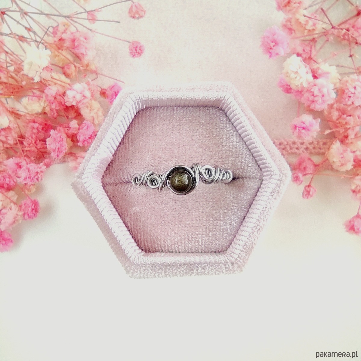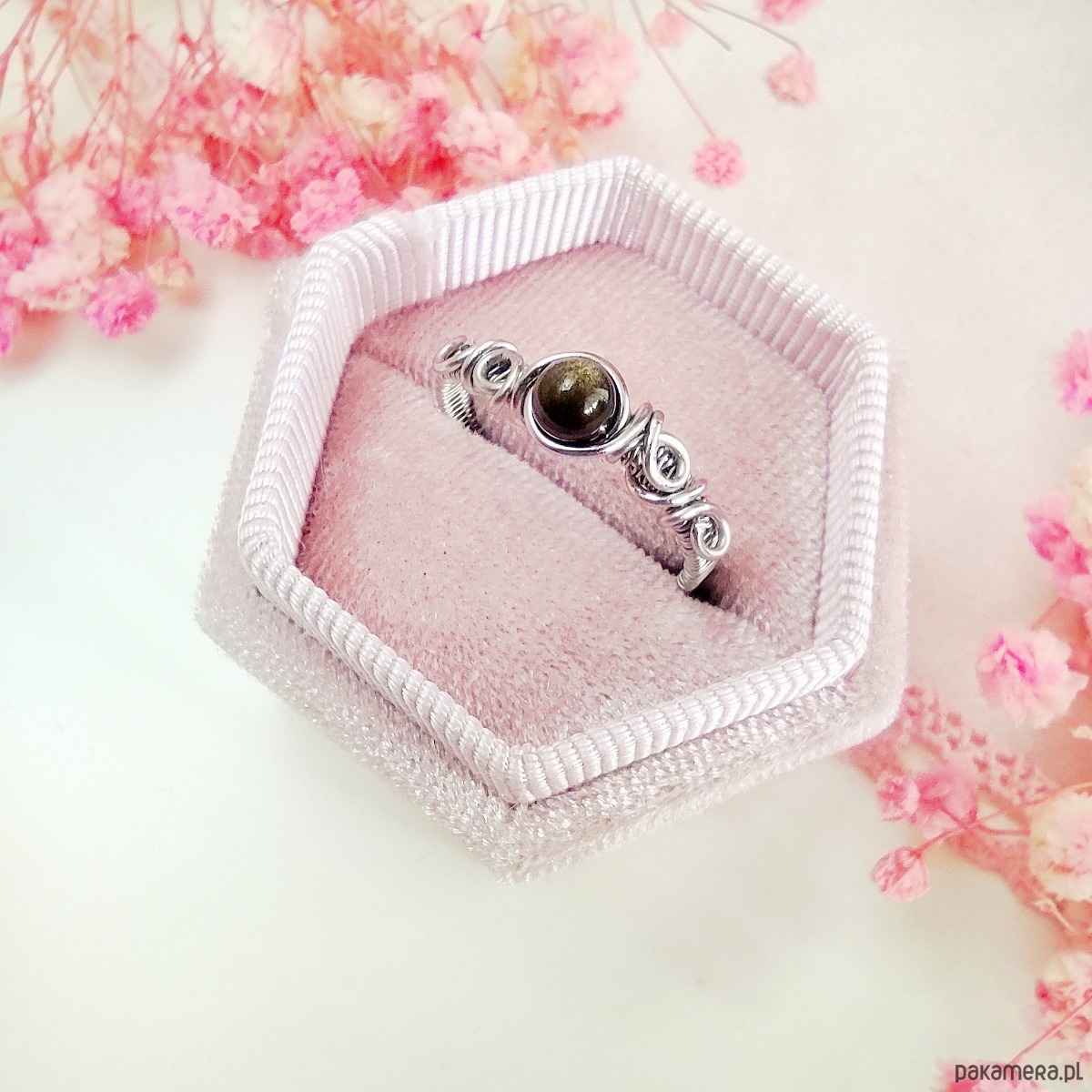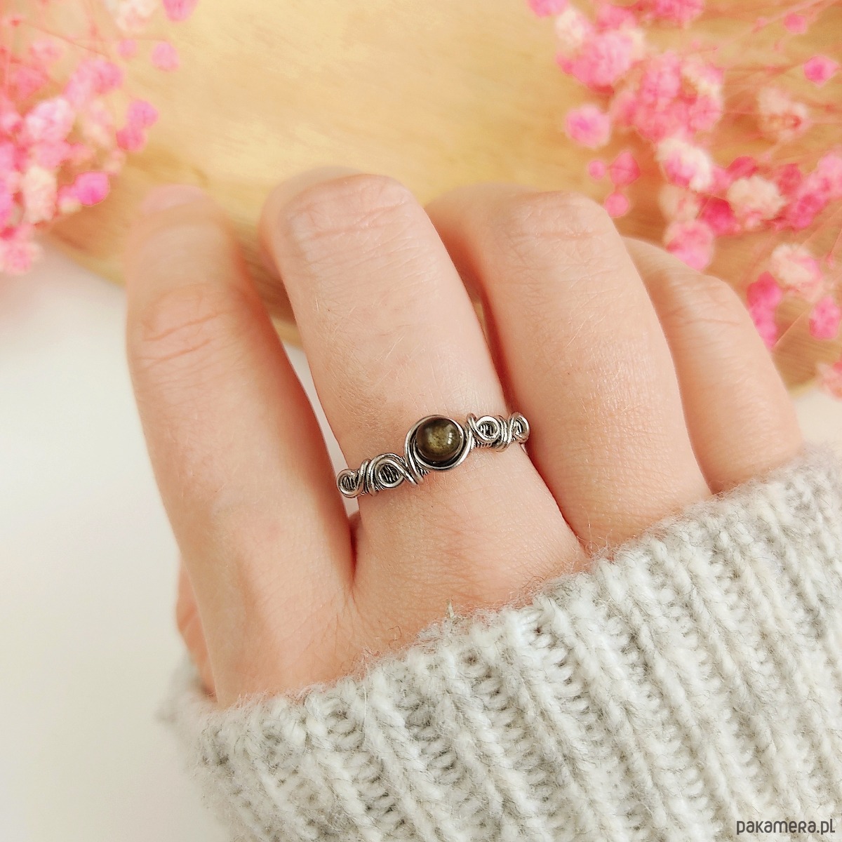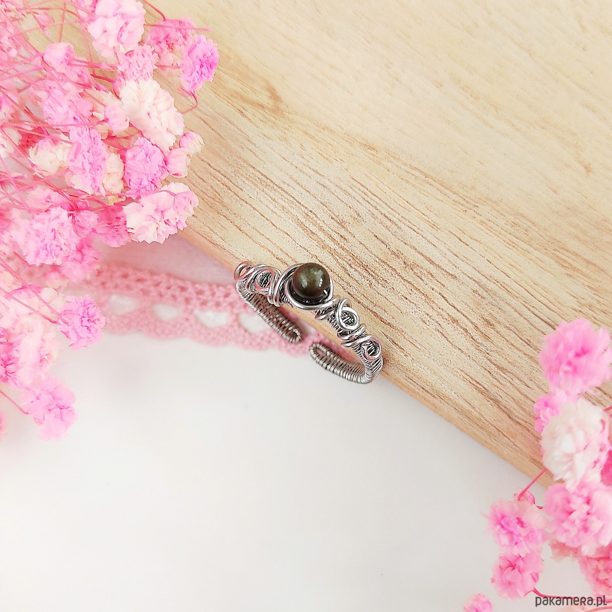 Pierścionek Obsydian złocisty ręcznie robiony. Wykonany techniką wire wrapping z drutów ze stali chirurgicznej.