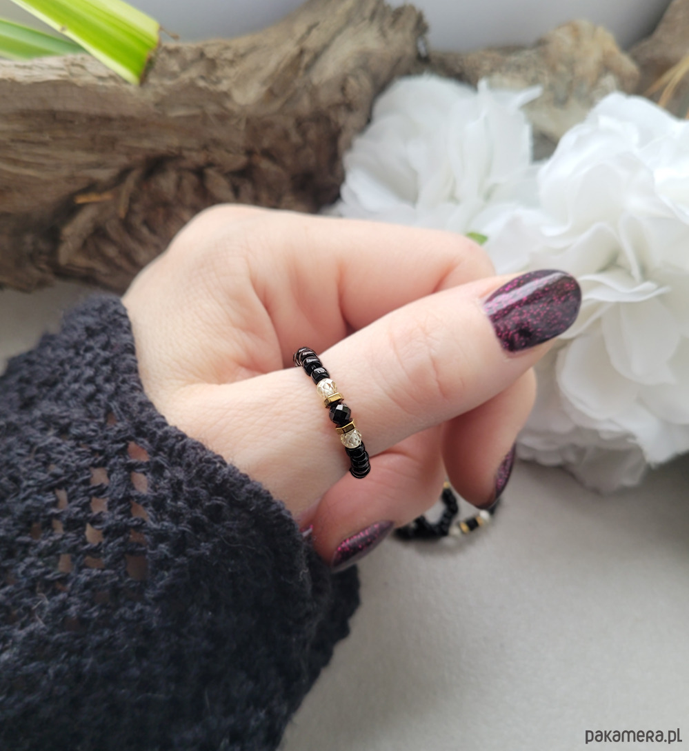 Piękny pierścionek elastyczny z Turmalinem, Hematytem w kolorze złota oraz Cyrkoniami.